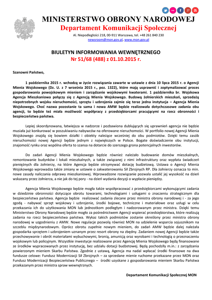 MINISTERSTWO OBRONY NARODOWEJ Departament Komunikacji Społecznej Al. Niepodległości 218, 00-911 Warszawa, tel. +48 261 840 230 [email protected], www.mon.gov.pl BIULETYN INFORMOWANIA WEWNĘTRZNEGO Nr 51/68 (488) z 01.10.2015 r. Szanowni Państwo, 1 października 2015 r. wchodzą w życie rozwiązania zawarte w ustawie z dnia 10 lipca 2015 r. o Agencji Mienia Wojskowego (Dz. U. z 7 września 2015 r., poz. 1322), które mają usprawnić i zoptymalizować proces gospodarowania powojskowym mieniem i zarządzanie wojskowymi kwaterami. 1 października br. Wojskowa Agencja Mieszkaniowa połączy się z Agencją Mienia Wojskowego. Budową żołnierskich mieszkań, sprzedażą niepotrzebnych wojsku nieruchomości, sprzętu i uzbrojenia zajmie się teraz jedna instytucja – Agencja Mienia Wojskowego. Choć nazwa pozostanie ta sama i nowa AMW będzie realizowała dotychczasowe zadania obu agencji, to będzie też miała możliwość współpracy z przedsiębiorcami pracującymi na rzecz obronności i bezpieczeństwa państwa. Lepiej skoordynowana, łatwiejsza w nadzorze i pozbawiona dublujących się uprawnień agencja nie będzie musiała już konkurować w poszukiwaniu nabywców na oferowane nieruchomości. W portfolio nowej Agencji Mienia Wojskowego znajdą się bowiem działki i obiekty należące wcześniej do obu podmiotów. Dzięki temu zasób nieruchomości nowej Agencji będzie jednym z największych w Polsce. Bogate doświadczenie obu instytucji, znajomość rynku oraz wspólna oferta to szansa na dotarcie do szerszego grona potencjalnych inwestorów. Do zadań Agencji Mienia Wojskowego będzie również należało budowanie domów mieszkalnych, remontowanie budynków i lokali mieszkalnych, a także związanej z nimi infrastruktury oraz wypłata świadczeń pieniężnych dla żołnierzy, na które Agencja będzie otrzymywać dotację budżetową. Ustawa o Agencji Mienia Wojskowego wprowadza także zmiany w ustawie o zakwaterowaniu Sił Zbrojnych RP. Dla żołnierzy oznacza to min. nowe zasady naliczania odprawy mieszkaniowej. Wprowadzone rozwiązanie pozwala ustalić jej wysokość na dzień wskazany przez żołnierza, a nie jak do tej pory - na dzień wydania decyzji o wypłacie pieniędzy. Agencja Mienia Wojskowego będzie mogła także współpracować z przedsiębiorcami wykonującymi zadania w dziedzinie obronności dotyczące obrotu towarami, technologiami i usługami o znaczeniu strategicznym dla bezpieczeństwa państwa. Agencja będzie realizować zadania zlecane przez ministra obrony narodowej i - za jego zgodą - nabywać sprzęt wojskowy i uzbrojenie, środki bojowe, techniczne i materiałowe oraz usługi w celu przekazania ich do użytkowania MON lub jednostkom podległym i nadzorowanym przez ministra. Dzięki temu Ministerstwo Obrony Narodowej będzie mogło za pośrednictwem Agencji wspierać przedsiębiorstwa, które realizują zadania na rzecz bezpieczeństwa państwa. Wykaz takich podmiotów zostanie określony przez ministra obrony narodowej w uzgodnieniu z AMW. Nowe regulacje pozwolą również MON na udzielenie wsparcia sojusznikom na szczeblu międzynarodowym. Oprócz obrotu zupełnie nowym mieniem, do zadań AMW będzie dalej należała gospodarka sprzętem i uzbrojeniem uznanym przez resort obrony na zbędny. Zadaniem nowej Agencji będzie także przechowywanie i obrót materiałami wybuchowymi, bronią, amunicją oraz wyrobami i technologią o przeznaczeniu wojskowym lub policyjnym. Wszystkie inwestycje realizowane przez Agencję Mienia Wojskowego będą finansowane ze środków wypracowanych przez instytucję, bez udziału dotacji budżetowej. Będą pochodziły m.in.: z zarządzania powierzonym mieniem Skarbu Państwa. Zgodnie z ustawą, Agencja ma nadal wpłacać środki finansowe na dwa fundusze celowe: Fundusz Modernizacji Sił Zbrojnych – za sprzedane mienie ruchome przekazane przez MON oraz Fundusz Modernizacji Bezpieczeństwa Publicznego – środki uzyskane z gospodarowania mieniem Skarbu Państwa przekazanym przez ministra spraw wewnętrznych. Departament Komunikacji Społecznej MON