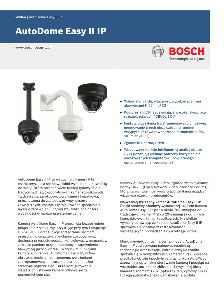 Wideo | AutoDome Easy II IP AutoDome Easy II IP www.boschsecurity.pl AutoDome Easy II IP to wytrzymała kamera PTZ charakteryzująca się niewielkimi wymiarami i łatwością instalacji, która posiada wiele funkcji typowych dla tradycyjnych szybkoobrotowych kamer kopułkowych. Ta dyskretna szybkoobrotowa kamera kopułkowa, przeznaczona do zastosowań wewnętrznych i zewnętrznych, została zaprojektowana specjalnie z myślą o zapewnieniu najwyższej funkcjonalności i wydajności w bardzo przystępnej cenie. Kamera AutoDome Easy II IP umożliwia bezpośrednie połączenie z siecią, wykorzystując przy tym kompresję H.264 i JPEG oraz funkcję zarządzania pasmem przesyłania, co pozwala wydajnie gospodarować dostępną przepustowością i kontrolować wymagania w zakresie pamięci przy jednoczesnym zapewnieniu najwyższej jakości obrazu. Wszystkimi funkcjami kamery kopułkowej AutoDome Easy II IP, w tym obrotem, pochyleniem, zoomem, położeniami zaprogramowanymi, trasami i alarmami można sterować poprzez sieć. Także konfigurowanie wszystkich ustawień kamery odbywa się za pośrednictwem sieci. u Wybór standardu, włącznie z wysokowydajnymi algorytmami H.264 i JPEG u Kompresja H.264 zapewniająca wysoką jakość przy rozdzielczościach 4CIF/D1 i CIF u Funkcja przesyłania trójstrumieniowego umożliwia generowanie trzech niezależnych strumieni wizyjnych IP (dwa równoczesne strumienie H.264 i strumień JPEG) u Zgodność z normą ONVIF u Wbudowane funkcje inteligentnej analizy obrazu (IVA) pozwalają uniknąć potrzeby korzystania z dedykowanych komputerów i powiązanego oprogramowania (opcjonalne) Kamery AutoDome Easy II IP są zgodne ze specyfikacją normy ONVIF (Open Network Video Interface Forum), która gwarantuje możliwość współdziałania urządzeń wizyjnych różnych producentów. Najważniejsze cechy kamer AutoDome Easy II IP Dzięki średnicy obudowy wynoszącej 10,2 cm kamera AutoDome Easy II IP jest o około 70% mniejsza od tradycyjnych kamer PTZ i o 20% mniejsza od innych kompaktowych kamer kopułkowych. Niewielkie wymiary sprawiają, że kamera AutoDome Easy II IP sprawdza się idealnie w zastosowaniach wymagających prowadzenia dyskretnego dozoru. Mimo niewielkich rozmiarów, w modelu AutoDome Easy II IP zastosowano najnowocześniejszą technologię oraz funkcje, które niezwykle rzadko spotyka się w kompaktowych kamerach PTZ. Zmienne prędkości obrotu i pochylenia oraz funkcja AutoPivot zapewniają optymalne sterowanie kamerą i podgląd na wszystkich poziomach zbliżenia. Ta wysokiej klasy kamera z zoomem 120x (optyczny 10x, cyfrowy 12x) i funkcją automatycznego ogniskowania została 2 | AutoDome Easy II IP wyposażona w najnowszą technologię cyfrowej obróbki obrazu, zapewniającą doskonałą czułość i rozdzielczość. Aż trudno sobie wyobrazić, że to niewielkie urządzenie może zapamiętać aż 99 zaprogramowanych przez użytkownika położeń oraz wiele trybów tras i automatycznych obrotów. Jedna kamera AutoDome Easy II IP zapewnia taki sam zasięg, jak cztery małe stałopozycyjne kamery kopułkowe, a jednocześnie jest o połowę tańsza od tradycyjnej kamery kopułkowej PTZ. Kompatybilność z całą linią produktów dozorowych firmy Bosch, w tym z krosownicami Allegiant i cyfrowymi rejestratorami Divar XF oraz pełną gamą urządzeń do transmisji obrazu przez sieci IP, pozwala na optymalne wykorzystanie środków inwestowanych w system zabezpieczeń. Kamera AutoDome Easy II IP jest ponadto urządzeniem prostym zarówno pod względem instalacji, jak i użytkowania. Dostępne są opcje montażu powierzchniowego, ściennego, wpuszczanego i na rurze. Dzięki powyższym możliwościom oraz zestawowi do instalacji na zewnątrz kamerę AutoDome Easy II IP można zamontować praktycznie w dowolnym miejscu. Przegląd systemu Kamera PTZ o wysokich parametrach z zoomem 120x Kamery PTZ AutoDome Easy II IP są wyposażone w kolorowy przetwornik CCD 1/4". Dzięki rozdzielczości 530 linii TV i czułości nawet poniżej 1,0 lx kamery serii AutoDome Easy II IP oferują doskonałą wydajność w wyjątkowo przystępnej cenie. Modele AutoDome Easy II IP mogą zapamiętać maksymalnie 99 położeń zaprogramowanych przez użytkownika, 1 zaprogramowaną trasę, 2 trasy zarejestrowane oraz 2 tryby automatycznego obrotu. Trasa może zostać zaprogramowana z maksymalnie 99 położeniami; istnieje również możliwość ustawienia czasu postoju pomiędzy zmianami położenia. Trasy zarejestrowane mogą odtwarzać do 15 minut dowolnych manewrów ręcznych wykonanych podczas zapisu, łącznie z obrotem, pochyleniem i zbliżeniem o określonym stopniu, a także innymi zmianami ustawień obiektywu. Dokładność odtwarzania zaprogramowanego obrotu i pochylenia wynosi ±0,1 stopnia, co zapewnia podgląd tej samej sceny za każdym razem. W kamerach AutoDome Easy II IP dostępne są prędkości obrotu/ pochylenia w zakresie od 0,1 do 120 stopni na sekundę. Kamera kopułkowa zapewnia maksymalną prędkość obrotu 360 stopni na sekundę oraz prędkość zmiany pochylenia między położeniami zaprogramowanymi rzędu 100 stopni na sekundę. Zakres pochylenia dla kamer AutoDome Easy II IP wynosi między 0 a 94 stopnie, a zakres obrotu ciągłego maksymalnie 360 stopni. Chronione patentem funkcje AutoScaling (proporcjonalnego zoomu) i AutoPivot (automatycznego obrotu i zmiany pochylenia kamery) zapewniają optymalne sterowanie obrazem. Wyjątkowo wydajne kodowanie H.264 Dzięki zaawansowanemu nadajnikowi wykorzystującemu algorytm H.264 kamery AutoDome Easy II IP umożliwiają tworzenie strumienia wizyjnego o jakości DVD przy bardzo niskiej przepływności danych. Zastosowanie kodowania H.264, funkcji zarządzania pasmem przesyłania oraz multicastingu minimalizuje wymaganą szerokość pasma i zapotrzebowanie na pamięć masową, co pozwala znacznie ograniczać koszty. Kamery AutoDome Easy II IP umożliwiają korzystanie z rozdzielczości 4CIF i CIF przy cz