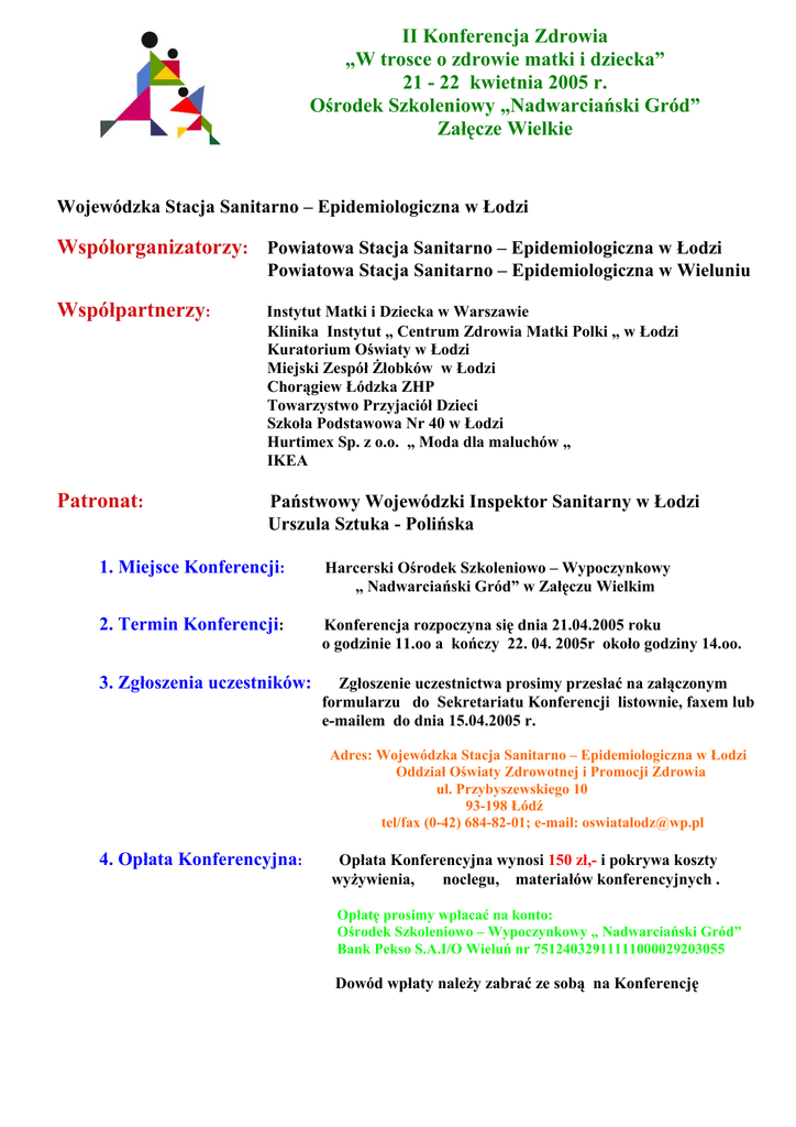 II Konferencja Zdrowia „W trosce o zdrowie matki i dziecka” 21 - 22 kwietnia 2005 r. Ośrodek Szkoleniowy „Nadwarciański Gród” Załęcze Wielkie Wojewódzka Stacja Sanitarno – Epidemiologiczna w Łodzi Współorganizatorzy: Powiatowa Stacja Sanitarno – Epidemiologiczna w Łodzi Powiatowa Stacja Sanitarno – Epidemiologiczna w Wieluniu Współpartnerzy: Instytut Matki i Dziecka w Warszawie Klinika Instytut „ Centrum Zdrowia Matki Polki „ w Łodzi Kuratorium Oświaty w Łodzi Miejski Zespół Żłobków w Łodzi Chorągiew Łódzka ZHP Towarzystwo Przyjaciół Dzieci Szkoła Podstawowa Nr 40 w Łodzi Hurtimex Sp. z o.o. „ Moda dla maluchów „ IKEA Patronat: Państwowy Wojewódzki Inspektor Sanitarny w Łodzi Urszula Sztuka - Polińska 1. Miejsce Konferencji: Harcerski Ośrodek Szkoleniowo – Wypoczynkowy „ Nadwarciański Gród” w Załęczu Wielkim 2. Termin Konferencji: Konferencja rozpoczyna się dnia 21.04.2005 roku o godzinie 11.oo a kończy 22. 04. 2005r około godziny 14.oo. 3. Zgłoszenia uczestników: Zgłoszenie uczestnictwa prosimy przesłać na załączonym formularzu do Sekretariatu Konferencji listownie, faxem lub e-mailem do dnia 15.04.2005 r. Adres: Wojewódzka Stacja Sanitarno – Epidemiologiczna w Łodzi Oddział Oświaty Zdrowotnej i Promocji Zdrowia ul. Przybyszewskiego 10 93-198 Łódź tel/fax (0-42) 684-82-01; e-mail: [email protected] 4. Opłata Konferencyjna: Opłata Konferencyjna wynosi 150 zł,- i pokrywa koszty wyżywienia, noclegu, materiałów konferencyjnych . Opłatę prosimy wpłacać na konto: Ośrodek Szkoleniowo – Wypoczynkowy „ Nadwarciański Gród” Bank Pekso S.A.I/O Wieluń nr 75124032911111000029203055 Dowód wpłaty należy zabrać ze sobą na Konferencję II Konferencja Zdrowia „W trosce o zdrowie matki i dziecka” 21 - 22 kwietnia 2005 r. Ośrodek Szkoleniowy „Nadwarciański Gród” Załęcze Wielkie Wstępny Program 21 kwietnia 2005 roku, czwartek 11.oo – 12.oo Uroczyste otwarcie Konferencji Wystąpienia: Głównego Inspektora Sanitarnego, Dyrektora Departamentu Promocji Zdrowia i Oświaty Zdrowotnej , Przedstawiciela Światowej Organizacji Zdrowia, Zaproszonych Gości. 12.oo - 12.15 Wykład inauguracyjny Państwowy Wojewódzki Inspektor Sanitarny w Łodzi Urszula Sztuka – Polińska 12.15 – 12. 30 12.30 – 12. 40 Występ zespołu ze Szkoły Podstawowej nr 40 z Łodzi. Prezentacja dorobku szkoły w zakresie relacji szkoła – dziecko – matka. 13.oo Obiad sesja plenarna 15.oo - 16.30 Prezentacje dotyczące aspektów medycznych i psychologicznych problematyki zdrowia matki i dziecka w zakresie występowania zaburzeń zdrowotnych i możliwości zapobiegania. 16.30 – 16.45 16.45 – 17.oo przerwa na kawę pokaz mody dziecięcej sesja plenarna c.d. 17.oo – 18.oo 19.oo Kolacja 22 kwietnia 2005 roku, piątek 8.oo 9.oo – 10.oo Śniadanie sesja plenarna Prezentacje dotyczące aspektów wychowawczych i profilaktycznych w procesie rozwoju i wychowania małego dziecka i relacji emocjonalnych z matką. 10.oo – 10.30 10.30. – 10.45 10.45 - 11.30 Prezentacja bezpiecznych zabawek i wystawa mebli przyjaznych małemu dziecku. przerwa na kawę 11.30 – 12.oo 12.oo – 12.30 Dyskusja Podsumowanie i zakończenie Konferencji 12.30 Obiad sesja plenarna c.d II Konferencja Zdrowia „W trosce o zdrowie matki i dziecka” 21 - 22 kwietnia 2005 r. Ośrodek Szkoleniowy „Nadwarciański Gród” Załęcze Wielkie