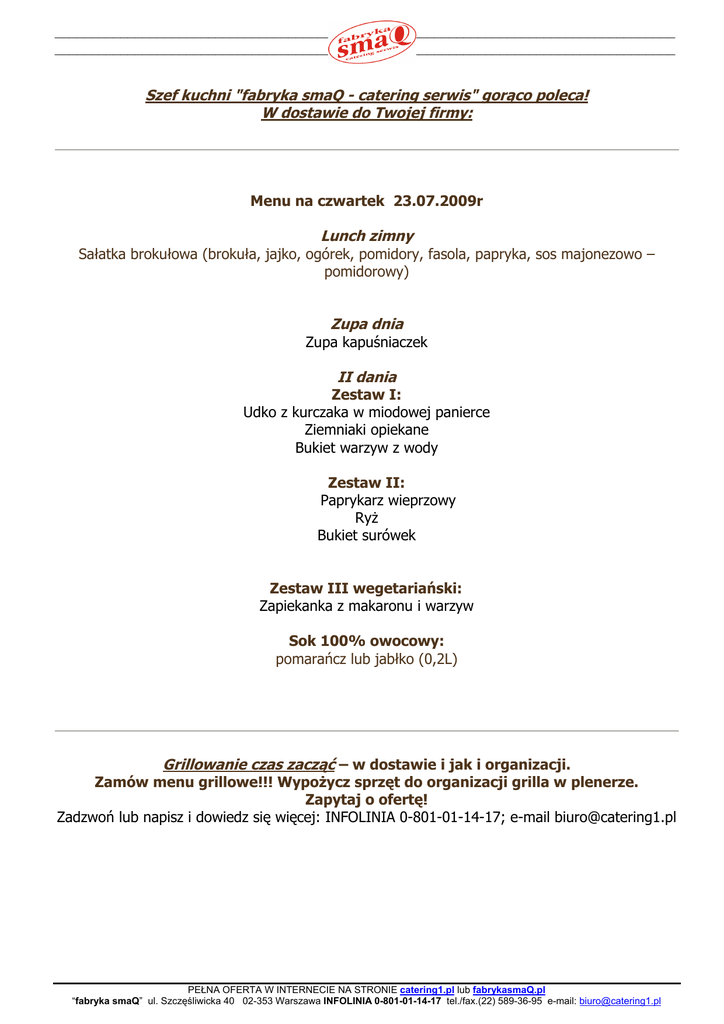 _____________________________________________________________________________________ _____________________________________________________________________________________ Szef kuchni "fabryka smaQ - catering serwis" gorąco poleca! W dostawie do Twojej firmy: Menu na czwartek 23.07.2009r Lunch zimny Sałatka brokułowa (brokuła, jajko, ogórek, pomidory, fasola, papryka, sos majonezowo – pomidorowy) Zupa dnia Zupa kapuśniaczek II dania Zestaw I: Udko z kurczaka w miodowej panierce Ziemniaki opiekane Bukiet warzyw z wody Zestaw II: Paprykarz wieprzowy Ryż Bukiet surówek Zestaw III wegetariański: Zapiekanka z makaronu i warzyw Sok 100% owocowy: pomarańcz lub jabłko (0,2L) Grillowanie czas zacząć – w dostawie i jak i organizacji. Zamów menu grillowe!!! Wypożycz sprzęt do organizacji grilla w plenerze. Zapytaj o ofertę! Zadzwoń lub napisz i dowiedz się więcej: INFOLINIA 0-801-01-14-17; e-mail [email protected] PEŁNA OFERTA W INTERNECIE NA STRONIE catering1.pl lub fabrykasmaQ.pl “fabryka smaQ” ul. Szczęśliwicka 40 02-353 Warszawa INFOLINIA 0-801-01-14-17 tel./fax.(22) 589-36-95 e-mail: [email protected]