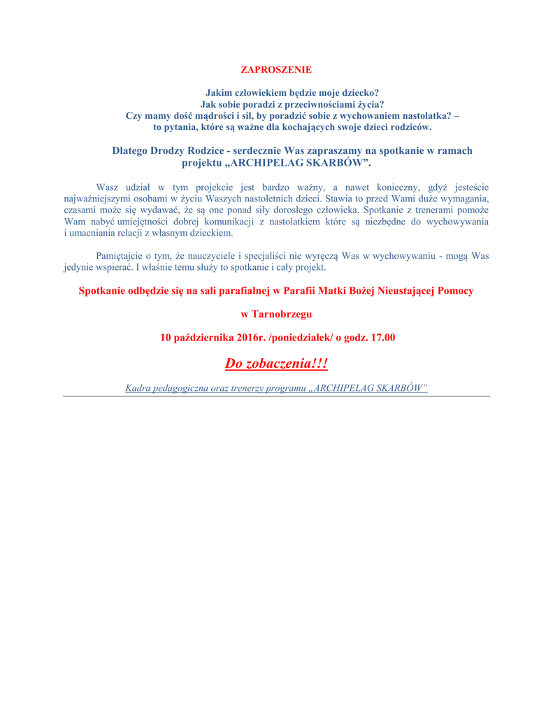 ZAPROSZENIE Jakim człowiekiem będzie moje dziecko? Jak sobie poradzi z przeciwnościami życia? Czy mamy dość mądrości i sił, by poradzić sobie z wychowaniem nastolatka? – to pytania, które są ważne dla kochających swoje dzieci rodziców. Dlatego Drodzy Rodzice - serdecznie Was zapraszamy na spotkanie w ramach projektu „ARCHIPELAG SKARBÓW”. Wasz udział w tym projekcie jest bardzo ważny, a nawet konieczny, gdyż jesteście najważniejszymi osobami w życiu Waszych nastoletnich dzieci. Stawia to przed Wami duże wymagania, czasami może się wydawać, że są one ponad siły dorosłego człowieka. Spotkanie z trenerami pomoże Wam nabyć umiejętności dobrej komunikacji z nastolatkiem które są niezbędne do wychowywania i umacniania relacji z własnym dzieckiem. Pamiętajcie o tym, że nauczyciele i specjaliści nie wyręczą Was w wychowywaniu - mogą Was jedynie wspierać. I właśnie temu służy to spotkanie i cały projekt. Spotkanie odbędzie się na sali parafialnej w Parafii Matki Bożej Nieustającej Pomocy w Tarnobrzegu 10 października 2016r. /poniedziałek/ o godz. 17.00 Do zobaczenia!!! Kadra pedagogiczna oraz trenerzy programu „ARCHIPELAG SKARBÓW”