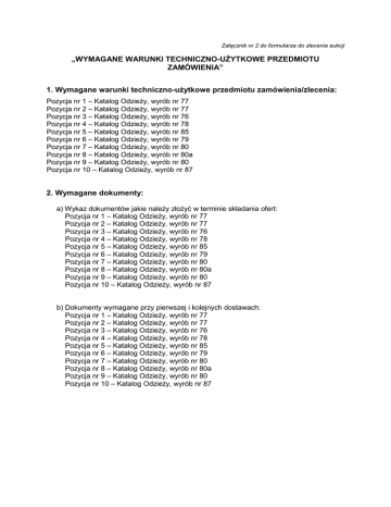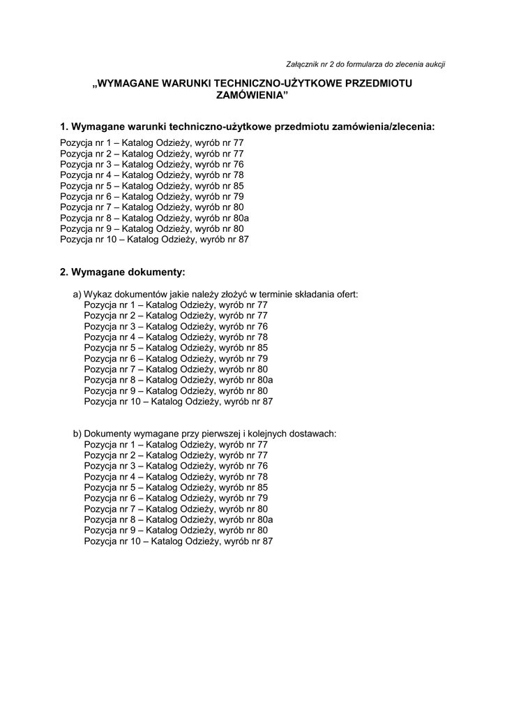 Załącznik nr 2 do formularza do zlecenia aukcji „WYMAGANE WARUNKI TECHNICZNO-UŻYTKOWE PRZEDMIOTU ZAMÓWIENIA” 1. Wymagane warunki techniczno-użytkowe przedmiotu zamówienia/zlecenia: Pozycja nr 1 – Katalog Odzieży, wyrób nr 77 Pozycja nr 2 – Katalog Odzieży, wyrób nr 77 Pozycja nr 3 – Katalog Odzieży, wyrób nr 76 Pozycja nr 4 – Katalog Odzieży, wyrób nr 78 Pozycja nr 5 – Katalog Odzieży, wyrób nr 85 Pozycja nr 6 – Katalog Odzieży, wyrób nr 79 Pozycja nr 7 – Katalog Odzieży, wyrób nr 80 Pozycja nr 8 – Katalog Odzieży, wyrób nr 80a Pozycja nr 9 – Katalog Odzieży, wyrób nr 80 Pozycja nr 10 – Katalog Odzieży, wyrób nr 87 2. Wymagane dokumenty: a) Wykaz dokumentów jakie należy złożyć w terminie składania ofert: Pozycja nr 1 – Katalog Odzieży, wyrób nr 77 Pozycja nr 2 – Katalog Odzieży, wyrób nr 77 Pozycja nr 3 – Katalog Odzieży, wyrób nr 76 Pozycja nr 4 – Katalog Odzieży, wyrób nr 78 Pozycja nr 5 – Katalog Odzieży, wyrób nr 85 Pozycja nr 6 – Katalog Odzieży, wyrób nr 79 Pozycja nr 7 – Katalog Odzieży, wyrób nr 80 Pozycja nr 8 – Katalog Odzieży, wyrób nr 80a Pozycja nr 9 – Katalog Odzieży, wyrób nr 80 Pozycja nr 10 – Katalog Odzieży, wyrób nr 87 b) Dokumenty wymagane przy pierwszej i kolejnych dostawach: Pozycja nr 1 – Katalog Odzieży, wyrób nr 77 Pozycja nr 2 – Katalog Odzieży, wyrób nr 77 Pozycja nr 3 – Katalog Odzieży, wyrób nr 76 Pozycja nr 4 – Katalog Odzieży, wyrób nr 78 Pozycja nr 5 – Katalog Odzieży, wyrób nr 85 Pozycja nr 6 – Katalog Odzieży, wyrób nr 79 Pozycja nr 7 – Katalog Odzieży, wyrób nr 80 Pozycja nr 8 – Katalog Odzieży, wyrób nr 80a Pozycja nr 9 – Katalog Odzieży, wyrób nr 80 Pozycja nr 10 – Katalog Odzieży, wyrób nr 87