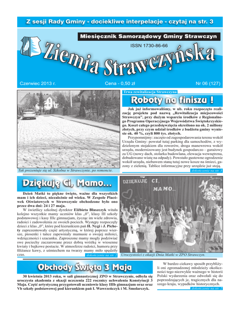 Z sesji Rady Gminy - dociekliwe interpelacje - czytaj na str. 3 Czerwiec 2013 r. Nr 06 (127) Trwa rewitalizacja Strawczyna Roboty na finiszu ! Tak prezentuje się ul. Szkolna w Strawczynie, po remoncie. Jak już informowaliśmy, w ub. roku rozpoczęto realizację projektu pod nazwą „Rewitalizacja miejscowości Strawczyn”, przy dużym wsparciu środków z Regionalnego Programu Operacyjnego Województwa Świętokrzyskiego. Koszt całego przedsięwzięcia określono na ok. 2 miliony złotych, przy czym udział środków z budżetu gminy wyniesie ok. 40 %, czyli 800 tys. złotych. Przypomnijmy: zaczęto od zagospodarowania terenu wokół Urzędu Gminy: powstał tutaj parking dla samochodów, z wydzielonym stojakiem dla rowerów, droga manewrowa wokół urzędu, modernizowany jest budynek gospodarczo – garażowy za UG (nowy dach, stolarka budowlana, elewacja wewnętrzna, dobudowano wiatę na odpady). Powstało gustowne ogrodzenie wokół urzędu, niebawem staną tutaj nowe kosze na śmieci, gazony z zielenią. Tablice informacyjne przy urzędzie już stoją. dokończenie na str. 3 Dziękuję Ci, Mamo… Dzień Matki to piękne święto, ważne dla wszystkich mam i ich dzieci, niezależnie od wieku. W Zespole Placówek Oświatowych w Strawczynie obchodzone było ono przez dwa dni: 24 i 27 maja. W świetlicy szkolnej dyrektor Elżbieta Błaszczyk witała kolejno wszystkie mamy uczniów klas „0”, klasy III szkoły podstawowej i kasy IIIc gimnazjum, życząc im wiele zdrowia, radości i zadowolenia ze swoich pociech. Występy rozpoczęły dzieci z klas „0”, które pod kierunkiem pań H. Nygi i J. Pichety zaprezentowały część artystyczną, w której poprzez wiersze, piosenki i tańce zapewniały mamusie o swojej miłości, wdzięczności i szacunku. Zaproszone mamy mogły podziwiać swe pociechy zaczarowane przez dobrą wróżkę w wiosenne kwiaty i bajkowe postacie. W atmosferze radości, humoru przy filiżance kawy, z uśmiechem na twarzy mamy miło spędziły czas. dokończenie na str. 2 Uroczystości z okazji Dnia Matki w ZPO Strawczyn. Obchody Święta 3 Maja 30 kwietnia 2013 roku, w sali gimnastycznej ZPO w Strawczynie, odbyła się uroczysta akademia z okazji uczczenia 222 rocznicy uchwalenia Konstytucji 3 Maja. Część artystyczną przygotowali uczniowie klasy IIIb gimnazjum oraz oraz Vb szkoły podstawowej pod kierunkiem pań I. Wawrzeńczyk i M. Smolarczyk. W bardzo ciekawy sposób przybliżyli oni zgromadzonej młodzieży okoliczności tego niezwykle ważnego w historii Polski wydarzenia oraz odwołali się do poprzedzających je, tragicznych dla naszego kraju, wypadków historycznych. dokończenie na str. 2 Obchody Święta 3 Maja dokończenie ze str. 1 Nastrój skupienia, powagi i zadumy budowały także występy szkolnego chóru, kierowanego przez p. A. Bazalińską. Uczniowie szkoły podstawowej i gimnazjum w ciszy i z uwagą uczestniczyli w akademii, a po jej zakończeniu nagrodzili występujących gromkimi brawami. Dyrektor, Elżbieta Błaszczyk podziękowała uczniom i ich opiekunom za przygotowanie przepięknej lekcji historii i wyraziła przekonanie, że każdy uczeń wyniósł z niej coś wartościowego, poszerzył swoją wiedzę i zasiał w swym sercu ziarenko patriotyzmu. Plan w gminie od 2005 roku Miejscowy plan zagospodarowania przestrzennego obowiązuje w gminie Strawczyn od 2005 r. Od momentu obowiązywania planu, na wnioski zainteresowanych osób, trwały dalsze prace polegające na wprowadzeniu zmian do planu. Zaktualizowany plan obowiązuje od maja b.r. W dalszym ciągu właściciele nieruchomości zgłaszają potrzeby przekształceń swoich terenów na tereny budowlane. Mając na uwadze duże koszty z tym związane, ponoszone przez gminę (uzbrajanie nowych terenów inwestycyjnych), gmina podjęła działania mające na celu sporządzenie analizy wprowadzania zmian do planu. Z dokumentu tego wynikało będzie jak duże rezerwy terenów budowlanych pozostały niezagospodarowane i czy istnieje konieczność wprowadzania nowych terenów inwestycyjnych. Na podstawie opracowanej analizy podjęte zostaną dalsze działania. Zaproszenia na festyny w Oblęgórze i Oblęgorku Stowarzyszanie Sołectwa Oblęgór „Skałka” i Rada Sołecka zapraszają na: OBLĘGÓRSKI WIECZÓR KUPAŁY w niedzielę 30 czerwca br. od godz.:1600, na Skałce. W programie między innymi: występy zespołów instrumentalno wokalnych, konkursy, gry i zabawy *** 23 czerwca br. zapraszamy na „FESTYN ŚWIĘTOJAŃSKI”, organizowany przez Stowarzyszenie Kobiet „Jagienka” i OSP. W programie wiele atrakcji dla dzieci i dorosłych. Początek festynu godz.15.00 na terenie remizy OSP w Oblęgorku. Po części oficjalnej i artystycznej – tańce do północy. 2 Uczestnicy uroczystości w ZPO w Strawczynie. Dziękuję Ci, Mamo… dokończenie ze str. 1 Na zakończenie uroczystości przy dźwiękach muzyki Richarda Clayderman’a otrzymały od swoich dzieci własnoręcznie wykonany upominek – torebkę w kształcie biedronki. 27 maja, w świetlicy szkolnej, odbyły się dwie kolejne uroczystości z okazji z okazji Dnia Matki, przygotowane przez uczniów szkoły podstawowej i gimnazjum wraz z opiekunami. Na tle scenerii z wielkim bukietem kwiatów, pod hasłem: „DZIĘKUJĘ CI, MAMO…” dzieci chciały w szczególny sposób okazać wdzięczność swoim mamom. Ze wzruszeniem słuchały one wierszy w języku polskim i angielskim, bawiły się przy prezentowanych scenkach humorystycznych i tańcach. Uczniowie szkoły podstawowej, pod kierunkiem p. T. Woźniak, zakończyli akademię wspólnym odśpiewaniem „100 lat” z akompaniamentem klarnetu, składaniem życzeń i wręczaniem prezentów mamom oraz słodkim poczęstunkiem. ZIEMIA STRAWCZYŃSKA Gimnazjaliści zaprosili swoje mamy na wieczorek poetycki, podczas którego w bardzo dojrzały już sposób wyrażali wdzięczność i miłość poprzez recytację pełnych refleksji, nastrojowych wierszy. Za serce chwytały także wokalne 