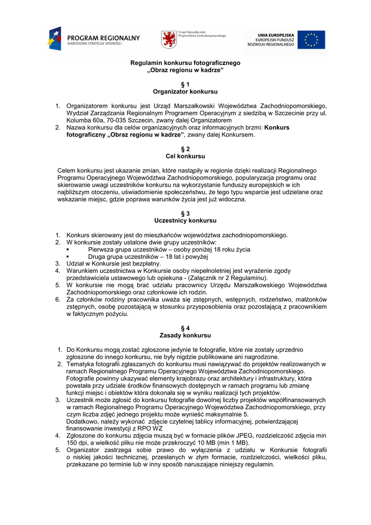 Regulamin konkursu fotograficznego „Obraz regionu w kadrze” §1 Organizator konkursu 1. Organizatorem konkursu jest Urząd Marszałkowski Województwa Zachodniopomorskiego, Wydział Zarządzania Regionalnym Programem Operacyjnym z siedzibą w Szczecinie przy ul. Kolumba 60a, 70-035 Szczecin, zwany dalej Organizatorem 2. Nazwa konkursu dla celów organizacyjnych oraz informacyjnych brzmi: Konkurs fotograficzny „Obraz regionu w kadrze”, zwany dalej Konkursem. §2 Cel konkursu Celem konkursu jest ukazanie zmian, które nastąpiły w regionie dzięki realizacji Regionalnego Programu Operacyjnego Województwa Zachodniopomorskiego, popularyzacja programu oraz skierowanie uwagi uczestników konkursu na wykorzystanie funduszy europejskich w ich najbliŜszym otoczeniu, uświadomienie społeczeństwu, Ŝe tego typu wsparcie jest udzielane oraz wskazanie miejsc, gdzie poprawa warunków Ŝycia jest juŜ widoczna. §3 Uczestnicy konkursu 1. Konkurs skierowany jest do mieszkańców województwa zachodniopomorskiego. 2. W konkursie zostały ustalone dwie grupy uczestników: Pierwsza grupa uczestników – osoby poniŜej 18 roku Ŝycia Druga grupa uczestników – 18 lat i powyŜej 3. Udział w Konkursie jest bezpłatny. 4. Warunkiem uczestnictwa w Konkursie osoby niepełnoletniej jest wyraŜenie zgody przedstawiciela ustawowego lub opiekuna - (Załącznik nr 2 Regulaminu). 5. W konkursie nie mogą brać udziału pracownicy Urzędu Marszałkowskiego Województwa Zachodniopomorskiego oraz członkowie ich rodzin. 6. Za członków rodziny pracownika uwaŜa się zstępnych, wstępnych, rodzeństwo, małŜonków zstępnych, osobę pozostającą w stosunku przysposobienia oraz pozostającą z pracownikiem w faktycznym poŜyciu. §4 Zasady konkursu 1. Do Konkursu mogą zostać zgłoszone jedynie te fotografie, które nie zostały uprzednio zgłoszone do innego konkursu, nie były nigdzie publikowane ani nagrodzone. 2. Tematyka fotografii zgłaszanych do konkursu musi nawiązywać do projektów realizowanych w ramach Regionalnego Programu Operacyjnego Województwa Zachodniopomorskiego. Fotografie powinny ukazywać elementy krajobrazu oraz architektury i infrastruktury, która powstała przy udziale środków finansowych dostępnych w ramach programu lub zmianę funkcji miejsc i obiektów która dokonała się w wyniku realizacji tych projektów. 3. Uczestnik moŜe zgłosić do konkursu fotografie dowolnej liczby projektów współfinansowanych w ramach Regionalnego Programu Operacyjnego Województwa Zachodniopomorskiego, przy czym liczba zdjęć jednego projektu moŜe wynieść maksymalnie 5. Dodatkowo, naleŜy wykonać zdjęcie czytelnej tablicy informacyjnej, potwierdzającej finansowanie inwestycji z RPO WZ 4. Zgłoszone do konkursu zdjęcia muszą być w formacie plików JPEG, rozdzielczość zdjęcia min 150 dpi, a wielkość pliku nie moŜe przekroczyć 10 MB (min 1 MB). 5. Organizator zastrzega sobie prawo do wyłączenia z udziału w Konkursie fotografii o niskiej jakości technicznej, przesłanych w złym formacie, rozdzielczości, wielkości pliku, przekazane po terminie lub w inny sposób naruszające niniejszy regulamin. 6. Zdjęcia naleŜy nadsyłać w terminie od 11 kwietnia 2011 do 30 czerwca 2011, na adres: [email protected] Zdjęcia nadesłane na inny adres nie będą brane pod uwagę. 7. Warunkiem przyjęcia zdjęć do konkursu, jest przesłanie w e-mailu wraz ze zdjęciami wypełnionego formularza zgłoszeniowego (załącznik nr 1 Regulaminu) oraz w przypadku pierwszej grupy wiekowej (poniŜej 18 roku Ŝycia) zgody przedstawiciela ustawowego lub opiekuna na uczestnictwo w konkursie osoby niepełnoletniej (Załącznik nr 2 Regulaminu). 8. Na zdjęciu nie moŜe być podpisu, daty ani Ŝadnego oznaczenia umoŜliwiającego rozpoznanie autora. 9. Do kaŜdego zdjęcia naleŜy dołączyć następujące informacje: tytuł zdjęcia; nazwę projektu, ewentualny opis dodatkowy zawierający np.: parametry techniczne zdjęcia, własne uwagi. 10. Aktualną listę projektów moŜna znaleźć pod adresem: www.rpo.wzp.pl/rpo/informacje_dla_wnioskodawcow/lista_projektow_dofinansowanych.htm 11. Organizator nie przyjmuje prac przesłanych drogą pocztową (w formie papierowej lub na płytach CD/DVD). 12. Uczestnik poprzez przesłanie formularza zgłoszeniowego do Konkursu potwierdza, Ŝe kaŜde zgłoszone przez niego do konkursu zdjęcie jest oryginalne, jest wynikiem jego osobistej, samodzielnej twórczości, nie narusza praw, dóbr i godności osób trzecich oraz, Ŝe przysługują mu prawa autorskie do zdjęcia w pełnym zakresie, jak równieŜ, Ŝe prawa te nie są w Ŝaden sposób ograniczane lub obciąŜone na rzecz osób trzecich oraz, Ŝe osoba przekazująca prace konkursowe ma zgodę osób, których wizerunki utrwalono na fotografiach, i uprawnienia do wyraŜania zgody na wykorzystanie tych wizerunków. 13. W przypadku wystąpienia przez osobę trzecią z roszczeniami wynikającymi z tytułu naruszenia praw określonych powyŜej, uczestnik konkursu zrekompensuje organizatorowi, jako osoba wyłącznie odpowiedzialna, koszty poniesione w związku ze skierowaniem przeciwko niemu roszczeń odszkodowawczych, pokrywając wszelkie zobowiązania organizatora, jakie powstaną z tego tytułu. 14. Udział w konkursie jest jednoznaczny z nieodpłatnym udzieleniem prawa do nieodpłatnego wykorzystywania prac w celu powielania i druku w dowolnej liczbie publikacji drukowanych i cyfrowych związanych z konkursem, promocją funduszy europejskich i Województwa Zachodniopomorskiego w dowolnym nakładzie, uŜywania ich w Internecie oraz w innych formach utrwaleń, tj. albumy, materiały promocyjne, prezentacje, a takŜe do prezentowania prac na wystawach, kampaniach promujących RPO WZ w celu popularyzacji funduszy europejskich. 15. Zgłoszenie prac do Konkursu jest jednoznaczne z uznaniem warunków niniejszego regulaminu oraz wyraŜeniem zgody na przetwarzanie i publikowanie danych osobowych zgodnie z ustawą z 