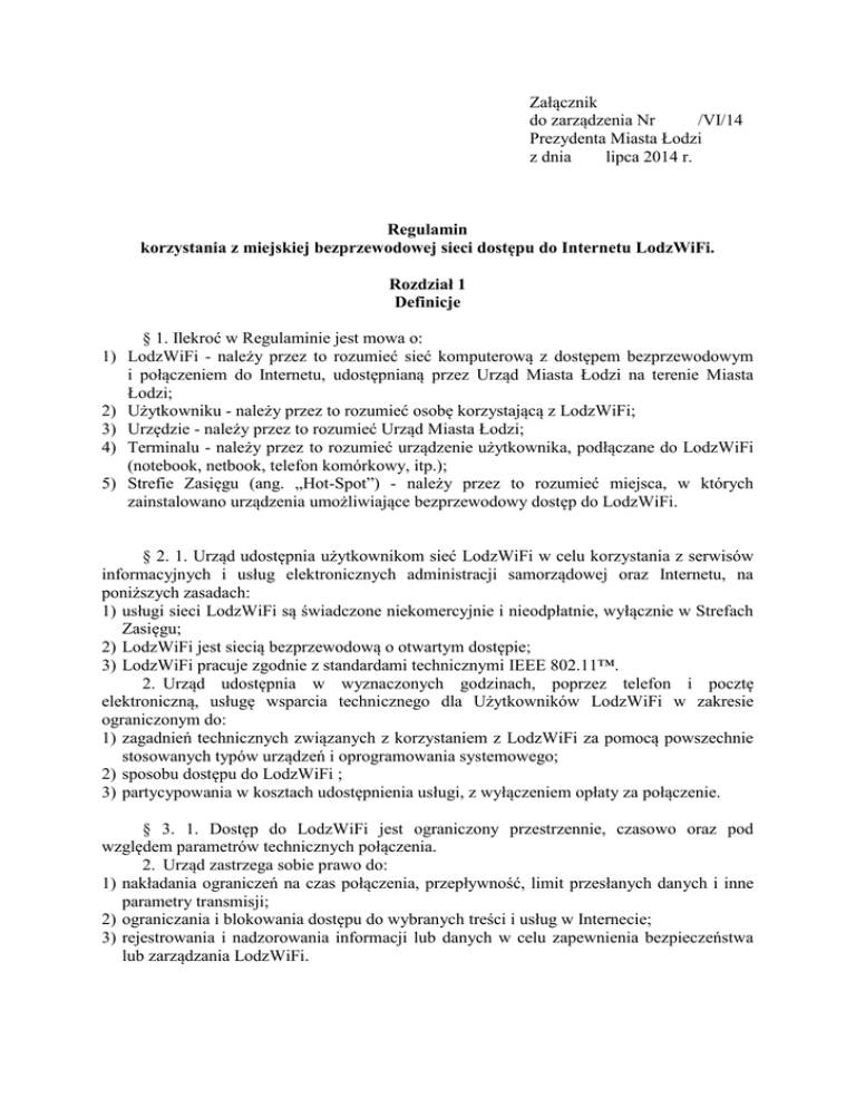 Załącznik do zarządzenia Nr /VI/14 Prezydenta Miasta Łodzi z dnia lipca 2014 r. Regulamin korzystania z miejskiej bezprzewodowej sieci dostępu do Internetu LodzWiFi. Rozdział 1 Definicje § 1. Ilekroć w Regulaminie jest mowa o: 1) LodzWiFi - należy przez to rozumieć sieć komputerową z dostępem bezprzewodowym i połączeniem do Internetu, udostępnianą przez Urząd Miasta Łodzi na terenie Miasta Łodzi; 2) Użytkowniku - należy przez to rozumieć osobę korzystającą z LodzWiFi; 3) Urzędzie - należy przez to rozumieć Urząd Miasta Łodzi; 4) Terminalu - należy przez to rozumieć urządzenie użytkownika, podłączane do LodzWiFi (notebook, netbook, telefon komórkowy, itp.); 5) Strefie Zasięgu (ang. „Hot-Spot”) - należy przez to rozumieć miejsca, w których zainstalowano urządzenia umożliwiające bezprzewodowy dostęp do LodzWiFi. § 2. 1. Urząd udostępnia użytkownikom sieć LodzWiFi w celu korzystania z serwisów informacyjnych i usług elektronicznych administracji samorządowej oraz Internetu, na poniższych zasadach: 1) usługi sieci LodzWiFi są świadczone niekomercyjnie i nieodpłatnie, wyłącznie w Strefach Zasięgu; 2) LodzWiFi jest siecią bezprzewodową o otwartym dostępie; 3) LodzWiFi pracuje zgodnie z standardami technicznymi IEEE 802.11™. 2. Urząd udostępnia w wyznaczonych godzinach, poprzez telefon i pocztę elektroniczną, usługę wsparcia technicznego dla Użytkowników LodzWiFi w zakresie ograniczonym do: 1) zagadnień technicznych związanych z korzystaniem z LodzWiFi za pomocą powszechnie stosowanych typów urządzeń i oprogramowania systemowego; 2) sposobu dostępu do LodzWiFi ; 3) partycypowania w kosztach udostępnienia usługi, z wyłączeniem opłaty za połączenie. § 3. 1. Dostęp do LodzWiFi jest ograniczony przestrzennie, czasowo oraz pod względem parametrów technicznych połączenia. 2. Urząd zastrzega sobie prawo do: 1) nakładania ograniczeń na czas połączenia, przepływność, limit przesłanych danych i inne parametry transmisji; 2) ograniczania i blokowania dostępu do wybranych treści i usług w Internecie; 3) rejestrowania i nadzorowania informacji lub danych w celu zapewnienia bezpieczeństwa lub zarządzania LodzWiFi. § 4. 1. Urząd, jego pracownicy, współpracownicy oraz wszelkie inne podmioty wykonujące pracę na jego rzecz, nie są w żaden sposób odpowiedzialni za: 1) warunki techniczne panujące w sieci LodzWiFi oraz opóźnienia w sieci Internet, które mogą mieć wpływ na rzeczywisty transfer do i z Terminala; 2) nieuprawnione użycie oprogramowania lub innych utworów będących przedmiotem ochrony własności intelektualnej treści dostępnych w Internecie; 3) szkody wyrządzone przez oprogramowanie będące w posiadaniu użytkowników; 4) dane gromadzone lub przekazywane przez Użytkownika; 5) szkody jakie może ponieść Użytkownik w związku korzystaniem z LodzWiFi, w szczególności za: a) uszkodzenia sprzętu teleinformatycznego, zniszczenie oprogramowania i danych, naruszenie danych osobowych, b) opóźnienia w otrzymaniu lub przesłaniu danych, spowodowane brakiem transmisji, nieprawidłową transmisją, opóźnieniami lub przerwami w dostępie do LodzWiFi, c) wszelkie inne szkody powstałe w związku z korzystaniem z LodzWiFi. 2. Urząd nie gwarantuje: 1) ciągłego pokrycia sygnałem radiowym w Strefach Zasięgu; 2) stałej przepustowości łącza i innych jego parametrów; 3) nieprzerwanego, poprawnego funkcjonowania LodzWiFi; 4) dostępności wszystkich usług sieciowych, aplikacyjnych i Internetowych. § 5. 1. Korzystanie z LodzWiFi odbywa się na wyłączne ryzyko i odpowiedzialność Użytkownika. 2. Użytkownik korzysta z LodzWiFi pod warunkiem zapoznania się i zaakceptowania postanowień niniejszego Regulaminu. 3. Zabrania się Użytkownikowi wykorzystywać LodzWiFi do wszelkich działań naruszających obowiązujące prawo, w szczególności: 1) udostępniać oraz pobierać z sieci Internet: materiały chronione prawami autorskimi (oprogramowanie, filmy, muzyka, itp.), treści pornograficzne, rasistowskie, faszystowskie, itp., 2) przesyłać i udostępniać treści mogące naruszyć czyjekolwiek dobra osobiste; 3) rozsyłać niezamówione przez odbiorców treści o charakterze reklamowym (tzw. spam); 4) rozpowszechniać wirusy komputerowe i inne programy mogące uszkodzić oprogramowanie lub dane innych użytkowników Internetu; 5) uzyskiwać nieuprawniony dostęp do zasobów systemów informatycznych będących w posiadaniu innych użytkowników Internetu; 6) naruszać zabezpieczenia zastosowane w sieci LodzWiFi. 4. Użytkownikowi zabrania się wykorzystywać LodzWiFi do: 1) uruchomienia serwerów usług na Terminalu; 2) celów komercyjnych bez wiedzy i zgody Urzędu; 3) wszelkich innych działań, które mogą zostać uznane za niebezpieczne dla funkcjonowania LodzWiFi; 4) udostępniać połączenie do Internetu innym podmiotom poprzez stosowanie urządzeń teletechnicznych takich jak Access Point, router, itp. 5. W przypadku nieprzestrzegania przez Użytkownika postanowień niniejszego Regulaminu jak i niezgodnego z przeznaczeniem korzystania z LodzWiFi, Urząd ma prawo do zablokowania dostępu Terminala do sieci. 6. Użytkownik jest zobowiązany do dołożenia należytej staranności przy ochronie Terminala przed niepowołanym dostępem oraz innymi zagrożeniami bezpieczeństwa teleinformatycznego (np. wirusy, spam, itp.). 7. Użytkownik ponosi wyłączną odpowiedzialność za sposób, w jaki wykorzystuje LodzWiFi, w tym za treść i zawartość przesyłanych wiadomości z uwzględnieniem odpowiedzialności karnej za działania niezgodne z prawem. § 6. 1. W sprawach nieuregulowanych niniejszym Regulaminem zastosowanie mają przepisy Kodeksu Cywilnego. 2. Urząd publikuje listę Stref Zasięgu na stronie internetowej http://wifi.uml.lodz.pl 3. Wszelkie zmiany niniejszego regulaminu obowiązują od dnia opublikowania na stronie internetowej http://wifi.uml.lodz.pl 