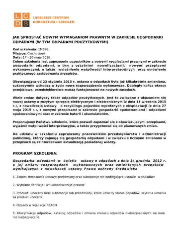 LUBELSKIE CENTRUM DORADZTWA I SZKOLEŃ JAK SPROSTAĆ NOWYM WYMAGANIOM PRAWNYM W ZAKRESIE GOSPODARKI ODPADAMI (W TYM ODPADAMI POUŻYTKOWYMI) Kod szkolenia: 1M326 Miejsce: Ciechocinek Data: 17 - 20 maja 2016 Celem szkolenia jest zapoznanie uczestników z nowymi regulacjami prawnymi w zakresie gospodarki odpadami, w tym z ostatnimi nowelizacjami, nowymi przepisami wykonawczymi, a także wyjaśnienie wątpliwości interpretacyjnych oraz omówienie praktycznego zastosowania przepisów. Obowiązująca od 23 stycznia 2013 r. ustawa o odpadach była już kilkakrotnie zmieniana, sukcesywnie wchodzą w życie nowe rozporządzenia wykonawcze. Dobiegły końca okresy przejściowe, przedsiębiorstwa muszą funkcjonować na nowych zasadach. Wiele zmian dotyczy także odpadów poużytkowych. Jest to związane z ukazaniem się nowej ustawy o zużytym sprzęcie elektrycznym i elektronicznym (z dnia 11 września 2015 r.), z nowelizacją ustawy o recyklingu pojazdów wycofanych z eksploatacji (z dnia 27 maja 2015 r.), z nowymi przepisami w zakresie gospodarki opakowaniami i odpadami opakowaniowymi oraz w zakresie baterii i akumulatorów. Proponujemy Państwu szkolenie, które pozwoli zapoznać się z obowiązującymi przepisami, wyjaśnić wątpliwości interpretacyjne, a także przygotować się do planowanych zmian. Do udziału w szkoleniu zapraszamy pracowników przedsiębiorstw i administracji publicznej, którzy zajmują się gospodarką odpadami i w związku z licznymi zmianami w przepisach są zainteresowani aktualizacją posiadanej wiedzy. PROGRAM SZKOLENIA: Gospodarka odpadami w świetle ustawy o odpadach z dnia 14 grudnia 2012 r. o jej zmian, rozporządzeń wykonawczych oraz zmienionych przepisów wynikających z nowelizacji ustawy Prawo ochrony środowiska 1. Zakres stosowania ustawy; przedmioty oraz substancje nie podlegające ustawie o odpadach 2. Wybrane definicje i ich konsekwencje prawne 3. Produkt uboczny oraz substancje lub przedmioty, które utraciły status odpadów; kryteria uznania za produkt uboczny 4. Odpady a regulacje REACH 5. Klasyfikacja odpadów; katalog odpadów i zmiana statusu odpadów niebezpiecznych na inne niż niebezpieczne 6. Pojęcie instalacji w aspekcie uzyskania pozwolenia na wytwarzanie odpadów 7. Decyzje administracyjne w zakresie gospodarki odpadami: pozwolenie zintegrowane, pozwolenie na wytwarzanie odpadów, zezwolenie na zbieranie odpadów, zezwolenie na przetwarzanie odpadów 8. Właściwość organów do orzekania w sprawach gospodarki odpadami 9. Plany gospodarki odpadami 10. Transport odpadów po zmianach 11. Zasady zbierania i magazynowania odpadów 12. Przekazywanie odpadów i przenoszenie odpowiedzialności za odpady, przekazywane osobom fizycznym 13. Odzysk i unieszkodliwianie odpadów w instalacjach i poza instalacjami: nowe rozporządzenie w sprawie odzysku odpadów poza instalacjami 14. Zasady gospodarowania poszczególnymi rodzajami odpadów (w tym odpady medyczne, komunalne osady ściekowe) 15. Ewidencja odpadów po zmianach – nowe wzory dokumentów i zwolnienia z ewidencji odpadów 16. Rejestr i Baza Danych; zasady rejestracji w BDO 17. Nowe zasady sprawozdawczości 18. Zarządzanie składowiskiem: instrukcja prowadzenia i pozwolenie zintegrowane 19. Zamknięcie składowiska odpadów: decyzje i ich zmiany 20. Spalanie i współspalanie odpadów 21. Omówienie nowych oraz projektowanych rozporządzeń do ustawy o odpadach 22. Rozwiązywanie bieżących problemów wynikających ze stosowania obowiązującej ustawy o odpadach i aktów wykonawczych 23. Konsultacje, dyskusja Realizacja przepisów opakowaniowymi ustawy o gospodarce opakowaniami i odpadami 1. Prawo Unii Europejskiej w zakresie opakowań i odpadów opakowaniowych oraz perspektywy zmiany prawa UE w tym zakresie. 2. Podstawowe definicje – opakowanie i odpady opakowaniowe 3. Wymagania zasadnicze dla opakowań 4. Nowe oznakowanie opakowań 5. Obowiązki wytwórców, importerów oraz dokonujących wewnątrzwspólnotowego nabycia produktów w opakowaniach oraz przedsiębiorców prowadzących jednostki handlowe - odzysk i recykling odpadów opakowaniowych 6. Zwolnienia podmiotowe z ustawowych obowiązków – pomoc de minimis (nowe zasady skorzystania ze zwolnienia obowiązujące od 1 stycznia 2016) 7. Nowe zasady rozliczania wprowadzanych na rynek opakowań 8. Obowiązki prowadzących jednostki handlowe 9. Rejestr przedsiębiorców 10. Zmiany w zakresie rozliczania opakowań wielomateriałowych oraz środków niebezpiecznych w opakowaniach 11. Porozumienia dobrowolne w zakresie opakowań wielomateriałowych oraz środków niebezpiecznych w opakowaniach 12. Porozumienia dobrowolne w zakresie opakowań wielokrotnego użytku w tym możliwość tworzenia systemów kaucyjnych 13. Nowe zasady współpracy przedsiębiorców z organizacjami odzysku opakowań 14. Nowe wymagania nałożone na organizacje odzysku opakowań 15. Publiczne kampanie edukacyjne – obowiązki przedsiębiorcy i organizacji odzysku 16. Poziomy odzysku i recyklingu odpadów opakowaniowych i poużytkowych ustalone na lata 2013 – 2014 oraz w kolejnych latach 17. Nowa dokumentacja potwierdzająca wykonanie odzysku i recyklingu i nowe zasady jej wystawiania 18. Uwzględnianie odpadów opakowaniowych pochodzących z gospodarstw domowych w uzyskanym poziomie odzysku i recyklingu 19. Audyt przedsiębiorców prowadzących odzysk i recykling odpadów opakowaniowych 20. Jednostkowe stawki opłat produktowych w 2014 roku 21. Wzór sprawozdania o wysokości należnej opłaty produktowej sporządzany przez przedsiębiorcę i organizację odzysku – obliczenie uzyskanych limitów odzysku i recyklingu oraz wyliczanie i sposób uiszczania opłat produktowych - przykłady wypełniania sprawozdań 22. Sprawozdanie o masie wytworzonych, przywiezionych i wywiezionych za granicę opakowań sporządzane przez przedsiębiorcę - przykłady wypełniania sprawozdań 23. Obowiązki organów administracji publicznej 24. Nowe akty wykonawcze do ust