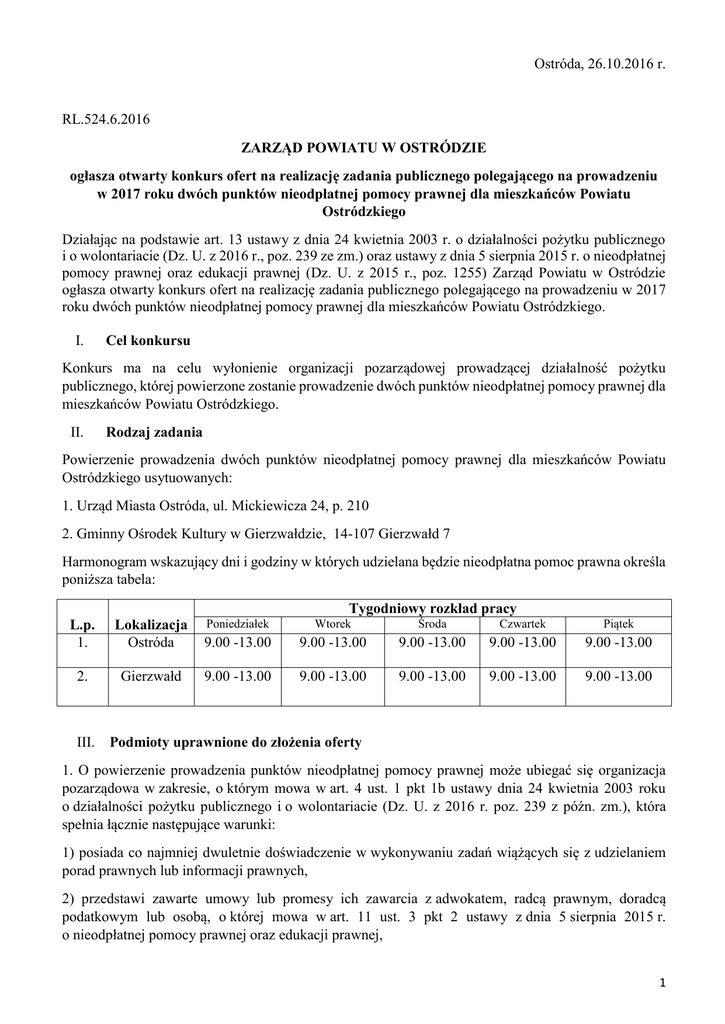 Ostróda, 26.10.2016 r. RL.524.6.2016 ZARZĄD POWIATU W OSTRÓDZIE ogłasza otwarty konkurs ofert na realizację zadania publicznego polegającego na prowadzeniu w 2017 roku dwóch punktów nieodpłatnej pomocy prawnej dla mieszkańców Powiatu Ostródzkiego Działając na podstawie art. 13 ustawy z dnia 24 kwietnia 2003 r. o działalności pożytku publicznego i o wolontariacie (Dz. U. z 2016 r., poz. 239 ze zm.) oraz ustawy z dnia 5 sierpnia 2015 r. o nieodpłatnej pomocy prawnej oraz edukacji prawnej (Dz. U. z 2015 r., poz. 1255) Zarząd Powiatu w Ostródzie ogłasza otwarty konkurs ofert na realizację zadania publicznego polegającego na prowadzeniu w 2017 roku dwóch punktów nieodpłatnej pomocy prawnej dla mieszkańców Powiatu Ostródzkiego. I. Cel konkursu Konkurs ma na celu wyłonienie organizacji pozarządowej prowadzącej działalność pożytku publicznego, której powierzone zostanie prowadzenie dwóch punktów nieodpłatnej pomocy prawnej dla mieszkańców Powiatu Ostródzkiego. II. Rodzaj zadania Powierzenie prowadzenia dwóch punktów nieodpłatnej pomocy prawnej dla mieszkańców Powiatu Ostródzkiego usytuowanych: 1. Urząd Miasta Ostróda, ul. Mickiewicza 24, p. 210 2. Gminny Ośrodek Kultury w Gierzwałdzie, 14-107 Gierzwałd 7 Harmonogram wskazujący dni i godziny w których udzielana będzie nieodpłatna pomoc prawna określa poniższa tabela: Tygodniowy rozkład pracy L.p. 1. Lokalizacja Ostróda Poniedziałek Wtorek Środa Czwartek Piątek 9.00 -13.00 9.00 -13.00 9.00 -13.00 9.00 -13.00 9.00 -13.00 2. Gierzwałd 9.00 -13.00 9.00 -13.00 9.00 -13.00 9.00 -13.00 9.00 -13.00 III. Podmioty uprawnione do złożenia oferty 1. O powierzenie prowadzenia punktów nieodpłatnej pomocy prawnej może ubiegać się organizacja pozarządowa w zakresie, o którym mowa w art. 4 ust. 1 pkt 1b ustawy dnia 24 kwietnia 2003 roku o działalności pożytku publicznego i o wolontariacie (Dz. U. z 2016 r. poz. 239 z późn. zm.), która spełnia łącznie następujące warunki: 1) posiada co najmniej dwuletnie doświadczenie w wykonywaniu zadań wiążących się z udzielaniem porad prawnych lub informacji prawnych, 2) przedstawi zawarte umowy lub promesy ich zawarcia z adwokatem, radcą prawnym, doradcą podatkowym lub osobą, o której mowa w art. 11 ust. 3 pkt 2 ustawy z dnia 5 sierpnia 2015 r. o nieodpłatnej pomocy prawnej oraz edukacji prawnej, 1 3) daje gwarancję należytego wykonania zadania, w szczególności przez złożenie pisemnego zobowiązania: a) zapewnienia poufności dokumentowaniem, w związku z udzielaniem nieodpłatnej pomocy prawnej i jej b) zapewnienia profesjonalnego i rzetelnego udzielania nieodpłatnej pomocy prawnej, w szczególności w sytuacji, gdy zachodzi konflikt interesów. 2. O powierzenie prowadzenia punktu nieodpłatnej pomocy prawnej nie może ubiegać się organizacja pozarządowa, która w okresie dwóch lat poprzedzających przystąpienie do otwartego konkursu ofert nie rozliczyła się z dotacji przyznanej na wykonanie zadania publicznego lub wykorzystała dotację niezgodnie z celem jej przyznania, jak również organizacja pozarządowa, z którą starosta rozwiązał umowę. Termin dwóch lat biegnie odpowiednio od dnia rozliczenia się z dotacji i zwrotu nienależnych środków wraz z odsetkami albo rozwiązania umowy. Organizacja składająca ofertę powinna dysponować wkładem rzeczowym (w postaci np. sprzętu biurowego) oraz zasobami kadrowymi potrzebnymi do realizacji zadania, zgodnie z wymogami określonymi w ustawie o nieodpłatnej pomocy prawnej oraz edukacji prawnej. IV. Wysokość środków publicznych przeznaczonych na wsparcie zadań Na realizację zadania przeznacza się kwotę: 121 452 zł brutto – słownie: sto dwadzieścia jeden tysięcy czterysta pięćdziesiąt dwa złote. V. Zasady przyznania dotacji Zasady przyznania dotacji na realizację powyższych zadań określają przepisy: 1) ustawa z dnia 24 kwietnia 2003 roku o działalności pożytku publicznego i o wolontariacie (Dz.U. 2016 poz. 239 z późn. zm.), 2) ustawa z dnia 27 sierpnia 2009 r. o finansach publicznych (Dz. U. z 2013 r. poz. 885 z późn. zm.), 3) ustawa z dnia 5 sierpnia 2015 r. o nieodpłatnej pomocy prawnej i edukacji prawnej (Dz. U. z 2015 r., poz. 1255). VI. Termin i warunki realizacji zadania 1. Realizacja zadania publicznego powinna nastąpić w okresie od 1.01.2017 r. do 31.12.2017 r. 2. Nieodpłatna pomoc prawna ma być udzielana w wymiarze 5 dni w tygodniu, przez co najmniej 4 godziny dziennie zgodnie z harmonogramem zawartym w punkcie II.2 w lokalach wyznaczonych przez powiat ostródzki. 3. Szczegółowe warunki realizacji zadania określa umowa na wykonanie zadania publicznego sporządzona z powiatem ostródzkim zgodna z wzorem określonym w załączniku nr 1 do rozporządzenia Ministerstwa Pracy i Polityki Społecznej z dnia 17 sierpnia 2016 r. 4. Zleceniobiorca zobowiązany jest m. in. do: 1) prowadzenia punktów nieodpłatnej pomocy prawnej przez 5 dni w tygodniu przez co najmniej 4 godziny dziennie w każdym z punktów, 2) udzielania nieodpłatnej pomocy prawnej na zasadach określonych w ustawie o nieodpłatnej pomocy prawnej i edukacji prawnej, 3) złożenia sprawozdania z wykonania zadania publicznego według wzoru określonego w rozporządzeniu Ministra Pracy i Polityki Społecznej z dnia 17 sierpnia 2016 roku w sprawie wzoru oferty i ramowego wzoru umowy dotyczących realizacji zadania publicznego oraz wzoru sprawozdania z wykonania tego zadania (Dz. U. poz. 1300) w terminie 30 dni od zakończenia realizacji zadania. 2 5. Zadania z zakresu udzielania nieodpłatnej pomocy prawnej w 2015 nie były realizowane, a w 2016 r. wysokość środków publicznych przeznaczonych na jego realizację wynosiła 119 890,00 zł. 6. W przypadku zmiany lokalizacji punktu bądź godzin udzielania nieodpłatnej pomocy prawnej zleceniobiorca zobowiązany jest do świadczenia nieodpłatnej pomocy prawnej w zmienionej lokalizacji bądź w zmienionych godzin