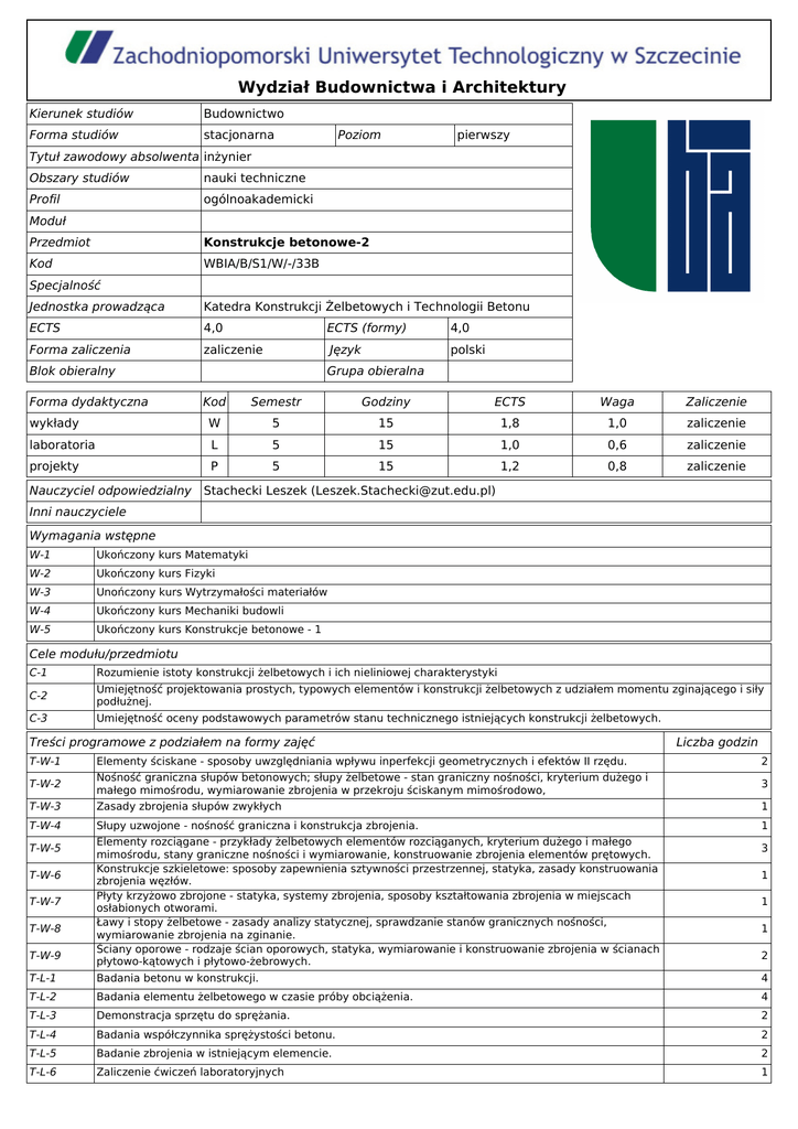 [ logo uczelni ] Wydział Budownictwa i Architektury Kierunek studiów Budownictwo Forma studiów stacjonarna Poziom pierwszy Tytuł zawodowy absolwenta inżynier Obszary studiów nauki techniczne Profil ogólnoakademicki Moduł Przedmiot Konstrukcje betonowe-2 Kod WBIA/B/S1/W/-/33B Specjalność Jednostka prowadząca Katedra Konstrukcji Żelbetowych i Technologii Betonu ECTS 4,0 ECTS (formy) 4,0 Forma zaliczenia zaliczenie Język polski Blok obieralny Forma dydaktyczna Grupa obieralna Kod Semestr Godziny ECTS Waga Zaliczenie wykłady W 5 15 1,8 1,0 zaliczenie laboratoria L 5 15 1,0 0,6 zaliczenie projekty P 5 15 1,2 0,8 zaliczenie Nauczyciel odpowiedzialny Stachecki Leszek ([email protected]) Inni nauczyciele Wymagania wstępne W-1 Ukończony kurs Matematyki W-2 Ukończony kurs Fizyki W-3 Unończony kurs Wytrzymałości materiałów W-4 Ukończony kurs Mechaniki budowli W-5 Ukończony kurs Konstrukcje betonowe - 1 Cele modułu/przedmiotu C-1 Rozumienie istoty konstrukcji żelbetowych i ich nieliniowej charakterystyki C-2 Umiejętność projektowania prostych, typowych elementów i konstrukcji żelbetowych z udziałem momentu zginającego i siły podłużnej. C-3 Umiejętność oceny podstawowych parametrów stanu technicznego istniejących konstrukcji żelbetowych. Treści programowe z podziałem na formy zajęć Liczba godzin T-W-1 Elementy ściskane - sposoby uwzględniania wpływu inperfekcji geometrycznych i efektów II rzędu. 2 T-W-2 Nośność graniczna słupów betonowych; słupy żelbetowe - stan graniczny nośności, kryterium dużego i małego mimośrodu, wymiarowanie zbrojenia w przekroju ściskanym mimośrodowo, 3 T-W-3 Zasady zbrojenia słupów zwykłych 1 T-W-4 Słupy uzwojone - nośność graniczna i konstrukcja zbrojenia. 1 T-W-5 T-W-6 T-W-7 T-W-8 T-W-9 Elementy rozciągane - przykłady żelbetowych elementów rozciąganych, kryterium dużego i małego mimośrodu, stany graniczne nośności i wymiarowanie, konstruowanie zbrojenia elementów prętowych. Konstrukcje szkieletowe: sposoby zapewnienia sztywności przestrzennej, statyka, zasady konstruowania zbrojenia węzłów. Płyty krzyżowo zbrojone - statyka, systemy zbrojenia, sposoby kształtowania zbrojenia w miejscach osłabionych otworami. Ławy i stopy żelbetowe - zasady analizy statycznej, sprawdzanie stanów granicznych nośności, wymiarowanie zbrojenia na zginanie. Ściany oporowe - rodzaje ścian oporowych, statyka, wymiarowanie i konstruowanie zbrojenia w ścianach płytowo-kątowych i płytowo-żebrowych. 3 1 1 1 2 T-L-1 Badania betonu w konstrukcji. 4 T-L-2 Badania elementu żelbetowego w czasie próby obciążenia. 4 T-L-3 Demonstracja sprzętu do sprężania. 2 T-L-4 Badania współczynnika sprężystości betonu. 2 T-L-5 Badanie zbrojenia w istniejącym elemencie. 2 T-L-6 Zaliczenie ćwiczeń laboratoryjnych 1 [ logo uczelni ] Wydział Budownictwa i Architektury Treści programowe z podziałem na formy zajęć T-P-1 Liczba godzin Projekt elementow żelbetowej ramy dwukondygnacyjnej i dwunawowej obciążenej stropem płytowożebrowym. Obliczenia statyczne i wymiarowanie elementów ramy żelbetowej: dwuprzęslowego rygla i słupa najniższej kondygnacji oraz stopy fundamentowej obciążonej projektowanym słupem. Sprawdzenie zarysowania i ugięcia rygla. Rysunki konstrukcyjne projektowanych elementów konstrukcyjnych. 15 Obciążenie pracą studenta - formy aktywności Liczba godzin A-W-1 Uczestnictwo w wykładach. 15 A-W-2 Samodzielne poszerzanie wiedzy - studia literaturowe 20 A-W-3 Udział w konsultacjach. A-W-4 Przygotowanie do zaliczenia A-W-5 Udział w zaliczeniu A-L-1 Uczestnictwo w zajęciach A-L-2 Przygotowanie do zajęć 7 A-L-3 Opracowanie sprawozdań z zajęć. 7 A-L-4 Zaliczenie sprawozdań z zajęć. 1 A-P-1 Uczestnictwo w zajęciach 15 A-P-2 Samodzielna realizacja zadania projektowego. 15 A-P-3 Przygotowanie do zaliczenia projektu. 2 A-P-4 Udział w konsultacjach. 4 A-P-5 Zaliczenie projektu. 1 6 10 2 15 Metody nauczania / narzędzia dydaktyczne M-1 Wykład informacyjny. M-2 Realizacja indywidualnego zadania projektowego. M-3 Realizacja i interpretacja badań laboratoryjnych. Sposoby oceny (F - formująca, P - podsumowująca) S-1 P Zaliczenie pisemne z wykładów S-2 P Zaliczenie pracy projektowej S-3 P Zaliczenie ćwiczeń laboratoryjnych Zamierzone efekty kształcenia Odniesienie do efektów kształcenia dla kierunku studiów Odniesienie do efektów zdefiniowanych dla obszaru kształcenia Odniesienie do efektów kształcenia prowadzących do Cel uzyskania tytułu przedmiotu zawodowego inżyniera Treści programowe Metody nauczania Sposób oceny M-1 M-2 S-1 M-1 M-2 S-1 M-1 M-2 S-1 S-2 M-1 M-2 S-1 S-2 M-1 S-1 M-3 S-1 S-3 Wiedza B_1A_C/33B_W01 Rozumie istotę konstrukcji żelbetowych i ich nieliniową charakterystykę. B_1A_C/33B_W02 Rozumie wpływ efektów II rzędu na pracę elementów ściskanych i konieczność analizy przestrzennej sztywności budynków. B_1A_W07 B_1A_W08 B_1A_W07 B_1A_W08 T1A_W03 T1A_W04 T1A_W07 T1A_W03 T1A_W04 T1A_W07 InzA_W02 InzA_W05 C-1 InzA_W02 InzA_W05 C-1 T-W-1 T-W-2 T-W-3 T-W-1 T-W-2 T-W-3 T-W-4 T-W-5 T-W-6 T-W-4 T-W-5 T-W-6 T-W-1 T-W-2 T-W-3 T-W-4 T-W-5 T-W-6 T-P-1 T-W-8 Umiejętności B_1A_C/33B_U01 Potrafi projektować typowe konstrukcje betonowe z udziałem siły podłużnej. B_1A_U07 B_1A_C/33B_U02 Potrafi projektować podstawowe typy fundamentów z punktu widzenia ich pracy jako elemntu żelbetowego. B_1A_U07 B_1A_C/33B_U03 Potrafi projektować podstawowe typy żelbetowych ścian oporowych. B_1A_U07 B_1A_U08 B_1A_C/33B_U04 Potrafi dokonać oceny podstawowych parametrow technicznych istniejącej konstrukcji. B_1A_U07 Inne kompetencje społeczne i personalne T1A_U09 T1A_U13 T1A_U15 T1A_U16 T1A_U09 T1A_U13 T1A_U15 T1A_U16 T1A_U08 T1A_U09 T1A_U13 T1A_U15 T1A_U16 T1A_U09 T1A_U13 T1A_U15 T1A_U16 InzA_U02 InzA_U05 InzA_U07 InzA_U08 InzA_U02 InzA_U05 InzA_U07 InzA_U08 InzA_U01 InzA_U02 InzA_U05 InzA_U07 InzA_U08 InzA_U02 InzA_U05 InzA_U07 InzA_U08 C-2 C-1 C-2 T-