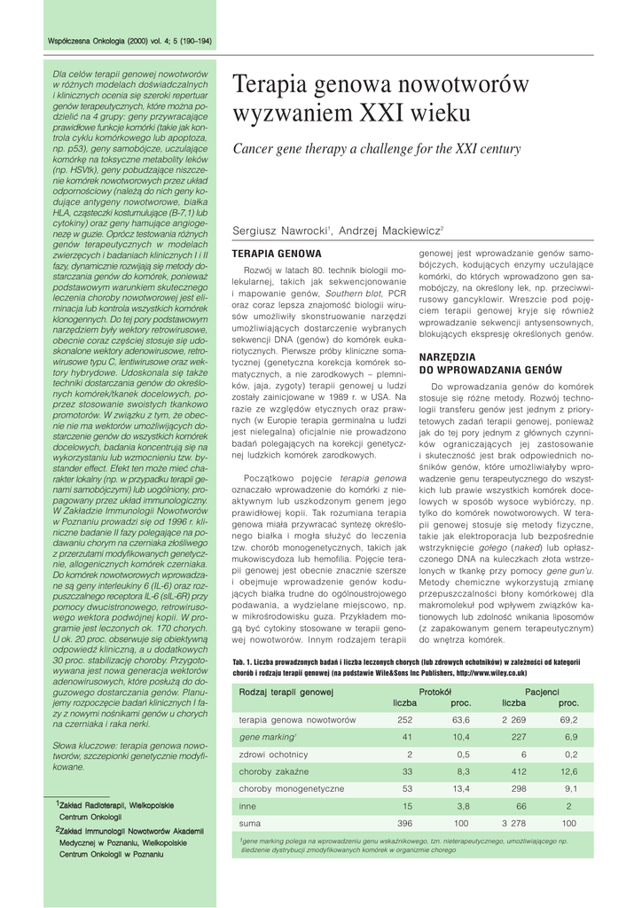 Wspó³czesna Onkologia (2000) vol. 4; 5 (190–194) Dla celów terapii genowej nowotworów w ró¿nych modelach doœwiadczalnych i klinicznych ocenia siê szeroki repertuar genów terapeutycznych, które mo¿na podzieliæ na 4 grupy: geny przywracaj¹ce prawid³owe funkcje komórki (takie jak kontrola cyklu komórkowego lub apoptoza, np. p53), geny samobójcze, uczulaj¹ce komórkê na toksyczne metabolity leków (np. HSVtk), geny pobudzaj¹ce niszczenie komórek nowotworowych przez uk³ad odpornoœciowy (nale¿¹ do nich geny koduj¹ce antygeny nowotworowe, bia³ka HLA, cz¹steczki kostumuluj¹ce (B-7,1) lub cytokiny) oraz geny hamuj¹ce angiogenezê w guzie. Oprócz testowania ró¿nych genów terapeutycznych w modelach zwierzêcych i badaniach klinicznych I i II fazy, dynamicznie rozwijaj¹ siê metody dostarczania genów do komórek, poniewa¿ podstawowym warunkiem skutecznego leczenia choroby nowotworowej jest eliminacja lub kontrola wszystkich komórek klonogennych. Do tej pory podstawowym narzêdziem by³y wektory retrowirusowe, obecnie coraz czêœciej stosuje siê udoskonalone wektory adenowirusowe, retrowirusowe typu C, lentiwirusowe oraz wektory hybrydowe. Udoskonala siê tak¿e techniki dostarczania genów do okreœlonych komórek/tkanek docelowych, poprzez stosowanie swoistych tkankowo promotorów. W zwi¹zku z tym, ¿e obecnie nie ma wektorów umo¿liwij¹cych dostarczenie genów do wszystkich komórek docelowych, badania koncentruj¹ siê na wykorzystaniu lub wzmocnieniu tzw. bystander effect. Efekt ten mo¿e mieæ charakter lokalny (np. w przypadku terapii genami samobójczymi) lub uogólniony, propagowany przez uk³ad immunologiczny. W Zak³adzie Immunologii Nowotworów w Poznaniu prowadzi siê od 1996 r. kliniczne badanie II fazy polegaj¹ce na podawaniu chorym na czerniaka z³oœliwego z przerzutami modyfikowanych genetycznie, allogenicznych komórek czerniaka. Do komórek nowotworowych wprowadzane s¹ geny interleukiny 6 (IL-6) oraz rozpuszczalnego receptora IL-6 (sIL-6R) przy pomocy dwucistronowego, retrowirusowego wektora podwójnej kopii. W programie jest leczonych ok. 170 chorych. U ok. 20 proc. obserwuje siê obiektywn¹ odpowiedŸ kliniczn¹, a u dodatkowych 30 proc. stabilizacjê choroby. Przygotowywana jest nowa generacja wektorów adenowirusowych, które pos³u¿¹ do doguzowego dostarczania genów. Planujemy rozpoczêcie badañ klinicznych I fazy z nowymi noœnikami genów u chorych na czerniaka i raka nerki. Terapia genowa nowotworów wyzwaniem XXI wieku Cancer gene therapy a challenge for the XXI century Sergiusz Nawrocki1, Andrzej Mackiewicz2 TERAPIA GENOWA Rozwój w latach 80. technik biologii molekularnej, takich jak sekwencjonowanie i mapowanie genów, Southern blot, PCR oraz coraz lepsza znajomoœæ biologii wirusów umo¿liwi³y skonstruowanie narzêdzi umo¿liwiaj¹cych dostarczenie wybranych sekwencji DNA (genów) do komórek eukariotycznych. Pierwsze próby kliniczne somatycznej (genetyczna korekcja komórek somatycznych, a nie zarodkowych – plemników, jaja, zygoty) terapii genowej u ludzi zosta³y zainicjowane w 1989 r. w USA. Na razie ze wzglêdów etycznych oraz prawnych (w Europie terapia germinalna u ludzi jest nielegalna) oficjalnie nie prowadzono badañ polegaj¹cych na korekcji genetycznej ludzkich komórek zarodkowych. 1Zak³ad Radioterapii, Wielkopolskie Centrum Onkologii 2Zak³ad Immunologii Nowotworów Akademii Medycznej w Poznaniu, Wielkopolskie Centrum Onkologii w Poznaniu NARZÊDZIA DO WPROWADZANIA GENÓW Do wprowadzania genów do komórek stosuje siê ró¿ne metody. Rozwój technologii transferu genów jest jednym z priorytetowych zadañ terapii genowej, poniewa¿ jak do tej pory jednym z g³ównych czynników ograniczaj¹cych jej zastosowanie i skutecznoœæ jest brak odpowiednich noœników genów, które umo¿liwia³yby wprowadzenie genu terapeutycznego do wszystkich lub prawie wszystkich komórek docelowych w sposób wysoce wybiórczy, np. tylko do komórek nowotworowych. W terapii genowej stosuje siê metody fizyczne, takie jak elektroporacja lub bezpoœrednie wstrzykniêcie go³ego (naked) lub op³aszczonego DNA na kuleczkach z³ota wstrzelonych w tkankê przy pomocy gene gun’u. Metody chemiczne wykorzystuj¹ zmianê przepuszczalnoœci b³ony komórkowej dla makromoleku³ pod wp³ywem zwi¹zków kationowych lub zdolnoœæ wnikania liposomów (z zapakowanym genem terapeutycznym) do wnêtrza komórek. Pocz¹tkowo pojêcie terapia genowa oznacza³o wprowadzenie do komórki z nieaktywnym lub uszkodzonym genem jego prawid³owej kopii. Tak rozumiana terapia genowa mia³a przywracaæ syntezê okreœlonego bia³ka i mog³a s³u¿yæ do leczenia tzw. chorób monogenetycznych, takich jak mukowiscydoza lub hemofilia. Pojêcie terapii genowej jest obecnie znacznie szersze i obejmuje wprowadzenie genów koduj¹cych bia³ka trudne do ogólnoustrojowego podawania, a wydzielane miejscowo, np. w mikroœrodowisku guza. Przyk³adem mog¹ byæ cytokiny stosowane w terapii genowej nowotworów. Innym rodzajem terapii Tab. 1. Liczba prowadzonych badañ i liczba leczonych chorych (lub zdrowych ochotników) w zale¿noœci od kategorii chorób i rodzaju terapii genowej (na podstawie Wile&Sons Inc Publishers, http://www.wiley.co.uk) Rodzaj terapii genowej liczba terapia genowa nowotworów Protokó³ proc. Pacjenci liczba proc. 252 63,6 2 269 69,2 41 10,4 227 6,9 zdrowi ochotnicy 2 0,5 6 0,2 choroby zakaŸne 33 8,3 412 12,6 choroby monogenetyczne 53 13,4 298 9,1 inne 15 3,8 66 2 suma 396 100 3 278 gene marking S³owa kluczowe: terapia genowa nowotworów, szczepionki genetycznie modyfikowane. genowej jest wprowadzanie genów samobójczych, koduj¹cych enzymy uczulaj¹ce komórki, do których wprowadzono gen samobójczy, na okreœlony lek, np. przeciwwirusowy gancyklowir. Wreszcie pod pojêciem terapii genowej kryje siê równie¿ wprowadzanie sekwencji antysensownych, blokuj¹cych ekspresjê okreœlonych genów. 1gene 1 100 marking polega na wprow