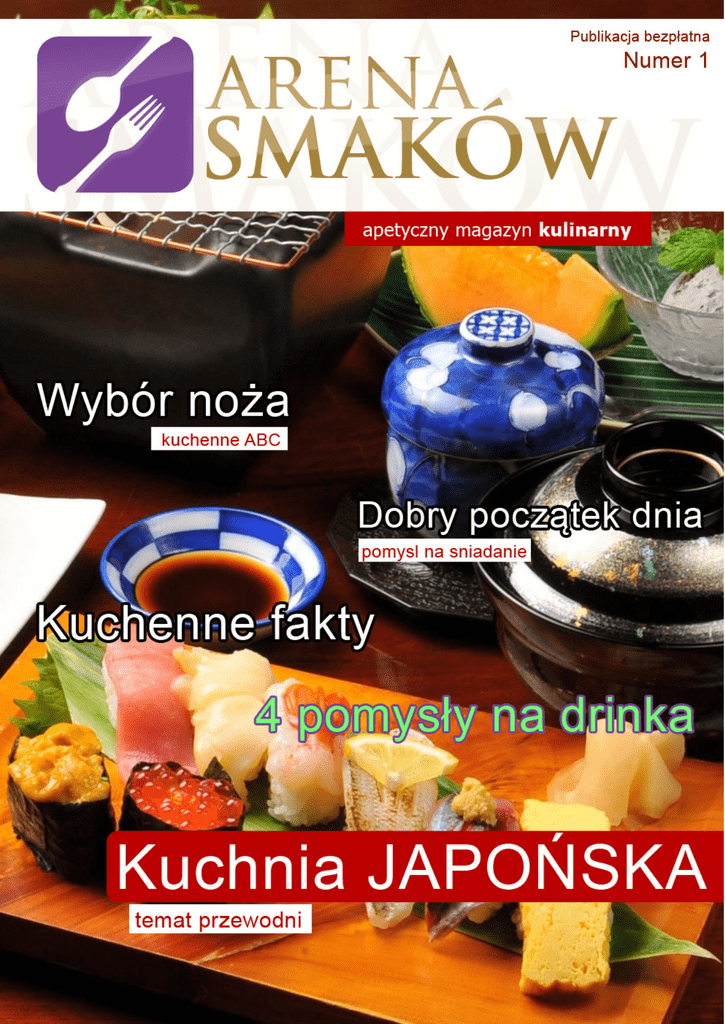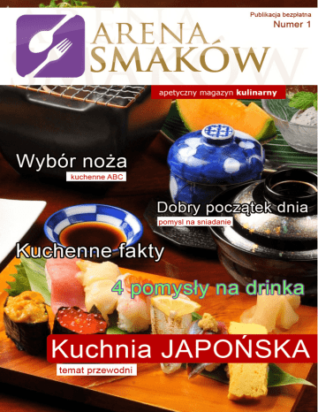 ArenaSmaków 1 Nr 1 - Marzec }} Spis treści TEMAT PRZEWODNI Kuchnia Japońska - informacje..............................03 Sushi z kawiorem - przepis...................................05 03 Roladki sushi - przepis...................................06 Zupa miso - przepis...................................07 Kuchnia Japońska Informacje, przepisy, ciekawostki Zupa chawanmushi - przepis...................................08 Pierożki japońskie Gyoza - przepis...................................09 Sałatka z czarnych alg - przepis...................................10 15 Lokale z kuchnią japońską.......11 Ciekawostki............................12 PRZEPISY I CIEKAWOSTKI Dobry początek dnia - Pomysł na dobre śniadanie........13 Poznajemy ser Gouda oraz Camembert Szanowny Czytelniku, Oddajemy w Twoje ręce nasz nowy magazyn. Znajdziesz w nim wiele ciekawych informacji o kuchniach z całego świata, masę przepisów oraz kuchenne ABC. Świat serów............................15 Ciasta i desery........................18 Przepisy dla wegetarian.........20 Mamy nadzieję, że nasze pismo przypadnie Ci do gustu. 4 pomysły na drinka..............21 Nóż - jaki wybrać?..................23 Życzymy miłej lektury! Redakcja Arena Smaków Kuchenne ciekawostki............25 ArenaSmaków Świat serów 2 Nr 1 - Marzec Temat przewodni - Japonia Kuchnia japońska P Dania, które przygotowywane otrawy kuchni japońskiej są bardzo proste do przyrządzenia, a przede wszystkim zdrowe, składają się z potraw zawierających surowe składniki, takie jak ryby, owoce morza, a także mięso jest smażone czy gotowane w bardzo małym stopniu, przez niewielką ilość czasu. Kuchnia japońska wywiera dobroczynny wpływ na organizm, dzięki składnikom, które znajdują się w tych potrawach, takich jak warzywa, ryby czy też ryż. Potrawy japońskie składają się przede wszystkim z kilku głównych składników. Wśród nich dominuje dobrze dostępny w tamtym regionie ryż, owoce morza, warzywa oraz świeże ryby. Te właśnie składniki połączone z innymi dodatkami nadają doskonały smak i niesamowity aromat potrawom. są w Japonii znane są niemal na całym świecie. Na pewno każdy z nas, przynajmniej w niewielkim stopniu słyszał o kuchni japońskiej. Przytoczymy więc kilka informacji o niej. ArenaSmaków 3 Nr 1 - Marzec Temat przewodni - Japonia Ciekawostką jest to, że Japończycy przywiązują dużą wagę do spożywania przyrządzonych przez siebie posiłków. Jedzenie to dla nich nie tylko zaspokajanie potrzeb, ale również doznanie mistyczne i estetyczne, dlatego towarzyszą temu emocje i pełna dokładność podczas przyrządzania potraw. Z tego względu potrawy kuchni japońskiej charakteryzują się dostojnym i estetycznym wyglądem. Nie wynika to z nagromadzenia różnorakich dekoracji, lecz ze skromności i surowości. Japończycy przywiązują dużą wagę do kompozycji jak i kolorystyki podawanych posiłków. Tradycyjny japoński posiłek składa się z niewielkich porcji różnych potraw. Znane, z pewnością wszystkim sushi jest charakterystyczną i najpopularniejszą potrawą kuchni japońskiej. Ciekawostką jest to, że na japońskim stole nie może pojawić się nóż, byłoby to wbrew zasadom pa- nującym w tej kuchni, dlatego też Japończycy spożywają dania za pomocą pałeczek, natomiast zupy spożywa się krótką, wykonaną z porcelany, łyżką. Przyglądając się potrawom kuchni japońskiej można z łatwością zauważyć, że ich dania skomponowane są z małych, niewielkich ilości, które z łatwością można spożyć używając przy tym pałeczki. Część przypraw i dodatków do dań kuchni japońskiej można już spotkać w Polsce, lecz większość z nich nadal jest trudno dostępna, np. pasta miso. Na pocieszenie dodam, iż istnieją takie produkty japońskie, które z łatwością możemy zastąpić dodatkami polskimi, jak np. japońskie wasabi spokojnie można zastąpić chrzanem i musztardą, a wino mirin białym winem wytrawnym. ArenaSmaków 4 Nr 1 - Marzec Temat przewodni - Japonia :: PRZEPISY m e r o i w a k z i Sush Porc dla 6 osó • Po 6 łyżeczek czerwonego, czarnego i żółtego kawioru • 18 łyżeczek specjalnie przygotowanego ryżu do sushi • 18 pasków alg nori o wielkości 10cm x 4cm • 2 łyżeczki pasty wasali ArenaSmaków ja b Wcześniej uformowany ryż w wałeczki posmaruj pastą wasabi. Każdy wałek ryżu umieść w pasku nori, tak aby lekko wystawał ponad ryż. Na każdy nałóż po łyżeczce kawioru i gotowe. 5 Nr 1 - Marzec Temat przewodni - Japonia :: PRZEPISY Roladki sus • 120g wędzonego łososia • 300g specjalnego ryżu do sushi • 1 łyżeczka soli • 2 łyżki cukru • 2 cebule dymki • 3 łyżki octu ryżowego • 35g ogórka bez pestek • 32 paski alg nori • 2 łyżeczki wasabi ArenaSmaków hi Ilość rolad ek 32 Ryż ugotuj zgodnie ze wskazówkami. W garnku wymieszaj sól, cukier i ocet, podgrzewaj do momentu rozpuszczenia się cukru. Gdy będzie już gotowe, polej tym ugotowany wcześniej ryż, dodaj drobno posiekany ogórek i cebule. Całość dokładnie wymieszaj. Odstaw do ostygnięcia. Na każdym pasku nori ułóż ryż oraz kawałki łososia, posmaruj pastą wasabi. Tak przygotowany każdy pasek połóż na półmisku i podawaj z japońskim sosem sojowym. 6 Nr 1 - Marzec :: PRZEPISY Temat przewodni - Japonia Z u p a m is o • 500 ml wody • 2 saszetki dashi • pół pęczka kolendry • łyżeczka tamari Zupa miso-shiru to najpopularniejsza zupa w Japonii, spożywana przez Japończyków niemal codziennie jako dodatek do posiłków. • łyżeczka oleju sezamowego • łyżeczka sosu sojowego Zagotuj wodę z dodatkiem dashi, po- • łyżeczka startego imbiru siekanymi pęczkami kolendry i tamari, • łyżeczka sosu rybnego dodaj olej sezamowy, sos sojowy, starty • pokrojona marchewka imbir oraz sos rybny. Dodaj pozostałe • kapusta pekińska warzywa, gotuj do miękkości. Po zdję- • 2 pęcz