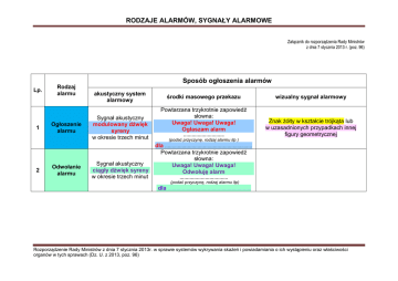 RODZAJE ALARMÓW, SYGNAŁY ALARMOWE Załącznik do rozporządzenia Rady Ministrów z dnia 7 stycznia 2013 r. (poz. 96) Sposób ogłoszenia alarmów Lp. 1 2 Rodzaj alarmu Ogłoszenie alarmu Odwołanie alarmu akustyczny system alarmowy Sygnał akustyczny modulowany dźwięk syreny w okresie trzech minut Sygnał akustyczny ciągły dźwięk syreny w okresie trzech minut środki masowego przekazu Powtarzana trzykrotnie zapowiedź słowna: Uwaga! Uwaga! Uwaga! Ogłaszam alarm ……………………….. (podać przyczynę, rodzaj alarmu itp ) ………………………………………………..…… wizualny sygnał alarmowy Znak żółty w kształcie trójkąta lub w uzasadnionych przypadkach innej figury geometrycznej dla Powtarzana trzykrotnie zapowiedź słowna: Uwaga! Uwaga! Uwaga! Odwołuję alarm dla ……………………………. (podać przyczynę, rodzaj alarmu itp) ………………………………………………….. Rozporządzenie Rady Ministrów z dnia 7 stycznia 2013r. w sprawie systemów wykrywania skażeń i powiadamiania o ich wystąpieniu oraz właściwości organów w tych sprawach (Dz. U. z 2013, poz. 96) RODZAJE ALARMÓW, SYGNAŁY ALARMOWE Załącznik do rozporządzenia Rady Ministrów z dnia 7 stycznia 2013 r. (poz. 96) KOMUNIKATY OSTRZEGAWCZE Sposób ogłoszenia alarmów Lp 1 Rodzaj alarmu Uprzedzenie O zagrożeniu skażeniami akustyczny system alarmowy _ środki masowego przekazu Powtarzana 3- krotnie zapowiedź słowna : Uwaga ! Uwaga ! osoby znajdujące się na terenie……….. około godz. ……min…….. Może nastąpić skażenie …………………….. Sposób odwołania alarmów akustyczny system środki masowego przekazu alarmowy _ ( podać rodzaj skażenia ) w kierunku …………………………………… ( rodzaj skażenia ) dla ……………………………. ( podać kierunek ) 2 Uprzedzenie O zagrożeniu zakażeniami _ Formę i treść komunikatu uprzedzenia o zagrożeniu zakażeniami ustalają organy Państwowej Inspekcji Sanitarnej. Powtarzana 3-krotnie zapowiedź słowna: Uwaga ! Uwaga ! Odwołuję uprzedzenie o zagrożeniu …………………………. _ Powtarzana 3-krotnie zapowiedź słowna: Uwaga ! Uwaga ! Odwołuję uprzedzenie o zagrożeniu …………………………. ( rodzaj zakażeniu ) 3 Uprzedzenie o klęskach żywiołowych _ Powtarzana 3- krotnie zapowiedź słowna : Informacja o zagrożeniu i sposobie postępowania mieszkańców…….. (podać rodzaj zagrożenia, spodziewany czas wystąpienia i wytyczne dla mieszkańców) _ dla ……………………………. Powtarzana 3-krotnie zapowiedź słowna: Uwaga ! Uwaga ! Odwołuję uprzedzenie o zagrożeniu …………………………. ( podać rodzaj klęski) dla ……………………………. Rozporządzenie Rady Ministrów z dnia 7 stycznia 2013r. w sprawie systemów wykrywania skażeń i powiadamiania o ich wystąpieniu oraz właściwości organów w tych sprawach (Dz. U. z 2013, poz. 96)