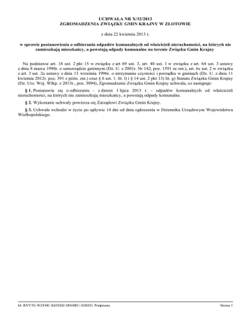 UCHWAŁA NR X/32/2013 ZGROMADZENIA ZWIĄZKU GMIN KRAJNY W ZŁOTOWIE z dnia 22 kwietnia 2013 r. w sprawie postanowienia o odbieraniu odpadów komunalnych od właścicieli nieruchomości, na których nie zamieszkują mieszkańcy, a powstają odpady komunalne na terenie Związku Gmin Krajny Na podstawie art. 18 ust. 2 pkt 15 w związku z art 69 ust. 3, art. 40 ust. 1 w związku z art. 64 ust. 3 ustawy z dnia 8 marca 1990r. o samorządzie gminnym (Dz. U. z 2001r. Nr 142, poz. 1591 ze zm.), art. 6c ust. 2 w związku z art. 3 ust. 2a ustawy z dnia 13 września 1996r. o utrzymaniu czystości i porządku w gminach (Dz. U. z dnia 11 kwietnia 2012r. poz. 391 z późn. zm.) oraz § 6 ust. 1. lit. l) i § 14 ust. 2 pkt 13) lit. g) Statutu Związku Gmin Krajny (Dz. Urz. Woj. Wlkp. z 2013r., poz. 3094), Zgromadzenie Związku Gmin Krajny uchwala, co następuje: § 1. Postanawia się o odbieraniu - z dniem 1 lipca 2013 r. - odpadów komunalnych od właścicieli nieruchomości, na których nie zamieszkują mieszkańcy, a powstają odpady komunalne. § 2. Wykonanie uchwały powierza się Zarządowi Związku Gmin Krajny. § 3. Uchwała wchodzi w życie po upływie 14 dni od dnia ogłoszenia w Dzienniku Urzędowym Województwa Wielkopolskiego. Id: RNYTE-WZFHC-KHXDZ-MNSRU-XDIZO. Podpisany Strona 1 Uzasadnienie do uchwały w sprawie postanowienia o odbieraniu odpadów komunalnych od właścicieli nieruchomości, na których nie zamieszkują mieszkańcy, a powstają odpady komunalne na terenie Związku Gmin Krajny W związku ze zmianą ustawy z dnia 13 września 1996r. o utrzymaniu czystości i porządku w gminach (Dz. U. z 11 kwietnia 2012r. poz. 391 z późn. zm.) opracowana została uchwała w sprawie postanowienia o odbieraniu odpadów komunalnych od właścicieli nieruchomości, na których nie zamieszkują mieszkańcy, a powstają odpady komunalne na terenie Związku Gmin Krajny. Stosownie do art. 6c ust. 2 w/w ustawy rada gminy (odpowiednio zgromadzenie związku międzygminnego) może, w drodze uchwały stanowiącej akt prawa miejscowego, postanowić o odbieraniu odpadów komunalnych od właścicieli nieruchomości, na których nie zamieszkują mieszkańcy, a powstają odpady komunalne. Konsekwencją przejęcia tego zadania jest powstanie po stronie właścicieli nieruchomości, na których nie zamieszkują mieszkańcy obowiązku uiszczenia opłaty za gospodarowanie odpadami komunalnymi. Taki obowiązek powstaje za każdy miesiąc, w którym na danej nieruchomości powstały odpady komunalne. W przypadku przedmiotowych nieruchomości opłata za gospodarowanie odpadami komunalnymi stanowi iloczyn liczby pojemników z tymi odpadami, powstałymi na danej nieruchomości oraz stawki opłaty ustalonej przez Zgromadzenie. Opłata ta stanowi dochód Związku. Z pobranych opłat za gospodarowanie odpadami komunalnymi Związek Gmin Krajny pokrywa koszty funkcjonowania systemu gospodarowania odpadami komunalnymi, które obejmują koszty odbierania, transportu, zbierania, odzysku i unieszkodliwiania odpadów komunalnych, tworzenia i utrzymania punktów ich selektywnego zbierania oraz obsługi administracyjnej tego systemu. Nieruchomościami, na których nie zamieszkują mieszkańcy, a powstają odpady komunalne są m.in. budynki użyteczności publicznej (budynki urzędów, szkół, przedszkoli, żłobków, stowarzyszeń, fundacji, obiekty służby zdrowia i pomocy społecznej itp.), lokale rzemieślnicze produkcyjne i nieprodukcyjne, lokale gastronomiczne i handlowe, obiekty noclegowe oraz ogrody działkowe, a także obiekty przemysłowe. Mając na uwadze stworzenie spójnego i efektywnego systemu gospodarowania odpadami komunalnymi konieczne jest rozwiązanie polegające na przejęciu przez Związek Gmin Krajny, w drodze uchwały Zgromadzenia Związku Gmin Krajny, stanowiącej akt prawa miejscowego, obowiązku organizacji odbioru odpadów komunalnych od właścicieli nieruchomości niemieszkalnych, na których powstają odpady komunalne. W związku z powyższym, podjęcie uchwały jest uzasadnione. Przewodniczący Zgromadzenia Ireneusz Baran Id: RNYTE-WZFHC-KHXDZ-MNSRU-XDIZO. Podpisany Strona 1