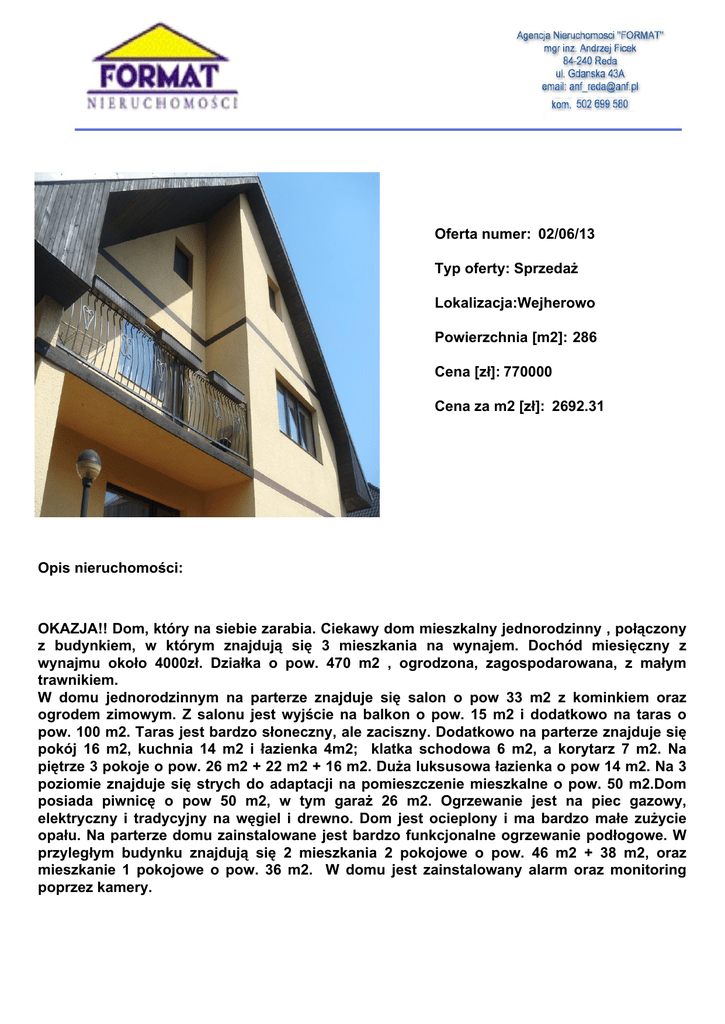 Oferta numer: 02/06/13 Typ oferty: Sprzedaż Lokalizacja:Wejherowo Powierzchnia [m2]: 286 Cena [zł]: 770000 Cena za m2 [zł]: 2692.31 Opis nieruchomości: OKAZJA!! Dom, który na siebie zarabia. Ciekawy dom mieszkalny jednorodzinny , połączony z budynkiem, w którym znajdują się 3 mieszkania na wynajem. Dochód miesięczny z wynajmu około 4000zł. Działka o pow. 470 m2 , ogrodzona, zagospodarowana, z małym trawnikiem. W domu jednorodzinnym na parterze znajduje się salon o pow 33 m2 z kominkiem oraz ogrodem zimowym. Z salonu jest wyjście na balkon o pow. 15 m2 i dodatkowo na taras o pow. 100 m2. Taras jest bardzo słoneczny, ale zaciszny. Dodatkowo na parterze znajduje się pokój 16 m2, kuchnia 14 m2 i łazienka 4m2; klatka schodowa 6 m2, a korytarz 7 m2. Na piętrze 3 pokoje o pow. 26 m2 + 22 m2 + 16 m2. Duża luksusowa łazienka o pow 14 m2. Na 3 poziomie znajduje się strych do adaptacji na pomieszczenie mieszkalne o pow. 50 m2.Dom posiada piwnicę o pow 50 m2, w tym garaż 26 m2. Ogrzewanie jest na piec gazowy, elektryczny i tradycyjny na węgiel i drewno. Dom jest ocieplony i ma bardzo małe zużycie opału. Na parterze domu zainstalowane jest bardzo funkcjonalne ogrzewanie podłogowe. W przyległym budynku znajdują się 2 mieszkania 2 pokojowe o pow. 46 m2 + 38 m2, oraz mieszkanie 1 pokojowe o pow. 36 m2. W domu jest zainstalowany alarm oraz monitoring poprzez kamery.