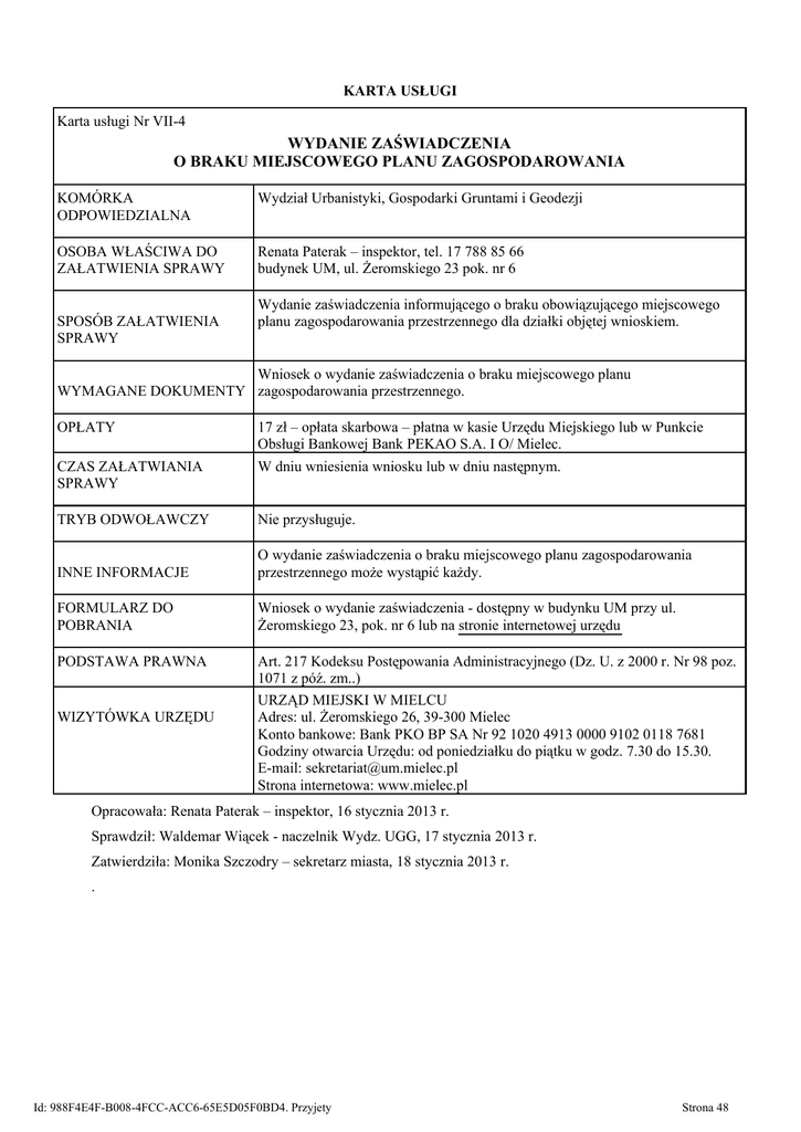 KARTA USŁUGI Karta usługi Nr VII-4 WYDANIE ZAŚWIADCZENIA O BRAKU MIEJSCOWEGO PLANU ZAGOSPODAROWANIA KOMÓRKA ODPOWIEDZIALNA Wydział Urbanistyki, Gospodarki Gruntami i Geodezji OSOBA WŁAŚCIWA DO ZAŁATWIENIA SPRAWY Renata Paterak – inspektor, tel. 17 788 85 66 budynek UM, ul. Żeromskiego 23 pok. nr 6 SPOSÓB ZAŁATWIENIA SPRAWY Wydanie zaświadczenia informującego o braku obowiązującego miejscowego planu zagospodarowania przestrzennego dla działki objętej wnioskiem. Wniosek o wydanie zaświadczenia o braku miejscowego planu WYMAGANE DOKUMENTY zagospodarowania przestrzennego. OPŁATY CZAS ZAŁATWIANIA SPRAWY 17 zł – opłata skarbowa – płatna w kasie Urzędu Miejskiego lub w Punkcie Obsługi Bankowej Bank PEKAO S.A. I O/ Mielec. W dniu wniesienia wniosku lub w dniu następnym. TRYB ODWOŁAWCZY Nie przysługuje. INNE INFORMACJE O wydanie zaświadczenia o braku miejscowego planu zagospodarowania przestrzennego może wystąpić każdy. FORMULARZ DO POBRANIA Wniosek o wydanie zaświadczenia - dostępny w budynku UM przy ul. Żeromskiego 23, pok. nr 6 lub na stronie internetowej urzędu PODSTAWA PRAWNA Art. 217 Kodeksu Postępowania Administracyjnego (Dz. U. z 2000 r. Nr 98 poz. 1071 z póź. zm..) URZĄD MIEJSKI W MIELCU Adres: ul. Żeromskiego 26, 39-300 Mielec Konto bankowe: Bank PKO BP SA Nr 92 1020 4913 0000 9102 0118 7681 Godziny otwarcia Urzędu: od poniedziałku do piątku w godz. 7.30 do 15.30. E-mail: [email protected] Strona internetowa: www.mielec.pl WIZYTÓWKA URZĘDU Opracowała: Renata Paterak – inspektor, 16 stycznia 2013 r. Sprawdził: Waldemar Wiącek - naczelnik Wydz. UGG, 17 stycznia 2013 r. Zatwierdziła: Monika Szczodry – sekretarz miasta, 18 stycznia 2013 r. . Id: 988F4E4F-B008-4FCC-ACC6-65E5D05F0BD4. Przyjety Strona 48