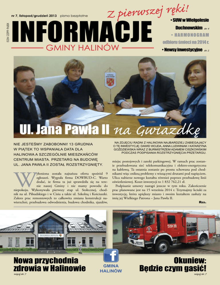 ! i k ę r j e z s w r e Z pi INFORMACJE ISSN 2299-968X nr 7, listopad/grudzień 2013 pismo bezpłatne GMINY HALINÓW • SUW w Wielgolesie Duchnowskim str. 4 • HARMONOGRAM odbioru śmieci na 2014 r. • Newsy inwestycyjne str. 2 Ul. Jana Pawła II na Gwiazdkę Nie jesteśmy zabobonni! 13 grudnia w piątek to wspaniała data dla Halinowa a szczególnie mieszkańców centrum miasta. Przetarg na budowę ul. Jana Pawła II został rozstrzygnięty. W yłoniona została najtańsza oferta spośród 9 zgłoszeń. Wygrała firma DOWBUD-C. Warto dodać, że firma ta już sprawdziła się na terenie naszej Gminy i nie mamy powodu do niepokoju. Wykonywała pierwszy etap ul. Stołecznej, chodnik na ul. Piłsudskiego i w Cisiu a także ul. Szkolną i Kościuszki. Zakres prac remontowych to całkowita zmiana konstrukcji nawierzchni, przebudowa odwodnienia, budowa chodnika, zjazdów, Nowa przychodnia zdrowia w Halinowie więcej str. 7 Na zdjęciu radni z Halinowa najbardziej zabiegający o tę inwestycję: Dawid Wojda, Anna Ludwiniak i Katarzyna Goździewska wraz z burmistrzem Adamem Ciszkowskim podczas podpisania rozstrzygnięcia przetargu. miejsc postojowych i zatoki parkingowej. W ramach prac zostanie przebudowana sieć telekomunikacyjna i elektro-energetyczna na kablową. Ta ostatnia zostanie po prostu schowana pod chodnikami więc znikną problemy z wiszącymi drutami pod napięciem. Ulica nabierze nowego kształtu również poprzez przebudowę linii oświetleniowej. Koszt inwestycji to 1 832 762,21 zł. Podpisanie umowy nastąpi jeszcze w tym roku. Zakończenie prac planowane jest na 15 września 2014 r. Trzymajmy kciuki za inwestycję, która upiększy miasto i swoim kształtem zasłuży na imię jej Wielkiego Patrona – Jana Pawła II. Gmina HALINÓW Red. Okuniew: Będzie czym gasić! więcej str. 7 INFORMACJE Newsy inwestycyjne GMINY HALINÓW Fot. GCK Kanalizacja w Okuniewie Trwa największe tegoroczne zadanie inwestycyjne w gminie – budowa kanalizacji w Okuniewie. Zadanie wykonuje spółka „Eko-Inwestycja”, jej wartość to ponad 7,5 mln zł, a środki na realizację pochodzą z Funduszu Spójności. W ramach zadania odtwarzane są drogi na całej szerokości jezdni zgodnie z warunkami narzuconymi przez Gminę Halinów. Chodnik w Michałowie INFORMACJE GMINY HALINÓW pismo urzędu miejskiego w halinowie Wydawca: Gminne Centrum Kultury ul. Rynek 46/2, 05-079 Okuniew e-mail: [email protected] REDAKTOR NACZELNY: Dariusz Kowalczyk ZESPÓŁ: pracownicy GCK SKŁAD i ŁAMANIE: GCK NAKŁAD: 6 tys. ezgemplarzy pismo bezpłatne REKLAMA: tel. 0-693-038-770 Redakcja nie zwraca tekstów niezamówionych i nie gwarantuje ich publikacji. Zastrzegamy sobie prawo do dokonywania skrótów i korekty językowej. Za informacje zawarte w reklamach redakcja nie odpowiada. Przykładem może być odtworzenie ulicy Szkolnej w Okuniewie. Dzięki staraniom Gminy Spółka „Eko-Inwestycja” wystąpiła do WFOŚ o rozszerzenie zakresu budowy kanalizacji w Okuniewie o ulice: 1 Maja (wraz z ulicą wewnętrzną od 1 Maja), Południowa, Działkowa, Jeździecka, Ułańska, Zacisze, Kozacka, Husarii, Sosnowa, Projektowana, dokończenie Lipowej, dokończenie Konopnickiej, dokończenie Szkolnej wraz z dwoma ulicami wewnętrznymi, Stokrotki, Zielna. Dodatkowo będzie to ok. 4196 m sieci o wartości inwestycji ok. 3 052 608,19 zł. Zakres ulic został wybrany na podstawie wytycznych programu Infrastruktura i Środowisko, gdzie wymagany wskaźnik koncentracji mieszkańców to minimum 120 mieszkańców na 1 kilometr sieci. Chodnik w Cisiu Od szkoły w Cisiu do stacji kolejowej wreszcie można bezpiecznie chodzić. W tym roku zakończyła się pierwsza część tego jakże ważnego zadania inwestycyjnego. Wykonawcą była firma DOWBUD-C, która za 586 906, 85 zł wykonała chodnik. W nowym roku będzie wykonany II etap tego zadania, a więc budowa chodnika od stacji kolejowej do drogi krajowej nr 2. Chodnik w Michałowie – drugi etap w nowym roku W tym roku Gmina Halinów wybudowała 864 metry chodnika przy drodze wojewódzkiej 637. Materiały na to zadanie zostały przekazane przez Mazowiecki Zarząd Dróg Wojewódzkich w Warszawie, a gmina 2 oświetlenie na ul. Osiedlowej w Długiej szlacheckiej wybrała wykonawcę – Z.U.T.H. Stanisław Czerepiński z Mińska Maz. W przyszłym roku II etap budowy. Oświetlenie ulic Jak co roku Gmina przeznacza duże środki finansowe na budowę oświetlenia na swoim terenie. W 2013 roku wydatkowano na ten cel ok. 300 tys. zł. W zakres prac wchodziło postawienie słupów, montażu linii i opraw oświetleniowych. Prace wykonywano w następujących miejscowościach: Żwirówce, Wielgolesie Duchnowskim na dz. 111 – etap I – na odcinku od działki nr 65 do działki nr 100, Hipolitowie na ul. Cisowej, Józefinie na ul. Zgody, Halinowie na ul. Wschodniej i ul. Cichej, Długiej Szlacheckiej na ul. Osiedlowej. Dodatkowo wykonano montaż linii i opraw oświetleniowych na istniejących słupach w następujący miejscowościach: Nowym Koniku na ul. Podleśnej i na ul. Brzezińskiej, Długiej Kościelnej na ul. Polnej, Wielgolesie Duchnowskim na ul. Sportowej, Cisiu na ul. Wiatracznej. Chodnik w cisiu Fot. GCK Budowa ul. Spółdzielczej w Halinowie Nowy odcinek ul. Spółdzielczej od Piłsudskiego do Okuniewskiej już służy mieszkańcom. Wykonawcą budowy była firma BUDBET. W zakres robót weszły: wykonanie nawierzchni jezdni, chodnika, zjazdów oraz trawników. Za całą inwestycję Urząd Miejski zapłacił 416 742,29 zł. Fot. GCK Nigdy w historii naszej gminy nie wykonano tylu inwestycji, co w tym roku. poniżej przedstawiamy te, które oddano do użytku w ostatnim okresie. INFORMACJE GMINY HALINÓW Ul. Stołeczna oficjalnie otwarta 6 grudnia odbyło się oficjalne otwarcie przebudowanej ul. Stołecznej w Józefinie. Przecięcia wstęgi dokonali m.in. Starosta Miński Antonii Jan Tarczyński i Burmistrz Halinowa Adam Ciszkowski. Fot. GCK D Przecięcie wstęgi to bardzo miły moment. r