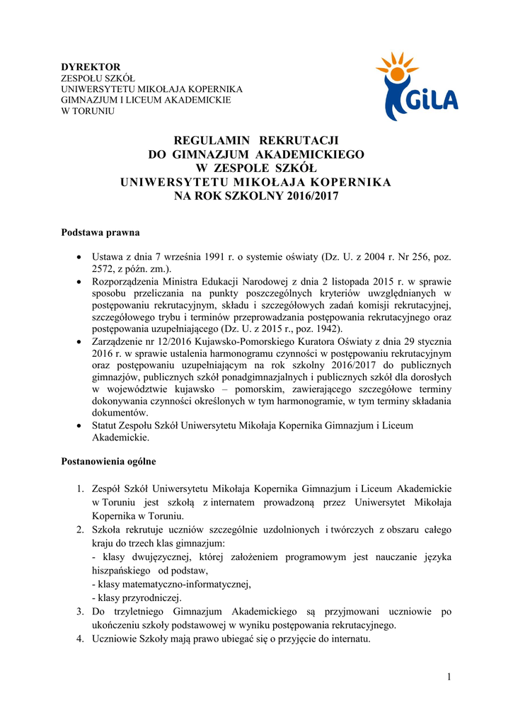 DYREKTOR ZESPOŁU SZKÓŁ UNIWERSYTETU MIKOŁAJA KOPERNIKA GIMNAZJUM I LICEUM AKADEMICKIE W TORUNIU REGULAMIN REKRUTACJI DO GIMNAZJUM AKADEMICKIEGO W ZESPOLE SZKÓŁ UNIWERSYTETU MIKOŁAJA KOPERNIKA NA ROK SZKOLNY 2016/2017 Podstawa prawna Ustawa z dnia 7 września 1991 r. o systemie oświaty (Dz. U. z 2004 r. Nr 256, poz. 2572, z późn. zm.). Rozporządzenia Ministra Edukacji Narodowej z dnia 2 listopada 2015 r. w sprawie sposobu przeliczania na punkty poszczególnych kryteriów uwzględnianych w postępowaniu rekrutacyjnym, składu i szczegółowych zadań komisji rekrutacyjnej, szczegółowego trybu i terminów przeprowadzania postępowania rekrutacyjnego oraz postępowania uzupełniającego (Dz. U. z 2015 r., poz. 1942). Zarządzenie nr 12/2016 Kujawsko-Pomorskiego Kuratora Oświaty z dnia 29 stycznia 2016 r. w sprawie ustalenia harmonogramu czynności w postępowaniu rekrutacyjnym oraz postępowaniu uzupełniającym na rok szkolny 2016/2017 do publicznych gimnazjów, publicznych szkół ponadgimnazjalnych i publicznych szkół dla dorosłych w województwie kujawsko – pomorskim, zawierającego szczegółowe terminy dokonywania czynności określonych w tym harmonogramie, w tym terminy składania dokumentów. Statut Zespołu Szkół Uniwersytetu Mikołaja Kopernika Gimnazjum i Liceum Akademickie. Postanowienia ogólne 1. Zespół Szkół Uniwersytetu Mikołaja Kopernika Gimnazjum i Liceum Akademickie w Toruniu jest szkołą z internatem prowadzoną przez Uniwersytet Mikołaja Kopernika w Toruniu. 2. Szkoła rekrutuje uczniów szczególnie uzdolnionych i twórczych z obszaru całego kraju do trzech klas gimnazjum: - klasy dwujęzycznej, której założeniem programowym jest nauczanie języka hiszpańskiego od podstaw, - klasy matematyczno-informatycznej, - klasy przyrodniczej. 3. Do trzyletniego Gimnazjum Akademickiego są przyjmowani uczniowie po ukończeniu szkoły podstawowej w wyniku postępowania rekrutacyjnego. 4. Uczniowie Szkoły mają prawo ubiegać się o przyjęcie do internatu. 1 5. Postępowanie rekrutacyjne przeprowadza Komisja Rekrutacyjna powołana przez Dyrektora Zespołu Szkół Uniwersytetu Mikołaja Kopernika Gimnazjum i Liceum Akademickie w Toruniu. 6. Szkoła ogłasza zasady postępowania rekrutacyjnego na stronie internetowej www.gimakad.torun.pl do 29 lutego 2016 r. Procedura rekrutacji 1. Wymagane dokumenty: a. Wniosek o przyjęcie do Gimnazjum Akademickiego (formularz wniosku należy pobrać ze strony internetowej www.gimakad.torun.pl lub w sekretariacie Szkoły). b. Zgłoszenie kandydata do udziału w sprawdzianie predyspozycji językowych do klasy dwujęzycznej Gimnazjum Akademickiego (formularz zgłoszenia należy pobrać ze strony internetowej www.gimakad.torun.pl lub w sekretariacie Szkoły). c. Świadectwo ukończenia szkoły podstawowej. d. Dokumenty potwierdzające osiągnięcia w konkursach przedmiotowych. e. Zaświadczenie o wynikach sprawdzianu w szkole podstawowej wydane przez odpowiednią OKE. f. Deklaracja wyboru (formularz deklaracji wyboru należy pobrać ze strony internetowej www.gimakad.torun.pl lub w sekretariacie Szkoły). g. Dwa zdjęcia legitymacyjne. h. Oraz w przypadku: wielodzietności rodziny kandydata - pisemne oświadczenie rodzica, niepełnosprawności kandydata - orzeczenie o potrzebie kształcenia specjalnego ze względu na niepełnosprawność, niepełnosprawności jednego z rodziców kandydata - orzeczenie o niepełnosprawności wydane przez powiatowy lub wojewódzki zespół orzekający o niepełnosprawności, niepełnosprawności obojga rodziców kandydata - orzeczenie o niepełnosprawności wydane przez powiatowy lub wojewódzki zespół orzekający o niepełnosprawności, niepełnosprawności rodzeństwa kandydata - orzeczenie o niepełnosprawności wydane przez powiatowy lub wojewódzki zespół orzekający o niepełnosprawności, samotnego wychowywania kandydata w rodzinie - prawomocny wyrok sądu rodzinnego orzekający rozwód/separację lub akt zgonu oraz oświadczenie o samotnym wychowywaniu dziecka i niewychowywaniu żadnego dziecka wspólnie z jego rodzicem, objęcie kandydata pieczą zastępczą - decyzja z MOPS o przyznaniu świadczenia z tytułu rodziny zastępczej. 2 Rodzice lub prawni opiekunowie kandydata składają wypełniony formularz wniosku oraz wypełniony formularz zgłoszenia (dotyczy klasy dwujęzycznej) do Gimnazjum Akademickiego w sekretariacie Szkoły lub przesyłają na adres: Zespół Szkół Uniwersytetu Mikołaja Kopernika Gimnazjum i Liceum Akademickie 87-100 Toruń, ul. Szosa Chełmińska 83, - od dnia 25 kwietnia 2016 r. (poniedziałek) do dnia 11 maja 2016 r. (środa) do klasy dwujęzycznej. (do godz. 15.00) tel. kontaktowy (56) 655-55-60 fax (56) 655-52-53. - od 11 maja 2016 r. (środa) do dnia 10 czerwca 2015 r. (piątek) do klasy matematycznoinformatycznej i przyrodniczej (do godz.15.00) tel. kontaktowy (56) 655-55-60 fax (56) 655-52-53. 2. Postępowanie rekrutacyjne: a. Komisja Rekrutacyjna powołana przez dyrektora Zespołu Szkół Uniwersytetu Mikołaja Kopernika Gimnazjum i Liceum Akademickie dokonuje formalnej weryfikacji złożonych wniosków. b. Komisja Rekrutacyjna analizuje osiągnięcia kandydatów obejmujące wyniki sprawdzianu w klasie szóstej szkoły podstawowej, wynik sprawdzianu predyspozycji językowych do klasy dwujęzycznej gimnazjum, aktywność i odniesione sukcesy w konkursach przedmiotowych, szkolnych i pozaszkolnych. c. Przy naborze kandydatów spoza województwa kujawsko-pomorskiego uwzględniane są konkursy przedmiotowe na szczeblu wojewódzkim ustalone przez właściwego Kuratora Oświaty dla szkoły, do której uczęszczał kandydat. d. Komisja ustala system punktowy obejmujący: - wyniki sprawdzianu w klasie szóstej, - sukcesy ucznia w konkursach przedmiotowych na szczeblu wojewódzkim ustalone przez właściwego Kuratora Oświaty dla szkoły, do której uczęszczał kandydat, - ocenę zachowania, - świadectwo ukończenia szkoły podstawowej z wyróżn