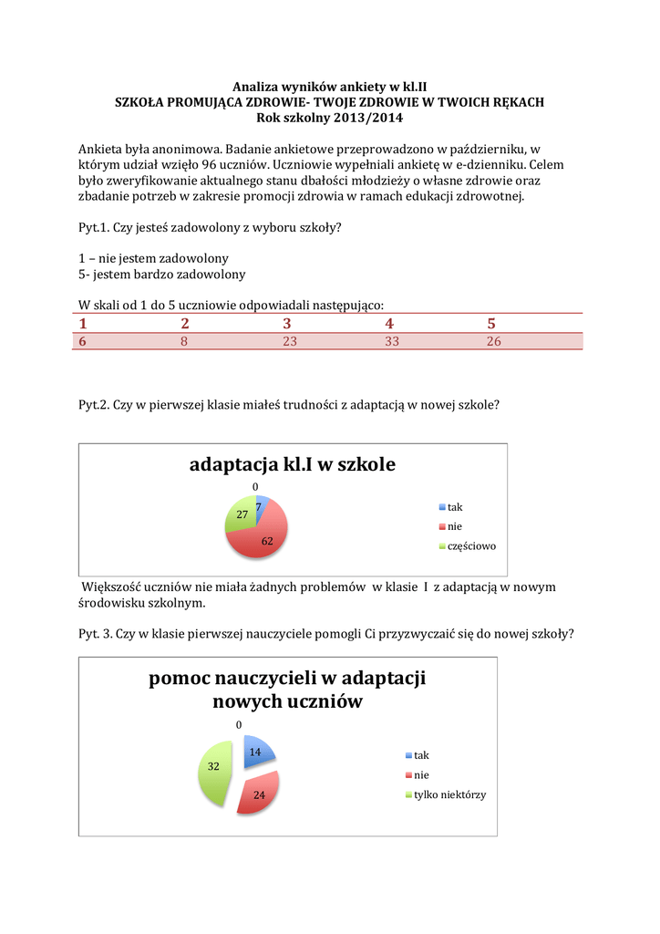 Analiza wyników ankiety w kl.II SZKOŁA PROMUJĄCA ZDROWIE- TWOJE ZDROWIE W TWOICH RĘKACH Rok szkolny 2013/2014 Ankieta była anonimowa. Badanie ankietowe przeprowadzono w październiku, w którym udział wzięło 96 uczniów. Uczniowie wypełniali ankietę w e-dzienniku. Celem było zweryfikowanie aktualnego stanu dbałości młodzieży o własne zdrowie oraz zbadanie potrzeb w zakresie promocji zdrowia w ramach edukacji zdrowotnej. Pyt.1. Czy jesteś zadowolony z wyboru szkoły? 1 – nie jestem zadowolony 5- jestem bardzo zadowolony W skali od 1 do 5 uczniowie odpowiadali następująco: 1 2 3 4 5 6 8 23 33 26 Pyt.2. Czy w pierwszej klasie miałeś trudności z adaptacją w nowej szkole? adaptacja kl.I w szkole 0 27 7 tak nie 62 częściowo Większość uczniów nie miała żadnych problemów w klasie I z adaptacją w nowym środowisku szkolnym. Pyt. 3. Czy w klasie pierwszej nauczyciele pomogli Ci przyzwyczaić się do nowej szkoły? pomoc nauczycieli w adaptacji nowych uczniów 0 14 32 tak nie 24 tylko niektórzy Pyt.4. Ile czasu w ciągu dnia poświęcasz na sen? więcej niż 10 godz 8-10 godz 6-8 godz 4-6 godz 0 10 20 30 40 50 60 70 Najwięcej uczniów ( 58) potrzebuje od 6 do 8 godzin na wypoczynek – sen. Pyt. 5. Ile czasu w ciągu dnia poświęcasz na pracę przy komputerze? więcej niż 4 godz 2 2-4 godz 23 1-2 godz 35 0 godz czas pracy ucznia przy komputerze 3 0 10 20 30 40 W ciągu dnia uczeń wykorzystuje najczęściej do 2 godz pracy przy komputerze ( 35 wskazań) Pyt. 6. Ile czasu w ciągu dnia poświęcasz na odrabianie pracy domowej? więcej niż 4 godz 2-4 godz 4 1-2 godz czas ucznia na odrabianie pracy domowej 49 mniej niż godz 34 0 20 40 60 Badanie wykazało, że uczniowie poświęcają na pracę domową najczęściej ok 2 godzin dziennie. Pyt.7. Czy atmosfera panująca w szkole pozwala Ci czuć się bezpiecznie? atmosfera w szkole a bezpieczeństwo 0 8 5 tak nie 68 czasami Według większości ankietowanych uczniów ( 68) atmosfera w naszej szkole pozwala czuć się bezpiecznie. Pyt. 8. Czy jadasz w szkole drugie śniadanie? czy uczeń zjada drugie śniadanie w szkole 0 20 tak nie 12 nie zawsze 64 Zdecydowana większość uczniów ( 64) zjada w szkole drugie śniadanie. Pyt.9. Oceń swoje relacje z innymi uczniami w szkole. Uczniowie mieli określić swoje relacje w skali od 1 do 5. 1- zdecydowanie złe 5- zdecydowanie dobre 1 2 3 4 5 0 2 18 50 26 Zdecydowana większość ankietowanych uczniów ( 50 wskazań) uważa, że ich relacje z innymi rówieśnikami są dobre. Pyt. 10. Oceń swoje relacje z nauczycielami. Uczniowie mieli określić swoje relacje w skali od 1 do 5. 1- zdecydowanie złe 5- zdecydowanie dobre 1 2 3 4 5 2 8 27 43 16 Pyt. 11. Oceń swoje relacje z wychowawcą. Uczniowie mieli określić swoje relacje w skali od 1 do 5. 1- zdecydowanie złe 5- zdecydowanie dobre 1 2 3 4 5 2 4 18 36 36 Pyt. 12. Czy palisz papierosy? 90 80 80 70 60 50 Czy palisz papierosy 40 Kolumna1 30 20 10 12 4 0 tak nie czasami Cieszy fakt, że większość badanych uczniów( 80) odpowiedziała, że nie pali papierosów. Pyt. 13. Czy zdarza Ci się pić alkohol? 50 45 40 35 30 25 20 15 10 5 0 45 26 25 Czy zdarza Ci się pić alkohol? tak nie czasami Wyniki pokazują, że niemal 1/3 uczniów zdarza się pić alkohol, ale 50% badanych sięga po niego czasami. Pyt. 14. Czy próbowałeś zażywać narkotyków? Czy próbowałeś zażywać narkotyków? 00 9 tak nie 87 Zdecydowana większość badanych uczniów ( 87) nie próbowała zażywać narkotyków. Pyt. 15. Czy zetknąłeś się w naszej szkole z przemocą? 0 Czy zetknąłeś się w naszej szkole 0 z przemocą? 23 tak 73 nie Pyt. 16. Jeśli w poprzednim pytaniu odpowiedziałeś TAK, to czy byłeś świadkiem, sprawcą czy ofiarą? Uczeń a Przemoc 0 5 ofiara 13 sprawca 5 świadek Pyt. 17. Odzwierciedlenie poczucia ucznia w szkole: Poczucie ucznia w szkole 14 27 zestresowany 42 znudzony 12 bezpiecznie 59 49 doceniony lubiany przez rówieśników 29 samotny sprawiedliwie oceniany 6 niesprawiedliwie oceniany Wyniki wskazują, że uczniowie w szkole czują się najczęściej znudzeni, zestresowani, ale lubiani przez kolegów i koleżanki. Pyt. 18. Jaka tematyka edukacji zdrowotnej Cię interesuje? wybór tematyki warsztatów przez uczniów zdrowe odżywianie 21 profilaktyka uzależnień 29 41 zapobieganie HIV/AIDS 26 14 23 47 40 choroby przenoszone drogą płciową fakty i mity o antykoncepcji radzenie sobie ze stresem aktywność fizyczna autoprezentacja W zakresie edukacji zdrowotnej uczniowie chcieliby poszerzyć swoją wiedzę na temat umiejętności radzenia sobie w sytuacjach trudnych ( 47) oraz korzyści płynących z aktywności fizycznej ( 41) a także odnośnie faktów i mitów na temat antykoncepcji ( 40).