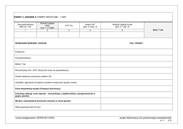 PAKIET 3, ZADANIE A: POMPY INFUZYJNE – 7 SZT. Cena jednostkowa netto za 1 szt. 1 Wartość ogółem netto (poz. 1 x 7 szt.) 2 VAT (%) Kwota VAT (poz. 2 x poz. 3) Wartość ogółem brutto (poz. 2 + poz. 4) 3 4 5 WYMAGANE WARUNKI OGÓLNE Ilość: 7 szt. TAK / OPISAĆ * Producent: Kraj pochodzenia: Model / Typ: Rok produkcji (min 2016 fabrycznie nowy nie powystawowy): Wyrób medyczny oznaczony znakiem CE Certyfikat, zgłoszenie do rejestru wyrobów medycznych (podać numer): Karta eksploatacji sprzętu (Paszport techniczny) Instrukcja obsługi, menu aparatu – komunikacja z użytkownikiem, oprogramowanie w języku polskim: Montaż i przeszkolenie personelu wliczone w cenie aparatu: Okres gwarancji (min 24 mc): numer postępowania: ZP/PN/18/11/2016 podpis Wykonawcy lub uprawnionego przedstawiciela s tr . 49 Termin realizacji zamówienia (wymagane do 21 dni) Aparatura kompletna, tj. gotowa do eksploatacji (bez żadnych dodatkowych inwestycji ze strony Zamawiającego). W cenie oferty wliczona instalacja, montaż oraz szkolenie personelu obsługującego W okresie gwarancji Wykonawca ponosi 100% kosztów serwisowania wraz z częściami zamiennymi. Bieg okresu gwarancji rozpoczyna się od dnia przekazania zakresu umownego Użytkownikowi: W trakcie okresu gwarancji przeglądy wliczone są w cenę oferty (łącznie z dojazdem i wszystkimi kosztami wraz z częściami zamiennymi): Możliwość zgłaszania usterek 24 godz. na dobę: Okres gwarancji dla nowo zainstalowanych elementów po naprawie (min. 12 miesięcy, podać w miesiącach lub latach): Czas reakcji serwisu na zgłoszenie usterki (max 48 godz. podać w godzinach) Czas oczekiwania na usunięcie uszkodzenia w dniach od daty zgłoszenia (podać maksymalnie w godzinach lub dniach): Liczba napraw gwarancyjnych danego elementu lub podzespołu uprawniająca do wymiany go na nowy (podać maksymalnie ilość niezależnie od rodzaju naprawy): Okres zagwarantowania dostępności serwisu, części zamiennych i oprogramowania od daty sprzedaży/zainstalowania w latach (min. 10 lat podać w latach): Autoryzacja od producenta na sprzedaż i serwis urządzenia na terenie Polski: Lokalizacja punktu/ów serwisowych zapewniający serwis gwarancyjny i pogwarancyjny zgodnie z Rozdział 11 - ustawa o wyrobach medycznych z dnia 20.05.2010 r. - Dz. U. z 2015 poz. 876; (wymienić): Inne (warunki gwarancji i serwisu pogwarancyjnego nie ujęte w wykazie powyżej): numer postępowania: ZP/PN/18/11/2016 podpis Wykonawcy lub uprawnionego przedstawiciela s tr . 50 Lp. 1. Parametry graniczne Wymagane Parametry oferowane (podać zakresy lub opisać) 2. 3. 4. 1 Stosowanie strzykawek 5, 10, 20, 30, 50 ml. Podać typ i producenta TAK 2 Wysokość pompy zapewniająca wygodną obsługę do 8 pomp, zamocowanych jedna nad drugą - maks 12 cm TAK 3 Strzykawki montowane od czoła a nie od góry pompy. TAK 4 Ramię pompy nie wychodzące poza obudowę pompy. TAK 5 Szybkość dozowania w zakresie 0,1-1800 ml/h TAK 6 Szybkość dozowania Bolus-a do 2000 ml/h TAK 7 Bolus manualny i automatyczny TAK 8 Programowanie parametrów podaży Bolus-a: objętość / dawka czas lub szybkość podaży TAK 9 Zmiana parametrów Bolus-a bez wstrzymywania infuzji TAK 10 Możliwość programowania podaży dawki indukcyjnej: 1. objętość / dawka 2. czas lub szybkość podaży TAK numer postępowania: ZP/PN/18/11/2016 podpis Wykonawcy lub uprawnionego przedstawiciela s tr . 51 11 Programowanie parametrów infuzji w jednostkach: ng, μg, mg, μU, mU, U, kU, jednostki molowe na kg wagi ciała lub nie, na min, godz. dobę. TAK 12 Klawiatura numeryczna do wprowadzania wartości parametrów infuzji TAK 13 Biblioteka leków – możliwość zapisania w pompie procedur dozowania leków złożonych z: nazwy leku koncentracji leku szybkości dozowania (dawkowanie) całkowitej objętości (dawki) infuzji parametrów bolusa (objętości / dawki i czasu podaży) parametrów dawki indukcyjnej (jak dla bolusa) Pojemność biblioteki co najmniej 120 leków TAK 14 Możliwość programowania biblioteki leków bezpośrednio z klawiatury pompy (bez konieczności stosowania zewnętrznego urządzenia) TAK 15 Dostępność oprogramowania komputerowego do tworzenia i przesyłania do pompy biblioteki leków (pod systemem Windows) TAK 16 Regulowane progi ciśnienia w zakresie od 50 do 1000 mm Hg , min. 10 poziomów okluzji TAK 17 Zmiana progu ciśnienia okluzji bez przerywania infuzji. TAK 18 Automatyczna redukcja bolusa okluzyjnego. TAK numer postępowania: ZP/PN/18/11/2016 podpis Wykonawcy lub uprawnionego przedstawiciela s tr . 52 I. II. III. IV. 19 V. VI. VII. VIII. IX. Rozbudowany system alarmów: 5 min do opróżnienia strzykawki pusta strzykawka 5 min do końca infuzji koniec infuzji nieprawidłowe mocowanie strzykawki okluzja 30 min do rozładowania akumulatora akumulator rozładowany pompa uszkodzona TAK 20 Historia obejmująca 2000 wpisów z datą i godziną zdarzenia TAK 21 Czas pracy z akumulatora min. 20 h przy infuzji 5ml/h TAK 22 Czas ładowania akumulatora do 100% po pełnym rozładowaniu - poniżej 5 h TAK 23 Mocowanie pojedynczej pompy do statywów oraz stacji dokujących nie wymaga odłączania lub dołączania uchwytu mocującego lub jakichkolwiek innych części. TAK 24 Uchwyt do przenoszenia pompy nie wymagający odłączania przy mocowaniu pomp w stacjach dokujących. TAK 25 Możliwość instalacji pompy w stacji dokującej: mocowanie z automatyczną blokadą, bez konieczności przykręcania. alarm nieprawidłowego mocowania. pompy mocowane niezależnie, jedna nad drugą, automatyczne przyłączenie zasilania ze stacji dokującej, automatyczne przyłączenie portu komunikacyjnego ze stacji dokującej, TAK numer postępowania: ZP/PN/18/11/2016 podpis Wykonawcy lub uprawnionego przedstawiciela s tr . 53 26 Możliwość komunikacji pomp umieszczonych w stacjach dokujących poprzez sieć LAN z oprogramowaniem zewnętrznym, służącym do: podglądu przebiegu infuzji dla każdej pompy w formie graficznego