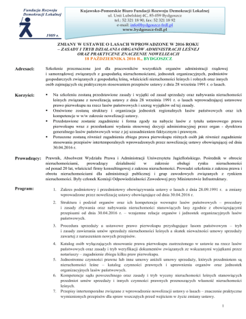 Kujawsko-Pomorskie Biuro Fundacji Rozwoju Demokracji Lokalnej ul. Unii Lubelskiej 4C, 85-059 Bydgoszcz tel.: 52 321 18 90, fax: 52 321 18 92 e-mail: [email protected] www.bydgoszcz-frdl.pl ZMIANY W USTAWIE O LASACH WPROWADZONE W 2016 ROKU – ZASADY I TRYB DZIAŁANIA ORGANÓW ADMINISTRACJI LEŚNEJ ORAZ PRAKTYCZNE ZNACZENIE NOWELIZACJI 18 PAŹDZIERNIKA 2016 R., BYDGOSZCZ Adresaci: Szkolenie przeznaczone jest dla pracowników wszystkich organów administracji rządowej i samorządowej związanych z gospodarką nieruchomościami, jednostek organizacyjnych, podmiotów gospodarczych związanych z gospodarką leśną, właścicieli nieruchomości leśnych i rolnych oraz innych osób zajmujących się praktycznym stosowaniem przepisów ustawy z dnia 28 września 1991 r. o lasach. Korzyści: Na szkoleniu zostaną przedstawione zasady i wyjątki od zasad sprzedaży oraz nabywania nieruchomości leśnych związane z nowelizacją ustawy z dnia 28 września 1991 r. o lasach wprowadzającej ustawowe prawo pierwokupu na rzecz lasów państwowych i szereg wyjątków od tej zasady. Omówione zostaną struktury i organizacja jednostek regionalnych lasów państwowych oraz ich kompetencje w w/w zakresie nowelizacji ustawy. Przedstawione zostanie zagadnienie i forma zgody na nabycie lasów z tytułu ustawowego prawa pierwokupu wraz z przesłankami wydania stosownej decyzji administracyjnej przez organ - dyrektora generalnego lasów państwowych wraz z jej uzasadnieniem faktycznym i prawnym. Poruszone zostaną również zagadnienia zbiegu prawa pierwokupu różnych osób jak również zagadnienie stosowania przepisów intertemporalnych wprowadzonych przez nowelizację ustawy obowiązującej od dnia 30.04.2016 r. Prowadzący: Prawnik, Absolwent Wydziału Prawa i Administracji Uniwersytetu Jagiellońskiego. Pośrednik w obrocie nieruchomościami, prowadzący działalność w zakresie obsługi rynku nieruchomości od ponad 20 lat, właściciel firmy konsultingowej z zakresu nieruchomości. Prowadzi szkolenia z zakresu prawa i obrotu nieruchomościami dla administracji publicznej i grup zawodowych związanych z rynkiem nieruchomości. Były członek Komisji Odpowiedzialności Zawodowej przy Ministerstwie Infrastruktury. Program: 1. Zakres podmiotowy i przedmiotowy obowiązywania ustawy o lasach z dnia 28.09.1991 r. a zmiany wprowadzone przez nowelizację ustawy obowiązujące od dnia 30.04.2016 r. 2. Struktura i podział organów oraz ich kompetencje wewnątrz lasów państwowych – procedury i zasady zbywania oraz nabywania nieruchomości stanowiących lasy zgodnie z obowiązującymi przepisami od dnia 30.04.2016 r. – wzajemne relacje organów i jednostek organizacyjnych lasów państwowych. 3. Procedura sprzedaży a ustawowe prawo pierwokupu przysługujące lasom państwowym – tryb i zasady zawierania umów sprzedaży nieruchomości leśnych a skutek nieważności umowy sprzedaży zawartej z naruszeniem nowych przepisów. 4. Katalog osób wyłączających stosowanie prawa pierwokupu zastrzeżonego w ustawie na rzecz lasów państwowych oraz zasady i tryb weryfikacji dokumentów związanych ze wskazanymi wyjątkami przez notariuszy – zagadnienie zbiegu kilku praw pierwokupu. 5. Jednostronne czynności prawne lub inne umowy aniżeli umowy sprzedaży, których przedmiotem są nieruchomości leśne – katalog czynności prawnych i uprawnienia organów oraz jednostek organizacyjnych lasów państwowych. 6. Kompetencje sądu powszechnego oraz zasady i tryb wyceny nieruchomości leśnych stanowiących przedmiot umów sprzedaży i innych czynności prawnych przenoszących własność nieruchomości leśnych. 7. Przepisy intertemporalne związane z wprowadzenie nowelizacji ustawy o lasach – znaczenie praktyczne wymienionych przepisów dla spraw wszczętych przed wejściem w życie zmiany ustawy. 1 Kujawsko-Pomorskie Biuro Fundacji Rozwoju Demokracji Lokalnej ul. Unii Lubelskiej 4C, 85-059 Bydgoszcz tel.: 52 321 18 90, fax: 52 321 18 92 e-mail: [email protected] www.bydgoszcz-frdl.pl Godziny szkolenia: INFORMACJE ORGANIZACYJNE 10.00 - 15:00 Miejsce szkolenia: BYDGOSZCZ - Kujawsko-Pomorskie Biuro FRDL, ul. Unii Lubelskiej 4C (II piętro – budynek Bydgoskiej Szkoły Wyższej) Bezpłatny parking na terenie obiektu. 5 min od Dworca PKP Bydgoszcz Główna. Cena*: 305 zł przy zgłoszeniu do 11 października (cena uwzględnia rabat w wysokości 10 % od ceny podstawowej za szkolenie, wynoszącej 339zł) W cenie szkolenia: materiały szkoleniowe, certyfikat ukończenia szkolenia, przerwy kawowe oraz lunch. Uwaga! Szkolenie zwolnione z VAT w przypadku finansowania ze środków publicznych. Płatność po szkoleniu – przelewem po otrzymaniu FV. RABATY OD CENY PODSTAWOWEJ wynoszącej 339 zł netto 10 % dla uczestników zgłoszonych na 7 dni przed terminem szkolenia Rabaty nie łączą się. 10 % dla uczestników z tej samej instytucji za drugą i kolejne osoby zgłoszone na to samo szkolenie niezależnie od terminu zgłoszenia 10 % dla uczestników z instytucji zrzeszonych w Konwencie Wójtów. 15% dla uczestników z instytucji zrzeszonych w Kujawsko-Pomorskich Forach Zgłoszenia przyjmujemy do 14 PAŹDZIERNIKA w postaci wypełnionej karty zgłoszeniowej przesłanej na adres mailowy: [email protected] lub faksem na numer 52 321 18 92. Szkolenia realizujemy również w formie zamkniętej. Zapytania w tym zakresie prosimy przesyłać na adres: [email protected] 2 Kujawsko-Pomorskie Biuro Fundacji Rozwoju Demokracji Lokalnej ul. Unii Lubelskiej 4C, 85-059 Bydgoszcz tel.: 52 321 18 90, fax: 52 321 18 92 e-mail: [email protected] www.bydgoszcz-frdl.pl FORMULARZ ZGŁOSZENIOWY ZMIANY W USTAWIE O LASACH... 18/10//1/K Nazwa Instytucji/Firmy (dane do FV): Adres: e-mail: NIP: Ilość osób zgłaszanych: tel./fax. Imiona i nazwiska uczestników: 1. 2. 3. 4. Zgodnie z Ustawą o Ochronie Danych Osobowych z dnia 29.08.1997 r. wyrażam zgodę na przetwarzanie moich danych osobowych dla potrzeb działalności szkoleniowej Kujawsko-P
