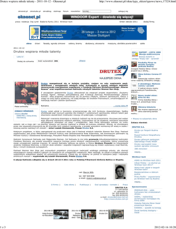 Drutex wspiera młode talenty - 2011-10-12 - Oknonet.pl 1z3 oknonet.pl oknotube.pl oknoblog stolmap forum http://www.oknonet.pl/okna/typy_okien/typowe/news,17324.html newsletter szukaj... zaloguj się Order Jakości 2011 praca redakcja Daj cynk! Badanie Rynku 2011 WinDoor-tech okna drzwi fasady, ogrody zimowe osłony, bramy dostawcy, akcesoria maszyny, obróbka powierzchni dodaj firmę szkło 2011-10-12 Drutex wspiera młode talenty RAPORT - LISTA 1000 Wersja elektroniczna Branża stolarki w zasięgu Twojej ręki - sprawdź! Lubię to! Dodaj do schowka Więcej Ilość wyświetleń: 201 Produkty Pinus na stoisku Związku podczas Budmy Związek Polskie Okna i Drzwi pojawił się z ofertą... Okna Schüco Corona CT 70 Dokonując wyboru okien coraz częściej zwracamy uwagę... Drutex zaangażował się w kolejne projekty, mające na celu wspieranie pasji, zamiłowań i umiejętności młodych ludzi. Inwestycje w rozwój młodych talentów zaowocowały nawiązaniem współpracy z Fundacją Dariusza Michalczewskiego „Równe Szanse” oraz współtworzeniem festiwalu młodych talentów Niemen Non Stop. Z początkiem października Drutex zdecydował się wesprzeć projekt stypendialny „Szukamy nowego Tigera”, którego pomysłodawcą jest Fundacja Dariusza Michalczewskiego „Równe Szanse”. Idea programu koncentruje się na pomocy młodym, zdolnym sportowcom, którzy z uwagi na swój status społeczny, nie mają dostępu do środków finansowych, umożliwiających im realizację marzeń i planów sportowych. fot. Niemen Non Stop Plakat archiwalny Reklama ZOBACZ RÓWNIEŻ: Drutex wziął udział w tworzeniu przeznaczonego dla nich funduszu stypendialnego. Spółka ufundowała pięć rocznych grantów dla młodych i uzdolnionych sportowców, których celem jest stworzenie zawodnikom możliwości rozwoju ich potencjału i umiejętności. OKNO-POL z nową stroną internetową ...czytaj dalej ▼ Potencjał i marzenia drzemiące w młodych ludziach są nie do przecenienia. Kluczowe jest wobec tego aktywne wspieranie młodych talentów, inspirowanie ich do działania, tworzenie warunków sprzyjających rozwojowi ich pasji i umiejętności. Jako firma odnosząca sukcesy na rynku stolarki, tak w kraju jak i za granicą, staramy się również wspierać w drodze do sukcesu młodzież. Wierzę, że ufundowane przez nas stypendia przyczynią się do triumfów tych młodych sportowców, a przede wszystkim wzmocnią ich wiarę w siebie i stworzą szanse realizacji ich marzeń – mówi Leszek Gierszewski, Prezes Drutex S.A. Kolejnym projektem, w który zaangażował się producent okien jest 6 festiwal młodych talentów Niemen Non Stop. Festiwal organizowany jest przez Młodzieżowe Centrum Kultury oraz Stowarzyszenie Nota Anamnesis, zaś honorowymi patronami są Minister Kultury i Dziedzictwa Narodowego, Prezydent Miasta Słupska oraz Marszałek Województwa Pomorskiego. Gościem honorowym festiwalu jest Małgorzata Niemen. Cel festiwalu to nie tylko promocja kilkudziesięcioletniej twórczości Czesława Niemena, ale przede wszystkim wsparcie licznego grona młodych utalentowanych wokalistów, którzy prezentują swoje umiejętności podczas imprezy. W ramach festiwalu odbywa się jedyny w Polsce Konkurs Piosenki na interpretacje utworów Czesława Niemena, w którym obok solistów i zespołów krajowych zaprezentują się młodzi wykonawcy znad Niemna, Renu i innych środowisk europejskich. Z oknoblogu: Mailowe wzloty i porażki Z jednej strony mamy zapracowanych handlowców, którym... Nowy model okien: Elite 92 Alu Firma Sokółka Okna i Drzwi S.A. prezentuje nowy model... Okienna biżuteria Nie można zaprzeczyć, że okna stanowią bardzo ważny... » Więcej na subportalu okna Zobacz również: DRUTEX S.A. Drutex po Targach Budma 2012 Ruszył konkurs fotograficzny Drutexu Drutex głównym partnerem Gdańskiego Finału WOŚP Drutex wprowadził nowy system ogrodów zimowych 385 milionów! Festiwal Niemen Non Stop jest niezwykłym projektem promującym twórczość wielkiego polskiego artysty, ale również stwarzającym szansę młodym ludziom na rozwijanie ich umiejętności wokalnych. Mam nadzieję, że udział w projekcie pozwoli uzdolnionym wokalistom spełnić ich artystyczne marzenia. Cieszę się, że możemy im pomóc w rozwijaniu pasji i niezwykle ambitnych marzeń – wypowiada się Leszek Gierszewski, Prezes Drutex S.A. 6 edycja festiwalu odbędzie się w dniach 20-22 X 2011 roku w Polskiej Filharmonii Sinfonia Baltica w Słupsku. więcej... WinDoor-tech AGAS na WinDoor-tech 2011 Urban Polska – co słychać po WinDoor-tech 2011? Warto brać udział w targach WinDoor-tech? red. Marcin Wilk Bezpieczeństwo w dobrym guście tel. 507 029 858 e-mail: [email protected] Primo Profile – wspomnienia po WinDoor-tech by Budma więcej... O firmie | Cała oferta | Publikacje | Sieć sprzedaży - kontakt | Praca DRUTEX S.A. 77-100 Bytów ul. Lęborska 31 tel. 059 8229101 fax 059 8229103 e-mail: [email protected] http://www.drutex.com.pl Sponsorowane PREMIUM ESG – szkło hartowane bez zniekształceń obrazu SOŻAL - najbardziej dynamicznie rozwijająca się firma 2009 Solecka Fabryka Okien Sożal prezentuje Spectus EJOSEAL – sposób na korozję 2011-06-22 2011-01-30 2011-01-05 Kulig Drutexu na Kaszubach Drutex Najlepsze okna - Gala Drutex S.A. Świat bardziej dostępny Sożal 2012-02-16 10:28 Drutex wspiera młode talenty - 2011-10-12 - Oknonet.pl 2z3 http://www.oknonet.pl/okna/typy_okien/typowe/news,17324.html Złote Kaczki o producentach okien Z oknoblogu: Mailowe wzloty i porażki Okienna biżuteria Okna modrzewiowe DAKO: odporność bez kompromisów Pozbud po targach BUDMA Obejrzyj film, jak powinny działać okna więcej... szerzej o oknach VEKA najlepsza? Eko-Okna uhonorowane tytułem Najwyższa Jakość 2011 Pierwsze spotkanie członków sieci Elwiz energeto Drutex powiększył moc produkcyjną Clement Steel Windows producent okien z Szlichtyngowej więcej... Okna Wniosek o upadło