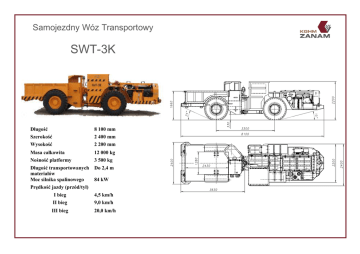 Samojezdny Wóz Transportowy SWT-3K Długość Szerokość Wysokość 8 100 mm 2 400 mm 2 200 mm Masa całkowita Nośność platformy Długość transportowanych materiałów Moc silnika spalinowego Prędkość jazdy (przód/tył) I bieg 12 000 kg 3 500 kg Do 2,4 m II bieg 9,0 km/h III bieg 20,0 km/h 84 kW 4,5 km/h