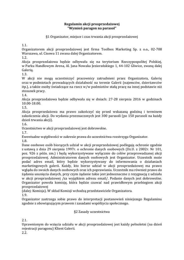 Regulamin akcji prosprzedażowej "Wymień paragon na parasol" §1 Organizator, miejsce i czas trwania akcji prosprzedażowej 1.1. Organizatorem akcji prosprzedażowej jest firma Toolbox Marketing Sp. z o.o., 02-708 Warszawa, ul. Cisowa 11 zwana dalej Organizatorem. 1.2. Akcja prosprzedażowa będzie odbywała się na terytorium Rzeczypospolitej Polskiej, w Parku Handlowym Arena, Al. Jana Nowaka Jeziorańskiego 1, 44-102 Gliwice, zwaną dalej Galerią. 1.3. W akcji nie mogą uczestniczyć pracownicy zatrudnieni przez Organizatora, Galerię oraz w podmiotach prowadzących działalność na terenie Galerii (najemców, dzierżawców itp.), a także osoby świadczące na rzecz w/w podmiotów stałą pracę na innej podstawie niż stosunek pracy. 1.4. Akcja prosprzedażowa będzie odbywała się w dniach: 27-28 sierpnia 2016 w godzinach 10.00-18.00. 1.5. Akcja prosprzedażowa ma prawo zakończyć się przed wskazaną godziną i terminem zakończenia akcji. Do wydania przeznaczonych jest 300 parasoli (po 150 parasoli na każdy dzień trwania akcji). 1.6. Uczestnictwo w akcji prosprzedażowej jest dobrowolne. 1.7. Ewentualne wątpliwości w zakresie prawa do uczestnictwa rozstrzyga Organizator. 1.8. Dane osobowe osób biorących udział w akcji prosprzedażowej podlegają ochronie zgodnie z ustawą z dnia 29 sierpnia 1997r. o ochronie danych osobowych (Dz.U. z 2002r. Nr 101, poz. 926 z późn. zm.) i będą wykorzystywane wyłącznie do celów przeprowadzanej akcji prosprzedażowej. Administratorem danych osobowych jest Organizator. Uczestnik może podać adres email, który będzie wykorzystywany do informowania o działaniach marketingowych galerii. Każdy, kto bierze udział w akcji prosprzedażowej ma prawo wglądu do swoich danych osobowych oraz ich poprawiania. Uczestnik ma również prawo do żądania usunięcia danych, przy czym żądanie takie jest jednoznaczne z rezygnacją z udziału w akcji prosprzedażowej /za wyjątkiem adresu email/. Podanie danych jest dobrowolne. Organizator powoła komisję, która będzie czuwać nad prawidłowym przebiegiem akcji prosprzedażowej (dalej: Komisja). W skład Komisji wchodzą przedstawiciele Organizatora. 1.9. Organizator zastrzega sobie prawo do interpretacji postanowień niniejszego Regulaminu zgodnie z obowiązującym prawem i zasadami współżycia społecznego. §2 Zasady uczestnictwa 2.1. Uprawnionym do wzięcia udziału w akcji prosprzedażowej jest każdy pełnoletni (na dzień rejestracji paragonu) Klient Galerii. 2.2. Warunkiem uczestnictwa w akcji prosprzedażowej jest, podpisanie umowy sprzedaży towarów lub usług u dowolnego najemcy lub zrobienie zakupów w dniu, w którym odbywa się akcja prosprzedażowa na terenie Centrum o minimalnej wartości 50,00 zł, z zastrzeżeniem, że na tę kwotę może się składać jeden paragon, z wykluczeniem paragonów ze sklepu Carrefour, kantorów, wpłatomatów, bankomatów i banków, napojów alkoholowych, wyrobów tytoniowych, produktów leczniczych (leków), kart podarunkowych, bonów i talonów podarunkowych, kart do telefonów prepaid, doładowania telefonów, usług sprzedaży zakładów na gry liczbowe, losów loterii pieniężnych, przekazanie paragonu hostessie oraz podanie danych o których mowa w § 2.3. 2.3. Uczestnik akcji zobowiązany jest do podania hostessie niezbędnych danych, tj. imienia, nazwiska, oraz dobrowolnie adresu e-mail i wyrażenia zgody na wykorzystanie i przetwarzanie danych osobowych Uczestnika do celów związanych z realizacją akcji oraz zgodnie z przepisami ustawy z dnia 29 sierpnia 1997r. o ochronie danych osobowych (Dz. U. z 2002r., nr 101, poz. 926). 2.4. Akcja prosprzedażowa odbędzie się w dniach: 27-28 sierpnia 2016, w godzinach 10.0018.00. §3 Zasady akcji prosprzedażowej a) Każdy z Uczestników powinien podpisać umowę lub zrobić zakupy w danym dniu na minimalną kwotę o wartości 50,00 zł z zastrzeżeniem, że na tę kwotę mogą się składać jeden paragon, na terenie Parku Handlowego Arena. b) Przez cały okres trwania akcji w dniach 27-28 sierpnia 2016, w przewidywanych godzinach od 10.00 do 18.00, Uczestnicy muszą dostarczyć paragony hostessie w wyznaczonym punkcie obsługi akcji promocyjnej znajdującym się w okolicy sklepów Promod i Orsay. Hostessa spisuje oprócz danych osobowych Uczestnika numer paragonu, sklep oraz kwotę, na którą zostały zrobione zakupy oraz przekazuje uczestnikom wypełniony formularz, który muszą podpisać. Hostessa ma również obowiązek oznaczyć paragony jako wykorzystane. c) Wielokrotność kwoty na paragonie nie jest proporcjonalna do wielokrotności wydawanych worków. d) Paragony na zakupy mogą wziąć udział w promocji „Wymień paragon na parasol” tylko raz. e) W sobotę, 27 sierpnia 2016, w akcji mogą wziąć udział paragony za zakupy zrobione w dniu 27 sierpnia 2016 w Parku Handlowym Arena. W niedzielę, 28 sierpnia 2016, w akcji mogą wziąć udział paragony za zakupy zrobione w dniu 28 sierpnia 2016 w Parku Handlowym Arena. §4 Ochrona danych osobowych 4.1. Osoba zgłaszająca swoje uczestnictwo w akcji prosprzedażowej wyraża zgodę na przetwarzanie danych osobowych (zgodnie z przepisami ustawy z dnia 29 sierpnia 1997r. o ochronie danych osobowych, tekst jedn. Dz. U. z 2002r. Nr 101, poz. 926 z późn. zm.), w zakresie niezbędnym do przeprowadzenia akcji prosprzedażowej oraz na wykorzystanie wizerunku przez Organizatora na potrzeby informowania o wynikach akcji. Na potrzeby przeprowadzenia akcji prosprzedażowej Organizator utworzy doraźny zbiór danych osobowych. 4.2. Dane osobowe uczestników akcji prosprzedażowej przetwarzane będą w zakresie i celach związanych z przeprowadzeniem akcji, a w szczególności w celu komunikacji z Uczestnikami oraz wydania nagrody Zwycięzcy. Dane osobowe oraz wizerunek Zwycięzcy mogą zostać wykorzystane w celu promocji akcji prosprzedażowej w szczególności poprzez publikację informacji dotyczących osób biorących udział w akcji