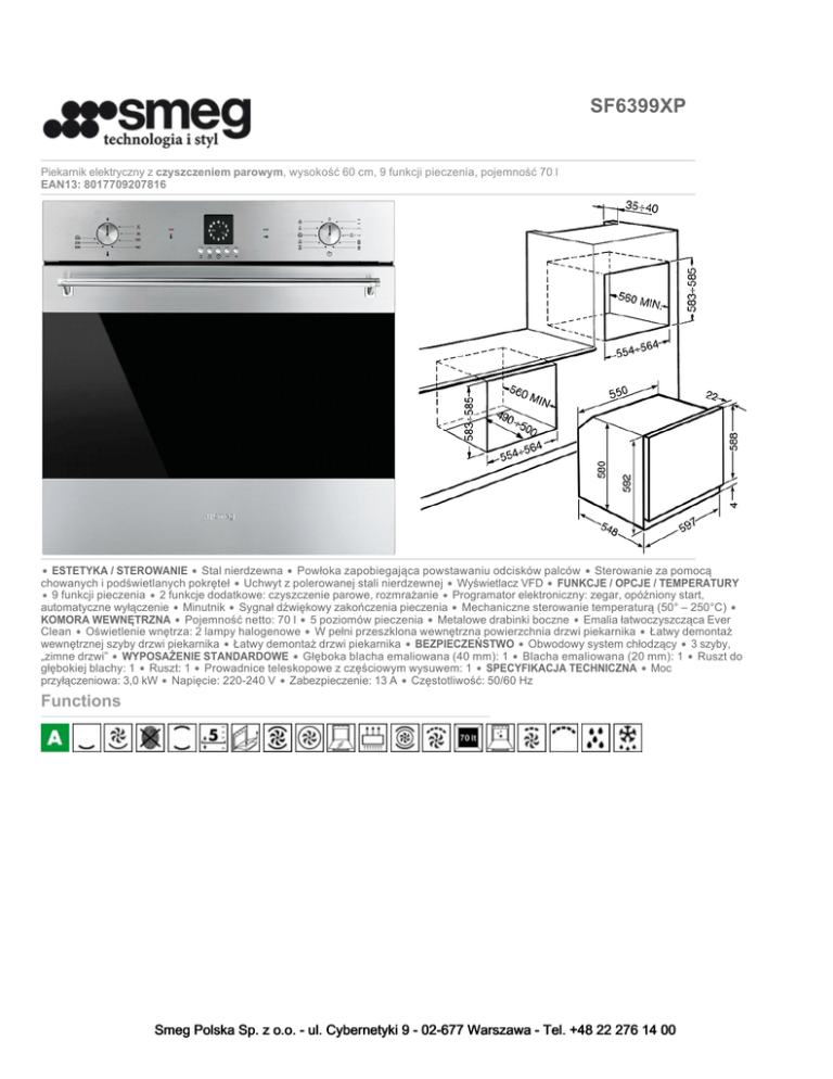SF6399XP Piekarnik elektryczny z czyszczeniem parowym, wysokość 60 cm, 9 funkcji pieczenia, pojemność 70 l EAN13: 8017709207816 ESTETYKA / STEROWANIE Stal nierdzewna Powłoka zapobiegająca powstawaniu odcisków palców Sterowanie za pomocą chowanych i podświetlanych pokręteł Uchwyt z polerowanej stali nierdzewnej Wyświetlacz VFD FUNKCJE / OPCJE / TEMPERATURY 9 funkcji pieczenia 2 funkcje dodatkowe: czyszczenie parowe, rozmrażanie Programator elektroniczny: zegar, opóźniony start, automatyczne wyłączenie Minutnik Sygnał dźwiękowy zakończenia pieczenia Mechaniczne sterowanie temperaturą (50° – 250°C) KOMORA WEWNĘTRZNA Pojemność netto: 70 l 5 poziomów pieczenia Metalowe drabinki boczne Emalia łatwoczyszcząca Ever Clean Oświetlenie wnętrza: 2 lampy halogenowe W pełni przeszklona wewnętrzna powierzchnia drzwi piekarnika Łatwy demontaż wewnętrznej szyby drzwi piekarnika Łatwy demontaż drzwi piekarnika BEZPIECZEŃSTWO Obwodowy system chłodzący 3 szyby, „zimne drzwi” WYPOSAŻENIE STANDARDOWE Głęboka blacha emaliowana (40 mm): 1 Blacha emaliowana (20 mm): 1 Ruszt do głębokiej blachy: 1 Ruszt: 1 Prowadnice teleskopowe z częściowym wysuwem: 1 SPECYFIKACJA TECHNICZNA Moc przyłączeniowa: 3,0 kW Napięcie: 220-240 V Zabezpieczenie: 13 A Częstotliwość: 50/60 Hz Functions Smeg Polska Sp. z o.o. - ul. Cybernetyki 9 - 02-677 Warszawa - Tel. +48 22 276 14 00