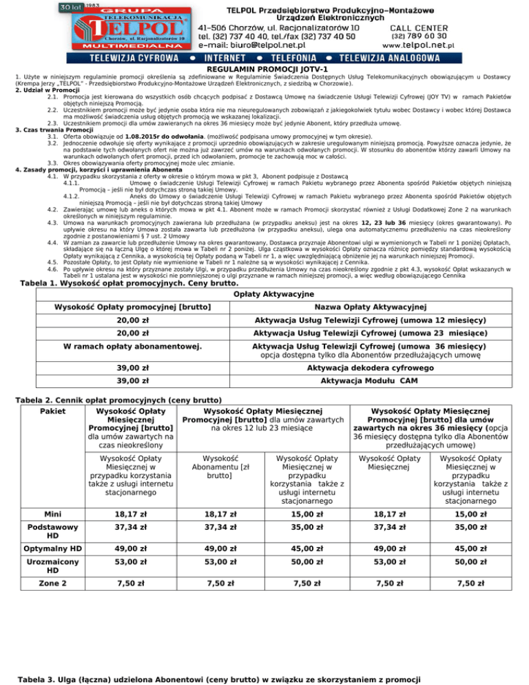 REGULAMIN PROMOCJI JOTV-1 1. Użyte w niniejszym regulaminie promocji określenia są zdefiniowane w Regulaminie Świadczenia Dostępnych Usług Telekomunikacyjnych obowiązującym u Dostawcy (Krempa Jerzy „TELPOL” - Przedsiębiorstwo Produkcyjno-Montażowe Urządzeń Elektronicznych, z siedzibą w Chorzowie). 2. Udział w Promocji 2.1. Promocja jest kierowana do wszystkich osób chcących podpisać z Dostawcą Umowę na świadczenie Usługi Telewizji Cyfrowej (JOY TV) w ramach Pakietów objętych niniejszą Promocją. 2.2. Uczestnikiem promocji może być jedynie osoba która nie ma nieuregulowanych zobowiązań z jakiegokolwiek tytułu wobec Dostawcy i wobec której Dostawca ma możliwość świadczenia usług objętych promocją we wskazanej lokalizacji. 2.3. Uczestnikiem promocji dla umów zawieranych na okres 36 miesięcy może być jedynie Abonent, który przedłuża umowę. 3. Czas trwania Promocji 3.1. Oferta obowiązuje od 1.08.2015r do odwołania. (możliwość podpisana umowy promocyjnej w tym okresie). 3.2. Jednoczenie odwołuje się oferty wynikające z promocji uprzednio obowiązujących w zakresie uregulowanym niniejszą promocją. Powyższe oznacza jedynie, że na podstawie tych odwołanych ofert nie można już zawrzeć umów na warunkach odwołanych promocji. W stosunku do abonentów którzy zawarli Umowy na warunkach odwołanych ofert promocji, przed ich odwołaniem, promocje te zachowują moc w całości. 3.3. Okres obowiązywania oferty promocyjnej może ulec zmianie. 4. Zasady promocji, korzyści i uprawnienia Abonenta 4.1. W przypadku skorzystania z oferty w okresie o którym mowa w pkt 3, Abonent podpisuje z Dostawcą 4.1.1. Umowę o świadczenie Usługi Telewizji Cyfrowej w ramach Pakietu wybranego przez Abonenta spośród Pakietów objętych niniejszą Promocją – jeśli nie był dotychczas stroną takiej Umowy. 4.1.2. Aneks do Umowy o świadczenie Usługi Telewizji Cyfrowej w ramach Pakietu wybranego przez Abonenta spośród Pakietów objętych niniejszą Promocją – jeśli nie był dotychczas stroną takiej Umowy 4.2. Zawierając umowę lub aneks o których mowa w pkt 4.1. Abonent może w ramach Promocji skorzystać również z Usługi Dodatkowej Zone 2 na warunkach określonych w niniejszym regulaminie. 4.3. Umowa na warunkach promocyjnych zawierana lub przedłużana (w przypadku aneksu) jest na okres 12, 23 lub 36 miesięcy (okres gwarantowany). Po upływie okresu na który Umowa została zawarta lub przedłużona (w przypadku aneksu), ulega ona automatycznemu przedłużeniu na czas nieokreślony zgodnie z postanowieniami § 7 ust. 2 Umowy 4.4. W zamian za zawarcie lub przedłużenie Umowy na okres gwarantowany, Dostawca przyznaje Abonentowi ulgi w wymienionych w Tabeli nr 1 poniżej Opłatach, składające się na łączną Ulgę o której mowa w Tabeli nr 2 poniżej. Ulga cząstkowa w wysokości Opłaty oznacza różnicę pomiędzy standardową wysokością Opłaty wynikającą z Cennika, a wysokością tej Opłaty podaną w Tabeli nr 1, a więc uwzględniającą obniżenie jej na warunkach niniejszej Promocji. 4.5. Pozostałe Opłaty, to jest Opłaty nie wymienione w Tabeli nr 1 należne są w wysokości wynikającej z Cennika. 4.6. Po upływie okresu na który przyznane zostały Ulgi, w przypadku przedłużenia Umowy na czas nieokreślony zgodnie z pkt 4.3, wysokość Opłat wskazanych w Tabeli nr 1 ustalana jest w wysokości nie pomniejszonej o ulgi przyznane w ramach niniejszej promocji, a więc według obowiązującego Cennika Tabela 1. Wysokość opłat promocyjnych. Ceny brutto. Opłaty Aktywacyjne Wysokość Opłaty promocyjnej [brutto] Nazwa Opłaty Aktywacyjnej 20,00 zł Aktywacja Usług Telewizji Cyfrowej (umowa 12 miesięcy) 20,00 zł Aktywacja Usług Telewizji Cyfrowej (umowa 23 miesiące) W ramach opłaty abonamentowej. Aktywacja Usług Telewizji Cyfrowej (umowa 36 miesięcy) opcja dostępna tylko dla Abonentów przedłużających umowę 39,00 zł Aktywacja dekodera cyfrowego 39,00 zł Aktywacja Modułu CAM Tabela 2. Cennik opłat promocyjnych (ceny brutto) Pakiet Wysokość Opłaty Wysokość Opłaty Miesięcznej Miesięcznej Promocyjnej [brutto] dla umów zawartych Promocyjnej [brutto] na okres 12 lub 23 miesiące dla umów zawartych na czas nieokreślony Wysokość Opłaty Miesięcznej Promocyjnej [brutto] dla umów zawartych na okres 36 miesięcy (opcja 36 miesięcy dostępna tylko dla Abonentów przedłużających umowę) Wysokość Opłaty Miesięcznej w przypadku korzystania także z usługi internetu stacjonarnego Wysokość Abonamentu [zł brutto] Wysokość Opłaty Miesięcznej w przypadku korzystania także z usługi internetu stacjonarnego Wysokość Opłaty Miesięcznej Wysokość Opłaty Miesięcznej w przypadku korzystania także z usługi internetu stacjonarnego Mini 18,17 zł 18,17 zł 15,00 zł 18,17 zł 15,00 zł Podstawowy HD 37,34 zł 37,34 zł 35,00 zł 37,34 zł 35,00 zł Optymalny HD 49,00 zł 49,00 zł 45,00 zł 49,00 zł 45,00 zł Urozmaicony HD 53,00 zł 53,00 zł 50,00 zł 53,00 zł 50,00 zł Zone 2 7,50 zł 7,50 zł 7,50 zł 7,50 zł 7,50 zł Tabela 3. Ulga (łączna) udzielona Abonentowi (ceny brutto) w związku ze skorzystaniem z promocji Pakiet Wysokość Ulgi [zł brutto] okres nieoznaczony, 12 lub 23 Wysokość Ulgi [zł brutto] Okres 12 miesięcy dla umów zawartych na Wysokość Ulgi [zł brutto] Wysokość Ulgi [zł brutto] w przypadku korzystania także z usługi internetu stacjonarnego Okres 23 miesięcy Okres 36 miesięcy Okres 36 miesięcy 200 zł (200zł 238,04zł z tytułu (200zł z tytułu aktywacji aktywacji 38,04zł z tytułu abonamentu 272,91zł (200zł z tytułu aktywacji 72,91zł z tytułu abonament u - 114,12zł z tytułu abonamentu Okres 23 miesięcy Wysokość Ulgi [zł brutto] w przypadku korzystania także z usługi internetu stacjonarnego Wysokość Ulgi miesięcznej [zł brutto] dla umów zawartych na okres 36 miesięcy. Okres 12 miesięcy Mini 200 zł (200zł z tytułu aktywacji