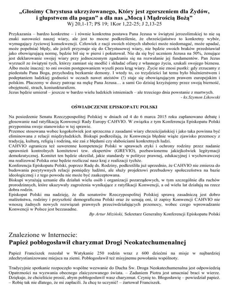 „Głosimy Chrystusa ukrzyżowanego, Który jest zgorszeniem dla Żydów, i głupstwem dla pogan” a dla nas „Mocą i Mądrością Bożą” Wj 20,1-17; PS 19; 1Kor 1,22-25; J 2,13-25 Przykazania – bardzo konkretne – i równie konkretna postawa Pana Jezusa w świątyni jerozolimskiej to nie są znaki surowości naszej wiary, ale jest to mocne podkreślenie, że chrześcijaństwo to konkretny wybór, wymagający życiowej konsekwencji. Człowiek z racji swoich różnych słabości może niedomagać, może upadać, może popełniać błędy, ale jeżeli przyznaje się do Chrystusowej wiary, nie będzie swoich braków przedstawiał jako obowiązującą normę, będzie bił się w piersi i pokutował. Nie da się być uczniem Jezusa na 50%, żenujące jest deklarowanie swojej wiary przy jednoczesnym zgadzaniu się na rozwalanie jej fundamentów. Pan Jezus wyrzucił ze świątyni tych, którzy zamiast się modlić i składać ofiarę z własnego życia, szukali swojego biznesu. Albo może inaczej: to oni swoim postępowaniem wyszli poza krąg wiary. Życie nie znosi pustki: gdy zrzucamy z piedestału Pana Boga, przychodzą bezkarnie demony. I wtedy to, co trzydzieści lat temu było bluźnierstwem i podeptaniem ludzkiej godności w oczach nawet ateistów (!) staje się obowiązującym prawem europejskim i polskim. Płaczemy w duszy patrząc na mękę Pana Jezusa… a sami Go dzisiaj krzyżujemy przez swoją bierność, obojętność, strach, koniunkturalizm. Jezus będzie umierał – jeszcze w bardzo wielu ludzkich istnieniach – ale trzeciego dnia powstanie z martwych. - ks.Szymon Likowski OŚWIADCZENIE EPISKOPATU POLSKI Na posiedzenie Senatu Rzeczypospolitej Polskiej w dniach od 4 do 6 marca 2015 roku zaplanowano debatę i głosowanie nad ratyfikacją Konwencji Rady Europy CAHVIO. W związku z tym Konferencja Episkopatu Polski przypomina swoje stanowisko w tej sprawie. Przemoc stosowana wobec kogokolwiek jest sprzeczna z zasadami wiary chrześcijańskiej i jako taka powinna być eliminowana z relacji międzyludzkich. Biskupi podkreślają, że Konwencja błędnie wiąże zjawisko przemocy z tradycją, kulturą, religią i rodziną, nie zaś z błędami czy słabościami konkretnych ludzi. CAHVIO ogranicza też suwerenne kompetencje Polski w sprawach etyki i ochrony rodziny przez nadanie uprawnień kontrolnych komitetowi tzw. ekspertów (GREVIO), pozbawionemu jakiejkolwiek legitymacji demokratycznej. Komitet ten będzie określał, jakie standardy w polityce prawnej, edukacyjnej i wychowawczej ma realizować Polska oraz będzie rozliczać nasz kraj z realizacji tychże. Konferencja Episkopatu Polski, poprzez Radę ds. Rodziny, podkreśliła już uprzednio, że CAHVIO nie zmierza do budowania pozytywnych relacji pomiędzy ludźmi, ale służy projektowi przebudowy społeczeństwa na bazie ideologicznej i z tego powodu nie może być zaakceptowana. Biskupi wyrażają uznanie dla działań wielu osób i organizacji pozarządowych, w tym szczególnie dla ruchów prorodzinnych, które ukazywały zagrożenia wynikające z ratyfikacji Konwencji, a od wielu lat działają na rzecz dobra rodzin. Episkopat Polski ma nadzieję, że dla senatorów Rzeczypospolitej Polskiej sprawą zasadniczą jest dobro małżeństwa, rodziny i przyszłość demograficzna Polski oraz że uznają oni, iż zapisy Konwencji CAHVIO nie wnoszą żadnych nowych rozwiązań prawnych przeciwdziałających przemocy, wobec czego wprowadzanie Konwencji w Polsce jest bezzasadne. Bp Artur Miziński, Sekretarz Generalny Konferencji Episkopatu Polski Znalezione w Internecie: Papież pobłogosławił charyzmat Drogi Neokatechumenalnej Papież Franciszek rozesłał w Watykanie 250 rodzin wraz z 600 dziećmi na misje w najbardziej zdechrystianizowane miejsca na ziemi. Pobłogosławił też misyjnemu powołaniu wspólnoty. Tradycyjnie spotkanie rozpoczęło wspólne wezwanie do Ducha Św. Droga Neokatechumenalna jest odpowiedzią Opatrzności na wyzwania obecnego zlaicyzowanego świata. – Zadaniem Piotra jest umacniać braci w wierze. Dziękuje, że chcieliście prosić, abym pobłogosławił wasz charyzmat. Czynię to. Błogosławię – powiedział papież. – Robię tak nie dlatego, że mi zapłacili. Ja chcę to uczynić! – żartował Franciszek. Papież wręczył krzyże misyjne wielu rodzinom, także z Polski, które pojechały misje m.in. do Szwecji, Albanii, na Łotwę, do Irlandii, Japonii, Papui Nowej Gwinei, na Syberię, Jamajkę czy do Chin. Rodziny w misji zostawiają w swoim rodzinnym kraju wszystkie swoje zabezpieczenia: majątek, pracę, przyjaciół i jadą tworzyć żywy Kościół, często tam, gdzie już go nie ma, albo nigdy nie było. – Chrystus was uprzedza, towarzyszy wam, niech doprowadzi was do zbawienia, którego jesteście zwiastowaniem – powiedział następca św. Piotra. Papież powiedział, że Droga Neokatechumenalna robi bardzo dużo dobrego dla Kościoła. Rozbudza wiarę poprzez celebrację Słowa Bożego w małych grupach, przekazywanie wiary dzieciom podczas Eucharystii i coniedzielnych jutrzni, dając znaki wiary: miłość i jedność, czy przynosząc liczne powołania do prezbiteratu i życia zakonnego. – Kościół musi przejść od duszpasterstwa zachowawczego do duszpasterstwa misyjnego. Ile razy zamykamy Chrystusa w kościele? – dodał od siebie Franciszek. W auli św. Pawła VI uczestniczyło kilka tysięcy katechumenów. Reszta wspólnot zgromadziła się na placu św. Piotra, ponieważ nie wystarczyło dla nich miejsca. Wszyscy z entuzjazmem witali papieża, który im błogosławił. Obecność wspólnoty w Rzymie jest czytelnym znakiem przed tegorocznym Synodem o rodzinie. Rodziny wielodzietne, wielopokoleniowe, katolickie, otwarte na życie są żywym świadectwem dla dominującej cywilizacji śmierci. Średnia dzietność w rodzinach neokatechumenalnych to szóstka dzieci. Spotkanie zakończyło wspólne odśpiewanie Ojcze Nasz w uniwersalnym języku Kościoła, po 