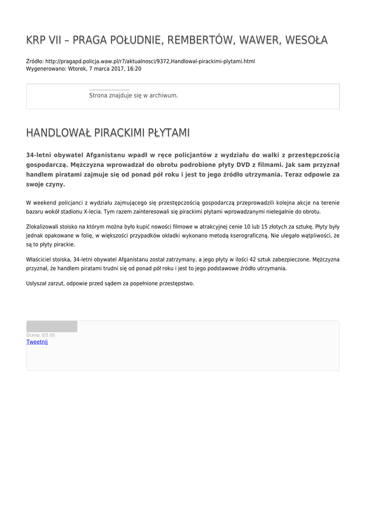 KRP VII – PRAGA POŁUDNIE, REMBERTÓW, WAWER, WESOŁA Źródło: http://pragapd.policja.waw.pl/r7/aktualnosci/9372,Handlowal-pirackimi-plytami.html Wygenerowano: Wtorek, 7 marca 2017, 16:20 Strona znajduje się w archiwum. HANDLOWAŁ PIRACKIMI PŁYTAMI 34-letni obywatel Afganistanu wpadł w ręce policjantów z wydziału do walki z przestępczością gospodarczą. Mężczyzna wprowadzał do obrotu podrobione płyty DVD z filmami. Jak sam przyznał handlem piratami zajmuje się od ponad pół roku i jest to jego źródło utrzymania. Teraz odpowie za swoje czyny. W weekend policjanci z wydziału zajmującego się przestępczością gospodarczą przeprowadzili kolejna akcje na terenie bazaru wokół stadionu X-lecia. Tym razem zainteresowali się pirackimi płytami wprowadzanymi nielegalnie do obrotu. Zlokalizowali stoisko na którym można było kupić nowości filmowe w atrakcyjnej cenie 10 lub 15 złotych za sztukę. Płyty były jednak opakowane w folię, w większości przypadków okładki wykonano metodą kserograficzną. Nie ulegało wątpliwości, że są to płyty pirackie. Właściciel stoiska, 34-letni obywatel Afganistanu został zatrzymany, a jego płyty w ilości 42 sztuk zabezpieczone. Mężczyzna przyznał, że handlem piratami trudni się od ponad pół roku i jest to jego podstawowe źródło utrzymania. Usłyszał zarzut, odpowie przed sądem za popełnione przestępstwo. Ocena: 0/5 (0) Tweetnij