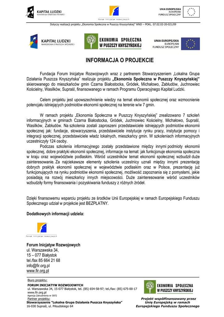 Dotyczy realizacji projektu „Ekonomia Społeczna w Puszczy Knyszyńskiej” WND – POKL. 07.02.02-20-021/09 INFORMACJA O PROJEKCIE Fundacja Forum Inicjatyw Rozwojowych wraz z partnerem Stowarzyszeniem „Lokalna Grupa Działania Puszcza Knyszyńska” realizuje projektu „Ekonomia Społeczna w Puszczy Knyszyńskiej” skierowanego do mieszkańców gmin Czarna Białostocka, Gródek, Michałowo, Zabłudów, Juchnowiec Kościelny, Wasilków, Supraśl, finansowanego w ramach Programu Operacyjnego Kapitał Ludzki. Celem projektu jest upowszechnienie wiedzy na temat ekonomii społecznej oraz wzmocnienie potencjału istniejących podmiotów ekonomii społecznej na terenie w/w 7 gmin. W ramach projektu „Ekonomia Społeczna w Puszczy Knyszyńskiej” zrealizowano 7 szkoleń informacyjnych w gminach Czarna Białostocka, Gródek, Juchnowiec Kościelny, Michałowo, Supraśl, Wasilków, Zabłudów. Na szkolenia zostali zaproszeni przedstawiciele istniejących podmiotów ekonomii społecznej jak: fundacje, stowarzyszenia, przedstawiciele instytucje rynku pracy, instytucje pomocy i integracji społecznej, przedstawiciele władz lokalnych, mieszkańcy gmin. W szkoleniach informacyjnych uczestniczyły 124 osoby. Podczas szkolenia informacyjnego zostały przedstawione między innymi podmioty ekonomii społecznej, dobre praktyki ekonomii społecznej, informacje na temat: jak funkcjonuje ekonomia społeczna w kraju oraz województwie podlaskim. Wśród uczestników temat ekonomii społecznej wzbudził duże zainteresowanie. Za najciekawsze elementy szkolenia uczestnicy uznali między innymi prezentację dobrych praktyk ekonomii społecznej w województwie podlaskim oraz w Polsce, prezentację już funkcjonujących na rynku podmiotów ekonomii społecznej, możliwość zapoznania się z pomysłami, jakie posiadają na rozwój mieszkańcy innych miejscowości. Duże zainteresowanie wśród uczestników wzbudziły formy finansowania i pozyskiwania funduszy z różnych źródeł. Dzięki finansowemu wsparciu projektu ze środków Unii Europejskiej w ramach Europejskiego Funduszu Społecznego udział w projekcie jest BEZPŁATNY. Dodatkowych informacji udziela: Forum Inicjatyw Rozwojowych ul. Warszawska 34, 15 – 077 Białystok tel./fax 85 664 21 68 [email protected] www.fir.org.pl Biuro projektu: FORUM INICJATYW ROZWOJOWYCH ul. Warszawska 34, 15-077 Białystok, tel. (85) 654-58-97; tel./fax: (85) 675-00-17 www.fir.org.pl Agencja Zatrudnienia nr 5972 Partner projektu: Stowarzyszenie ”Lokalna Grupa Działania Puszcza Knyszyńska” 16-030 Supraśl, ul. Piłsudskiego 64 Projekt współfinansowany przez Unię Europejską w ramach Europejskiego Funduszu Społecznego