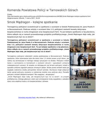 Komenda Powiatowa Policji w Tarnowskich Górach Źródło: http://tarnowskie-gory.slaska.policja.gov.pl/k26/informacje/wiadomosci/64380,Smok-Madragon-kolejne-spotkanie.html Wygenerowano: Wtorek, 7 marca 2017, 16:20 Smok Mądragon - kolejne spotkanie Tarnogórscy policjanci uczestniczyli w spotkaniu z uczniami w Szkole Podstawowej im. Jana Pawła II w Boruszowicach. Podczas wizyty z uczniami klas 1-3, policjanci omówili tematy dotyczące bezpieczeństwa w ruchu drogowym oraz bezpiecznych ferii. To już kolejne spotkanie w tej placówce, które odbyło się w ramach prowadzonego projektu profilaktycznego „Smok Mądragon daje radę, jak bezpiecznym być na co dzień”. Tarnogórscy policjanci uczestniczyli w spotkaniu z uczniami w Szkole Podstawowej im. Jana Pawła II w Boruszowicach. Podczas wizyty z uczniami klas 1-3, policjanci omówili tematy dotyczące bezpieczeństwa w ruchu drogowym oraz bezpiecznych ferii. To już kolejne spotkanie w tej placówce, które odbyło się w ramach prowadzonego projektu profilaktycznego „Smok Mądragon daje radę, jak bezpiecznym być na co dzień”. Tarnogórscy policjanci odwiedzili szkołę podstawową w Boruszowicach. Podczas spotkania, które skierowane było dla dzieci klas 1-3 stróże prawa uczyli dzieci, jak należy się zachowywać w różnego rodzaju sytuacjach na drodze. Policjanci mówili także o zachowaniu w kontaktach z osobami obcymi i sposobach unikania niebezpiecznych sytuacji. W związku ze zbliżającymi się feriami policjanci mówili o sposobie unikania zagrożeń podczas zimowych zabaw. Stróże prawa omówili także jak wygląda codzienna służba policjantów różnych pionów. Słuchacze mogli zobaczyć także sprzęt policyjny używany w codziennej służbie oraz podczas akcji. Ponadto policjanci omówili założenia kampanii "Nie reagujesz - akceptujesz". „Smok Mądragon daje radę, jak bezpiecznym być na co dzień”, to projekt profilaktyczny, którego głównym celem jest zmniejszenie liczby wypadków z udziałem dzieci oraz wspólna troska o ich bezpieczeństwo i zdrowie. Zainstaluj wtyczkę Flash, aby zobaczyć odtwarzacz. pobierz film - 8.44 MB ZAŁĄCZNIKI DO STRONY 8.44 MB Ocena: 0/5 (0) Tweetnij