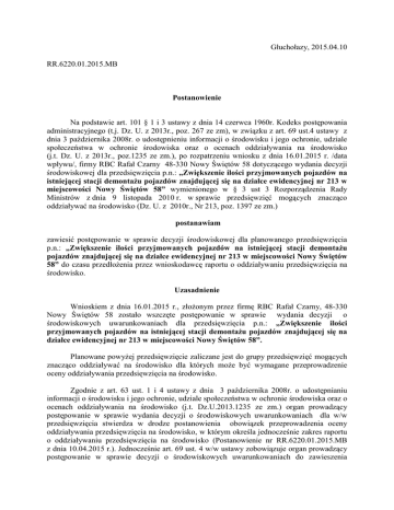 Głuchołazy, 2015.04.10 RR.6220.01.2015.MB Postanowienie Na podstawie art. 101 § 1 i 3 ustawy z dnia 14 czerwca 1960r. Kodeks postępowania administracyjnego (t.j. Dz. U. z 2013r., poz. 267 ze zm), w związku z art. 69 ust.4 ustawy z dnia 3 października 2008r. o udostępnieniu informacji o środowisku i jego ochronie, udziale społeczeństwa w ochronie środowiska oraz o ocenach oddziaływania na środowisko (j.t. Dz. U. z 2013r., poz.1235 ze zm.), po rozpatrzeniu wniosku z dnia 16.01.2015 r. /data wpływu/, firmy RBC Rafał Czarny 48-330 Nowy Świętów 58 dotyczącego wydania decyzji środowiskowej dla przedsięwzięcia p.n.: „Zwiększenie ilości przyjmowanych pojazdów na istniejącej stacji demontażu pojazdów znajdującej się na działce ewidencyjnej nr 213 w miejscowości Nowy Świętów 58” wymienionego w § 3 ust 3 Rozporządzenia Rady Ministrów z dnia 9 listopada 2010 r. w sprawie przedsięwzięć mogących znacząco oddziaływać na środowisko (Dz. U. z 2010r., Nr 213, poz. 1397 ze zm.) postanawiam zawiesić postępowanie w sprawie decyzji środowiskowej dla planowanego przedsięwzięcia p.n.: „Zwiększenie ilości przyjmowanych pojazdów na istniejącej stacji demontażu pojazdów znajdującej się na działce ewidencyjnej nr 213 w miejscowości Nowy Świętów 58” do czasu przedłożenia przez wnioskodawcę raportu o oddziaływaniu przedsięwzięcia na środowisko. Uzasadnienie Wnioskiem z dnia 16.01.2015 r., złożonym przez firmę RBC Rafał Czarny, 48-330 Nowy Świętów 58 zostało wszczęte postępowanie w sprawie wydania decyzji o środowiskowych uwarunkowaniach dla przedsięwzięcia p.n.: „Zwiększenie ilości przyjmowanych pojazdów na istniejącej stacji demontażu pojazdów znajdującej się na działce ewidencyjnej nr 213 w miejscowości Nowy Świętów 58”. Planowane powyżej przedsięwzięcie zaliczane jest do grupy przedsięwzięć mogących znacząco oddziaływać na środowisko dla których może być wymagane przeprowadzenie oceny oddziaływania przedsięwzięcia na środowisko. Zgodnie z art. 63 ust. 1 i 4 ustawy z dnia 3 października 2008r. o udostępnianiu informacji o środowisku i jego ochronie, udziale społeczeństwa w ochronie środowiska oraz o ocenach oddziaływania na środowisko (j.t. Dz.U.2013.1235 ze zm.) organ prowadzący postępowanie w sprawie wydania decyzji o środowiskowych uwarunkowaniach dla w/w przedsięwzięcia stwierdza w drodze postanowienia obowiązek przeprowadzenia oceny oddziaływania przedsięwzięcia na środowisko, w którym określa jednocześnie zakres raportu o oddziaływaniu przedsięwzięcia na środowisko (Postanowienie nr RR.6220.01.2015.MB z dnia 10.04.2015 r.). Jednocześnie art. 69 ust. 4 w/w ustawy zobowiązuje organ prowadzący postępowanie w sprawie decyzji o środowiskowych uwarunkowaniach do zawieszenia postępowania w przedmiotowej sprawie do czasu przedłożenia przez wnioskodawcę raportu o oddziaływaniu przedsięwzięcia na środowisko. Zgodnie z art. 103 k.p.a. zawieszenie postępowania wstrzymuje bieg terminów przewidzianych w kodeksie. Biorąc powyższe pod uwagę postanowiono jak w sentencji Pouczenie: Na niniejsze postanowienie służy stronom zażalenie do Samorządowego Kolegium Odwoławczego za pośrednictwem Burmistrza Głuchołaz w terminie 7 dni od dnia doręczenia postanowienia. Otrzymują: -------------------------1. Rafał Czarny 48-330 Nowy Świętów 58 1. Bogumił Czarny 48-330 Nowy Świętów 58 2. Buchert Zuzanna 48-330 Nowy Świętów 56 3. Homoncik Agnieszka 48-330 Nowy Świętów 56 4. Zarząd dróg Wojewódzkich w Opolu ul. Oleska 127 45-231 Opole 5. Zarząd Dróg Powiatowych w Nysie ul. Słowiańska 17 48-300 Nysa 6. Pierzyna Artur i Jolanta 48-330 Nowy Świętów 56 7. A/a (RR – M.B.)