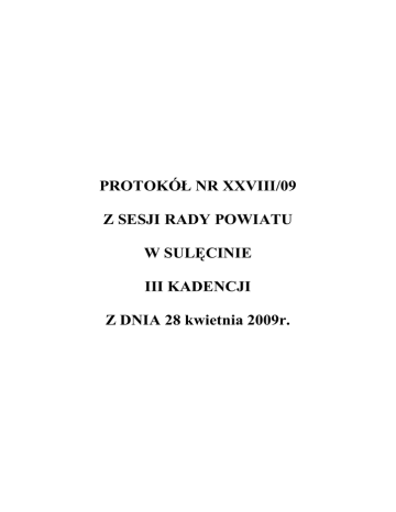 PROTOKÓŁ NR XXVIII/09 Z SESJI RADY POWIATU W SULĘCINIE III KADENCJI Z DNIA 28 kwietnia 2009r. Protokół XXVIII/09 z sesji Rady Powiatu w Sulęcinie z dnia 28 kwietnia 2009r. O godz. 16:00 Przewodniczący Rady – Bronisław Krych otworzył obrady XXVIII sesji Rady Powiatu w Sulęcinie. Powitał przybyłych radnych i zaproszonych gości. Na podstawie listy obecności stwierdził, Ŝe w sesji uczestniczy 13 na 15 radnych, co stanowi quorum, przy którym Rada Powiatu moŜe obradować i podejmować prawomocne decyzje. W tym miejscu odsłuchano Hymn Państwowy. Lista obecności radnych stanowi załącznik nr 1 do protokołu. Lista obecności gości stanowi załącznik nr 2 do protokołu. Porządek obrad przedstawiał się następująco: I. Sprawy regulaminowe: Przyjęcie protokołu XXVII sesji Rady Powiatu w Sulęcinie III kadencji. II. Sprawozdanie z działalności za 2008r. Powiatowego Inspektora Nadzoru Budowlanego. III. Analiza rocznego sprawozdania z wykonania planu finansowego oraz funkcjonowania SPZOZ w Sulęcinie w 2008r. IV. Sprawozdanie Zarządu Powiatu w Sulęcinie w zakresie: a) zimowego utrzymania dróg powiatowych. b) stopnia zaawansowania remontu dróg powiatowych po okresie zimowym. c) planowanych działań związanych z utrzymaniem dróg w 2009r. d) inwestycji realizowanych i planowanych do realizacji na drogach powiatowych w związku z moŜliwościami pozyskania środków zewnętrznych. e) dofinansowania otrzymanego oraz planowanego do pozyskania w ramach funduszy strukturalnych i środków krajowych. V. Informacja z działalności Zarządu Powiatu w okresie międzysesyjnym. VI. Absolutorium dla Zarządu Powiatu za 2008 rok: a) opinia Składu Orzekającego RIO o sprawozdaniu z wykonania budŜetu Powiatu Sulęcińskiego za 2008 rok. b) opinia Komisji Rewizyjnej Rady Powiatu w Sulęcinie w sprawie wykonania budŜetu w 2008 roku. c) wniosek Komisji Rewizyjnej Rady Powiatu w Sulęcinie w sprawie absolutorium dla Zarządu Powiatu w Sulęcinie. d) opinia Składu Orzekającego RIO o wniosku Komisji Rewizyjnej. e) sprawozdanie z wykonania budŜetu Powiatu Sulęcińskiego w 2008r. f) dyskusja nad przedłoŜonym sprawozdaniem z wykonania budŜetu Powiatu Sulęcińskiego w 2008r. g) podjęcie uchwały Rady Powiatu w Sulęcinie w sprawie udzielenia absolutorium Zarządowi Powiatu w Sulęcinie za 2008 rok. VII. Wnioski, interpelacje i zapytania. Przewodniczący zapytał, czy są jakieś uwagi do zaproponowanego porządku obrad. Protokół nr XXVIII/09 sesji Rady Powiatu w Sulęcinie z dnia 28 kwietnia 2009r. 2 Stanisław Kubiak – Starosta Sulęciński poprosił o wprowadzenie do porządku obrad punktu VII Podjęcie uchwały w sprawie zmiany budŜetu i w budŜecie powiatu na 2009r. Tym samym punkt VII Wnioski i zapytania stałby się punktem VIII obrad. Wniosek został przyjęty przy 13 głosach „za”, bez głosów „przeciw”, bez głosów „wstrzymujących się” (na 13 obecnych). Walentyna Głąbowska – radna złoŜyła wniosek o poddanie pod obrady sesji Rady Powiatu pisma Andrzeja śelechowskiego. Kopia pisma stanowi załącznik nr 4 do protokołu. Wniosek przy 4 głosach „za”, 7 głosach „przeciw”, 2 głosach „wstrzymujących się” (na 13 obecnych) nie został przyjęty. Ad. I. Sprawy regulaminowe: Przyjęcie protokołu XXVII sesji Rady Powiatu w Sulęcinie III kadencji. Przewodniczący poinformował radnych, Ŝe protokół z XXVII sesji był wyłoŜony do wglądu w Biurze Rady w statutowym terminie. Zapytał czy są jakieś uwagi do protokołu. Radni nie wnieśli uwag do protokołu. Protokół XXVII sesji Rady Powiatu został przyjęty przy 8 głosach „za”, bez głosów „przeciw”, 4 głosach „wstrzymujących się” (na 14 obecnych). Jedna osoba nie brała udziału w głosowaniu. Ad. II. Sprawozdanie z działalności za 2008r. Powiatowego Inspektora Nadzoru Budowlanego. Sprawozdanie przedstawił Leszek Pawlak – Powiatowy Inspektor Nadzoru Budowlanego. Bronisław Krych – Przewodniczący Rady Powiatu zaproponował aby pominąć referowanie całego sprawozdania i ograniczyć się do ewentualnych pytań. Radni przychylili się do tej propozycji. Lesław Widera – Wiceprzewodniczący Rady Powiatu zapytał czy są budynki będące w zarządzie Powiatu Sulęcińskiego, które mają zły stan techniczny. Leszek Pawlak odpowiedział, Ŝe nie ma takich budynków. Radni przyjęli sprawozdanie do akceptującej wiadomości. Sprawozdanie stanowi załącznik nr 5 do protokołu. Ad. III. Analiza rocznego sprawozdania z wykonania planu finansowego oraz funkcjonowania SPZOZ w Sulęcinie w 2008r Sprawozdanie przedstawił Marek Zaręba – zastępca Dyrektora Samodzielnego Publicznego Zakładu Opieki Zdrowotnej w Sulęcinie. Marian Burdzy – radny zapytał czy są planowane podwyŜki dla personelu. Marek Zaręba odpowiedział, Ŝe podwyŜki były w 2008r. W związku z planowaną inwestycją rozbudowy szpitala oraz brakiem dodatkowego kontraktowania przez NFZ w roku 2009 nie są planowane podwyŜki płac. Irena Monit – radna zapytała jak długo czeka się w kolejce na rehabilitację. Marek Zaręba poinformował, Ŝe czas oczekiwania trwał około 1 miesiąca. Agnieszka Sławiak – radna zapytała czy nie jest tak, Ŝe pieniądze z nadlimitów musza być przeznaczone na podwyŜki dla personelu. Marek Zaręba odpowiedział, Ŝe pieniądze z nadlimitów muszą być przeznaczone na wypłaty dla personelu, który te nadlimity wypracował. Nie jest to podwyŜka płacy a jedynie forma jednorazowej premii. Sprawozdanie stanowi załącznik nr 6 do protokołu. Protokół nr XXVIII/09 sesji Rady Powiatu w Sulęcinie z dnia 28 kwietnia 2009r. 3 Ad. IV. Sprawozdanie Zarządu Powiatu w Sulęcinie w zakresie: a) zimowego utrzymania dróg powiatowych. b) stopnia zaawansowania remontu dróg powiatowych po okresie zimowym. c) planowanych działań związanych z utrzymaniem dróg w 2009r. d) inwestycji realizowanych i planowanych do realizacji na drogach powiatowych w związ