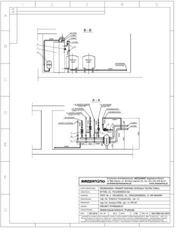 B-B do CWU z CWU DN40 z kotłów DN40 na kotły 3 11 REFLEX E400 REFLEX E400 do kolektora powrotnego DN32 A-A c.o. powrót z budynku (część "B") c.o. do budynku (część "A"+"C") c.o. powrót z budynku (część "A"+"C") c.o. do budynku (część "B") na podgrzewacz z podgrzewacza 4 200 DN40 DN40 DN32 12 9 8 500 DN80 DN32 225 2000 1300 11 DN32 DN80 18 5 475 DN25 7 500 z kotłów na kotły 6 MEIBES powrót z wentylacji DN40 do wentylacji DN40 2 DN40 1 Pracownia Architektoniczna ' MEZZANINO' Magdalena Płocica 41-800 Zabrze, ul. Romana Ligenzy 56, tel./fax (32) 276.06.22 [email protected] www.mezzanino.pl NAZWA OBIEKTU BUD. PRZEBUDOWA I REMONT BUDYNKU WYDZIAŁU TEATRU TAŃCA LOKALIZACJA BYTOM, UL. PIŁSUDSKIEGO 24a INWESTOR PWST IM. L. SOLSKIEGO, UL. STRASZEWSKIEGO, 31-109 KRAKÓW SPRAWDZAJĄCY mgr inż. Elżbieta Tomaszewska, upr. nr PROJEKTANT mgr inż. Grażyna Wilk, upr. nr 791/01 STADIUM PROJEKT WYKONAWCZY NAZWA RYSUNKU DATA 09/2010 Modernizacja kotlowni. Przekroje RYS. NR K-3 SKALA 1:50 PROJ. NR 004/PBW/06/2010 Zastrzega się wszelkie prawa wynikające z Ustawy o prawie autorskim i prawach pokrewnych (Dz.U. 1994r. Nr 24 poz. 83 z późn. zm.). Rysunek niniejszy nie może być w całości lub w części przerysowany, zmieniany, zwielokrotniany drukiem, rozpowszechniany za pomocą elektronicznych środków komunikowania, uzupełniony lub jakkolwiek przetworzony, bez pisemnej zgody właściciela Pracowni Architektonicznej MEZZANINO Magdalena Płocica w Zabrzu, z zastrzeżeniem § 12 Umowy nr PWST/K/18/10 z dnia 2010/06/02 z późn. zm.