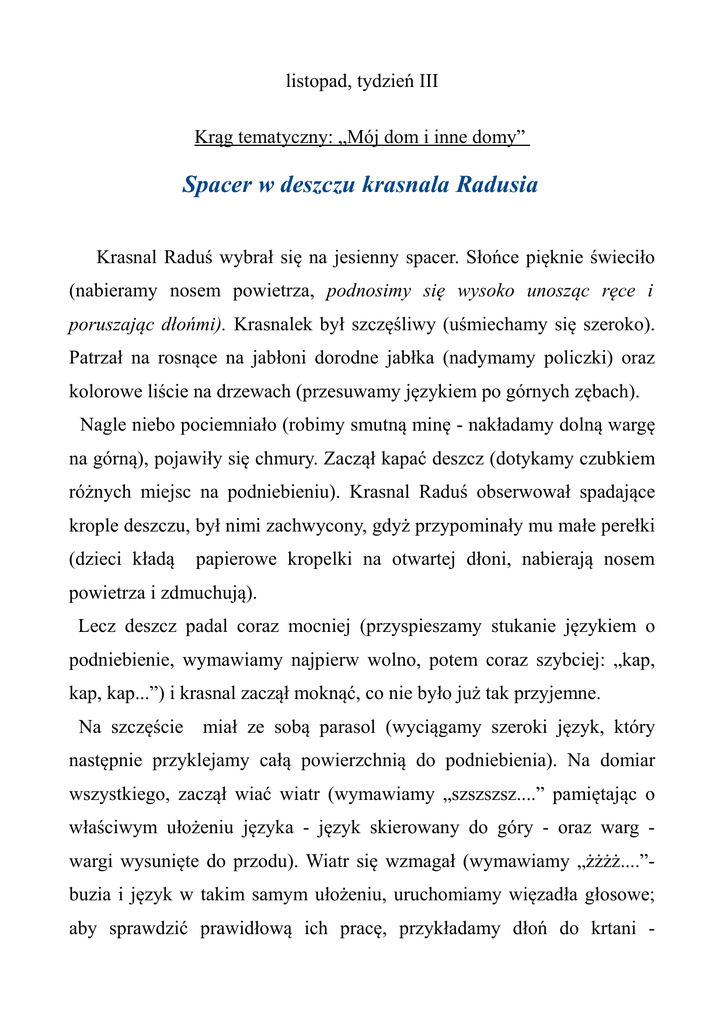 listopad, tydzień III Krąg tematyczny: „Mój dom i inne domy” Spacer w deszczu krasnala Radusia Krasnal Raduś wybrał się na jesienny spacer. Słońce pięknie świeciło (nabieramy nosem powietrza, podnosimy się wysoko unosząc ręce i poruszając dłońmi). Krasnalek był szczęśliwy (uśmiechamy się szeroko). Patrzał na rosnące na jabłoni dorodne jabłka (nadymamy policzki) oraz kolorowe liście na drzewach (przesuwamy językiem po górnych zębach). Nagle niebo pociemniało (robimy smutną minę - nakładamy dolną wargę na górną), pojawiły się chmury. Zaczął kapać deszcz (dotykamy czubkiem różnych miejsc na podniebieniu). Krasnal Raduś obserwował spadające krople deszczu, był nimi zachwycony, gdyż przypominały mu małe perełki (dzieci kładą papierowe kropelki na otwartej dłoni, nabierają nosem powietrza i zdmuchują). Lecz deszcz padal coraz mocniej (przyspieszamy stukanie językiem o podniebienie, wymawiamy najpierw wolno, potem coraz szybciej: „kap, kap, kap...”) i krasnal zaczął moknąć, co nie było już tak przyjemne. Na szczęście miał ze sobą parasol (wyciągamy szeroki język, który następnie przyklejamy całą powierzchnią do podniebienia). Na domiar wszystkiego, zaczął wiać wiatr (wymawiamy „szszszsz....” pamiętając o właściwym ułożeniu języka - język skierowany do góry - oraz warg wargi wysunięte do przodu). Wiatr się wzmagał (wymawiamy „żżżż....”buzia i język w takim samym ułożeniu, uruchomiamy więzadła głosowe; aby sprawdzić prawidłową ich pracę, przykładamy dłoń do krtani - wyczuwamy drgania). Wiatr raz cichnął (wymawiamy „szszsz....”), to znosu się wzmagał (wymawiamy „żżżż....”). Trzymamy przyłożoną otwartą dłoń do krtani - zauważany różnicę : podczas wymawiania głoski ż wyczuwamy drgania, podczas głoski sz - krtań pozostaje nieruchoma). Krasnal Raduś zaczął biec (wymawiamy tup, tup, tup....), co jakiś czas wpadając do kałuży (wymawiamy chlap, chlap, chlap...). Kiedy wrócił do domu, był cały przemoczony (parskamy wargami, wymawiamy brrr). Niestety, nabawił się kataru (nabieramy nosem powietrza i wymawiamy „a- psik!”).