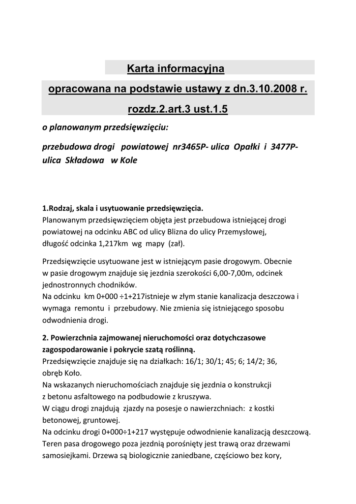 Karta informacyjna opracowana na podstawie ustawy z dn.3.10.2008 r. rozdz.2.art.3 ust.1.5 o planowanym przedsięwzięciu: przebudowa drogi powiatowej nr3465P- ulica Opałki i 3477Pulica Składowa w Kole 1.Rodzaj, skala i usytuowanie przedsięwzięcia. Planowanym przedsięwzięciem objęta jest przebudowa istniejącej drogi powiatowej na odcinku ABC od ulicy Blizna do ulicy Przemysłowej, długość odcinka 1,217km wg mapy (zał). Przedsięwzięcie usytuowane jest w istniejącym pasie drogowym. Obecnie w pasie drogowym znajduje się jezdnia szerokości 6,00-7,00m, odcinek jednostronnych chodników. Na odcinku km 0+000 ÷1+217istnieje w złym stanie kanalizacja deszczowa i wymaga remontu i przebudowy. Nie zmienia się istniejącego sposobu odwodnienia drogi. 2. Powierzchnia zajmowanej nieruchomości oraz dotychczasowe zagospodarowanie i pokrycie szatą roślinną. Przedsięwzięcie znajduje się na działkach: 16/1; 30/1; 45; 6; 14/2; 36, obręb Koło. Na wskazanych nieruchomościach znajduje się jezdnia o konstrukcji z betonu asfaltowego na podbudowie z kruszywa. W ciągu drogi znajdują zjazdy na posesje o nawierzchniach: z kostki betonowej, gruntowej. Na odcinku drogi 0+000÷1+217 występuje odwodnienie kanalizacją deszczową. Teren pasa drogowego poza jezdnią porośnięty jest trawą oraz drzewami samosiejkami. Drzewa są biologicznie zaniedbane, częściowo bez kory, zniszczone grzybem i porosłe mchem. Drzewa usytuowane w skrajni drogi (zagrożenie dla użytkowników drogi) oraz znajdujące się na powierzchni przeznaczonej pod budowę miejsc postojowych, należy usunąć zgodnie z decyzją, w załączeniu. Istniejąca droga publiczna jest użytkowana dla ruchu pojazdów silnikowych wszelkiego rodzaju, w tym: samochodów osobowych - 650p/d, samochodów ciężarowych do 8t - 115p/d, samochodów ciężarowych do 10t - 51p/d. Wzrastający ruch pojazdów ciężarowych wymaga wykonania przebudowy jezdni drogi i zaprojektowania segregacji ruchu pieszego, rowerowego i samochodowego. Zaproponowany program ma na celu uzyskanie tego efektu. Powierzchnia jezdni - 12208,55m2, Powierzchnia chodników - 2441,07m2, Powierzchnia ścieżek rowerowych - 13604,99m2. 3. Rodzaje technologii. Na odcinku istniejącej zabudowy mieszkaniowej: w km 0+000÷0+677 istniejąca nawierzchnia drogi zostanie odnowiona poprzez frezowanie wierzchniej warstwy i ułożenie nowej warstwy ścieralnej z SMA, w km 0+677÷1+217 istniejąca nawierzchnia drogi zostanie częściowo rozebrana, dotyczy to tez chodników. W nowoprojektowanym przekroju poprzecznym po stronie południowej zostanie zabudowany ciąg pieszo-rowerowy 4,00m (ścieżka rowerowa 2,50m i chodnik 1,50m), a po stronie północnej chodnik 2,00m i miejsca postojowe. Chodniki z kostki betonowej. Na całym odcinku zaprojektowana nawierzchnia na poszerzeniu odpowiadać będzie kategorii ruchu KR-4. Konstrukcja nawierzchni dla ruchu KR-4: warstwy bitumiczne - 19cm, warstwa kruszywa - 20cm, wzmocnienie podłoża betonem o Rm=5MPa – 20cm. Nawierzchnię miejsc postojowych stanowić będzie kostka betonowa ułożona na 25cm podbudowie z kruszywa kamiennego łamanego i 20cm warstwie z kruszywa naturalnego. Na odcinku w km 0+677÷1+217 zostanie wykonane poszerzenie istniejącej jezdni drogi do 7,00m. Na poszerzeniu jezdni konstrukcję nawierzchni stanowią warstwy bitumiczne na podbudowie z kruszywa kamiennego i podłożu wzmocnionym kruszywem naturalnym stabilizowanym cementem. W celu poprawy nośności i równości nawierzchni na tym odcinku zostanie wykonane frezowanie wierzchnich warstw konstrukcji i ułożenie nowych warstw: warstwa wyrównawcza, wiążąca, geosiatka i warstwa ścieralna. Łączna grubość nowych warstw bitumicznych 19cm. Na warstwie wyrównawczej zostanie ułożona geosiatka o wytrzymałości 100/100kN/m. Na odcinku, gdzie zaprojektowano ciągi piesze i rowerowe, wody opadowe zostaną przemieszczone do jezdni i zostaną odebrane przez przebudowywane studzienki wodościekowe. 4.Warianty przedsięwzięcia. Warianty przedsięwzięcia: wariant zerowy czyli pozostawienie drogi w obecnym stanie, wariant poprawiający parametry istniejącej drogi odzwierciedlający rozwiązania zawarte w planie rozwoju miasta Koła. Wariant projektowany zmniejszy hałas poprzez usunięcie nierówności istniejącej nawierzchni bitumicznej oraz poprawi bezpieczeństwo użytkowników drogi w okresie jesienno-zimowym tj. dużej częstotliwości ruchu związanych z funkcjonowaniem Zakładów WIPASZ. 5. Przewidywane ilości wykorzystanej wody i innych wykorzystywanych surowców, materiałów, paliw i energii. Do przebudowy drogi wykorzystywane będą: woda piasek cement masy bitumiczne olej napędowy - 21m3, 2000m3, 600Mg, 1600Mg, 12000l. 6. Rozwiązania chroniące środowisko. 1. Poprzez ujęcie ścieków wód opadowych i roztopowych do kolektora deszczowego na odcinkach drogi zostaną zlikwidowane zastoiska wód opadowych. 2. Wprowadzone rozwiązania przebudowy drogi poprzez zastosowanie segregacji ruchu pieszych, rowerów i samochodów, w tym bezpiecznych miejsc postojowych, spowodują poprawę bezpieczeństwa ich użytkowników. 3. Dla pracowników na budowie należy ustawić sanitariaty TOJ-TOJ oraz barakowóz socjalny. 4. Nieczystości należy wywozić do oczyszczalni ścieków. 5. Odpady należy segregować i wywozić na wysypisko posiadające atest. 6. Dla spełnienia funkcji przebudowanej drogi należy wyciąć drzewa rosnące w skrajni jezdni drogowej, zgodnie z decyzją w załączeniu. W to miejsce zostaną zrekompensowane nasadzeniem drzew w innych miejscach. 7. Rodzaje i przewidywane ilości wprowadzonych do środowiska substancji lub energii przy zastosowaniu rozwiązań chroniących środowisko. Zaprojektowana technologia przebudowy drogi nie wytwarza w czasie eksploatacji substancji szkodliwych dla środowiska. Masy bitumiczne i betonowe po wbudowaniu są obojętne dla środowiska. Na etapie budowy występują wydzielające się opary z mas bitumicznych, 