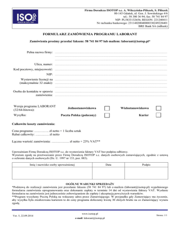 Firma Doradcza ISOTOP s.c. A. Wilczyńska-Piliszek, S. Piliszek 80-143 Gdańsk, ul. Gen. J. Sowińskiego 4/6 tel.: 58 380 36 94; fax: 58 741 84 97 NIP: PL5833132656; REGON: 221240411 Nr rachunku bankowego: 23114020040000330249228401 BRE Bank SA (mBank) FORMULARZ ZAMÓWIENIA PROGRAMU LABORANT Zamówienia prosimy przesłać faksem: 58 741 84 97 lub mailem: [email protected]* Pełna nazwa firmy: ....................................................................................................................................... ....................................................................................................................................... ....................................................................................................................................... Ulica, numer: ....................................................................................................................................... Kod pocztowy, miejscowość: ....................................................................................................................................... NIP: ....................................................................................................................................... Wystawienie licencji na ....................................................................................................................................... (maksymalnie 32 znaki): ....................................................................................................................................... ....................................................................................................................................... Osoba do kontaktu w sprawie ....................................................................................................................................... zamówienia: ....................................................................................................................................... Wersja programu LABORANT (32/64-bitowa): Wysyłka: Jednostanowiskowa Wielostanowiskowa Poczta Polska (polecony) Kurier Całkowite koszty zamówienia: Cena programu: …………. zł netto × 1 liczba sztuk Rabat całkowity: ………… zł netto Łączna wartość zamówienia: ……………. zł netto + 23% VAT** Upoważniam Firmę Doradczą ISOTOP s.c. do wystawienia faktury VAT bez podpisu odbiorcy. Wyrażam zgodę na przetwarzanie przez Firmę Doradczą ISOTOP s.c. danych osobowych zamawiających, zgodnie z ustawą o ochronie danych osobowych (Dz. U. 1997 nr 133, poz. 883). Imię i nazwisko osoby upoważnionej Data Podpis OGÓLNE WARUNKI SPRZEDAŻY *Podstawą do realizacji zamówienia jest przesłanie faksem (58 741 84 97) lub e-mailem ([email protected]) wypełnionego formularza zamówienia oprogramowania oraz dokonanie zapłaty w terminie 14 dni od wystawienia faktury VAT. Wysłanie formularza na zamówienie jest jednocześnie zobowiązaniem do zapłaty i akceptacją powyższych warunków. **Program wysyłamy Pocztą Polską na wskazany adres przez Zamawiającego. W przypadku gdy Zamawiający ma życzenie, aby wysyłka była zrealizowana kurierem to do ceny programu doliczamy kwotę 30 złotych brutto na co Zamawiający wyraża zgodę. Ver. 5, 22.09.2014 www.isotop.pl e-mail: [email protected] Strona: 1/1