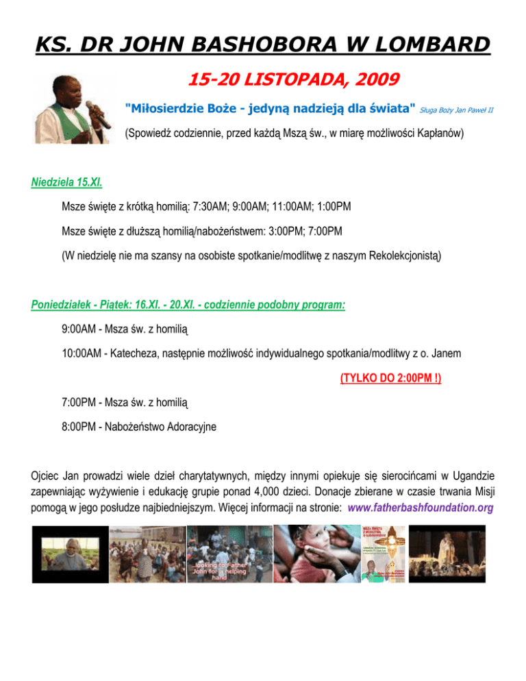 KS. DR JOHN BASHOBORA W LOMBARD 15-20 LISTOPADA, 2009 "Miłosierdzie Boże - jedyną nadzieją dla świata" Sługa Boży Jan Paweł II (Spowiedź codziennie, przed każdą Mszą św., w miarę możliwości Kapłanów) Niedziela 15.XI. Msze święte z krótką homilią: 7:30AM; 9:00AM; 11:00AM; 1:00PM Msze święte z dłuższą homilią/nabożeństwem: 3:00PM; 7:00PM (W niedzielę nie ma szansy na osobiste spotkanie/modlitwę z naszym Rekolekcjonistą) Poniedziałek - Piątek: 16.XI. - 20.XI. - codziennie podobny program: 9:00AM - Msza św. z homilią 10:00AM - Katecheza, następnie możliwość indywidualnego spotkania/modlitwy z o. Janem (TYLKO DO 2:00PM !) 7:00PM - Msza św. z homilią 8:00PM - Nabożeństwo Adoracyjne Ojciec Jan prowadzi wiele dzieł charytatywnych, między innymi opiekuje się sierocińcami w Ugandzie zapewniając wyżywienie i edukację grupie ponad 4,000 dzieci. Donacje zbierane w czasie trwania Misji pomogą w jego posłudze najbiedniejszym. Więcej informacji na stronie: www.fatherbashfoundation.org