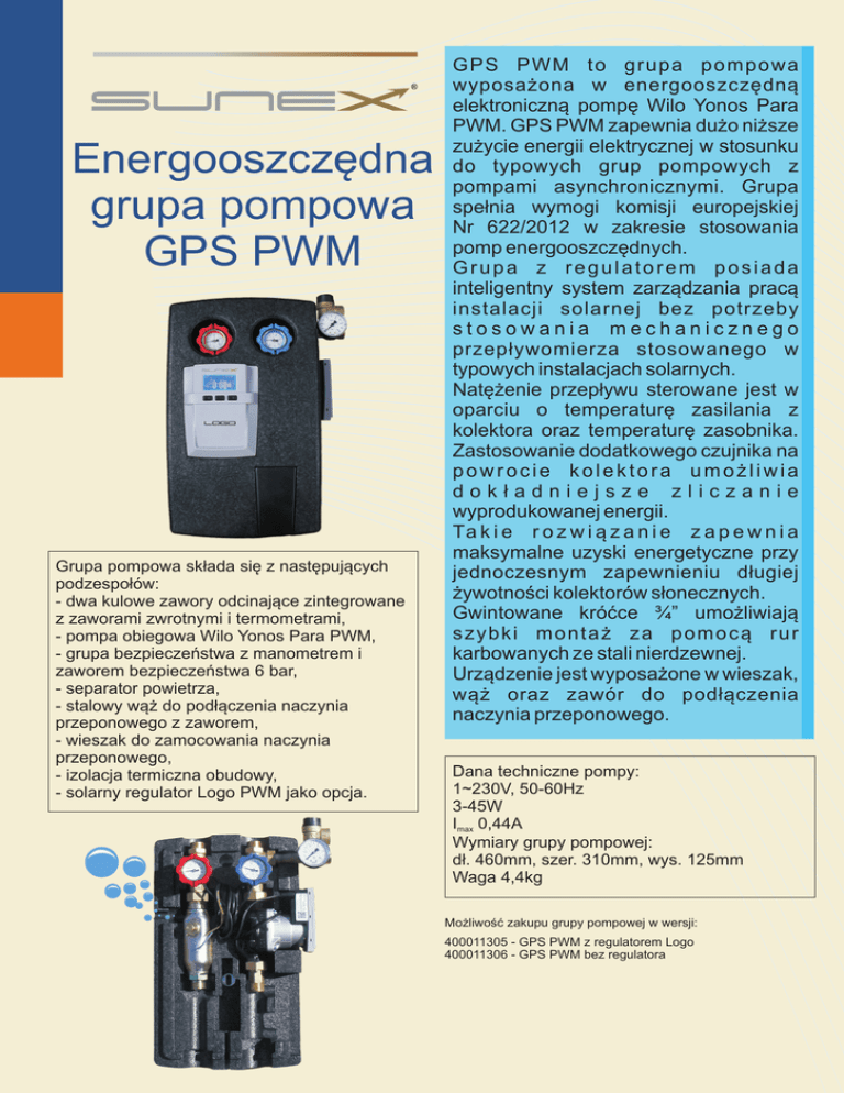 Energooszczędna grupa pompowa GPS PWM Grupa pompowa składa się z następujących podzespołów: - dwa kulowe zawory odcinające zintegrowane z zaworami zwrotnymi i termometrami, - pompa obiegowa Wilo Yonos Para PWM, - grupa bezpieczeństwa z manometrem i zaworem bezpieczeństwa 6 bar, - separator powietrza, - stalowy wąż do podłączenia naczynia przeponowego z zaworem, - wieszak do zamocowania naczynia przeponowego, - izolacja termiczna obudowy, - solarny regulator Logo PWM jako opcja. GPS PWM to grupa pompowa wyposażona w energooszczędną elektroniczną pompę Wilo Yonos Para PWM. GPS PWM zapewnia dużo niższe zużycie energii elektrycznej w stosunku do typowych grup pompowych z pompami asynchronicznymi. Grupa spełnia wymogi komisji europejskiej Nr 622/2012 w zakresie stosowania pomp energooszczędnych. Grupa z regulatorem posiada inteligentny system zarządzania pracą instalacji solarnej bez potrzeby stosowania mechanicznego przepływomierza stosowanego w typowych instalacjach solarnych. Natężenie przepływu sterowane jest w oparciu o temperaturę zasilania z kolektora oraz temperaturę zasobnika. Zastosowanie dodatkowego czujnika na powrocie kolektora umożliwia dokładniejsze zliczanie wyprodukowanej energii. Ta k i e r o z w i ą z a n i e z a p e w n i a maksymalne uzyski energetyczne przy jednoczesnym zapewnieniu długiej żywotności kolektorów słonecznych. Gwintowane króćce ¾” umożliwiają szybki montaż za pomocą rur karbowanych ze stali nierdzewnej. Urządzenie jest wyposażone w wieszak, wąż oraz zawór do podłączenia naczynia przeponowego. Dana techniczne pompy: 1~230V, 50-60Hz 3-45W Imax 0,44A Wymiary grupy pompowej: dł. 460mm, szer. 310mm, wys. 125mm Waga 4,4kg Możliwość zakupu grupy pompowej w wersji: 400011305 - GPS PWM z regulatorem Logo 400011306 - GPS PWM bez regulatora Charakterystyka pompy H/m 4660/<=5 PWM1 />=95 p/kPa PWM2 70 7 PWM1 4178/15 PWM2 /85 60 6 5 PWM1 3695/25 50 PWM2 /75 Wysokość podnoszenia 4 PWM1 3213/35 40 PWM2 /65 30 3 MA 2730/45PWM1/55PWM2 2 X 20 2248/55PWM1/45PWM2 1765/65PWM1/35PWM2 10 1 1283/75PWM1/25PWM2 800/85PWM1/15PWM2 0 0 0 0,5 0 0 1,0 0,2 2 1,5 2,0 0,4 4 3 3,0 Q/m /h 2,5 0,6 6 0,8 8 10 Q/l/s Q/lgpm P1/W MAX 40 20 0 0 0,5 1,0 1,5 2,0 2,5 3 3,0 Q/m /h