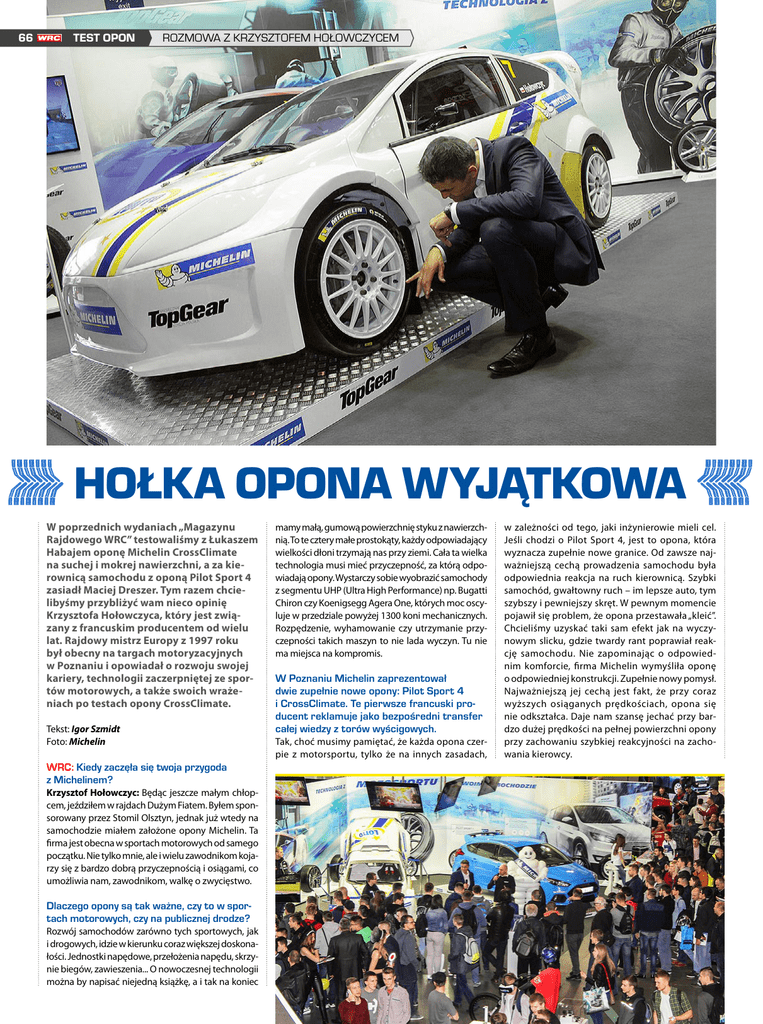 66 TEST OPON ROZMOWA Z KRZYSZTOFEM HOŁOWCZYCEM HOŁKA OPONA WYJĄTKOWA W poprzednich wydaniach „Magazynu Rajdowego WRC” testowaliśmy z Łukaszem Habajem oponę Michelin CrossClimate na suchej i mokrej nawierzchni, a za kierownicą samochodu z oponą Pilot Sport 4 zasiadł Maciej Dreszer. Tym razem chcielibyśmy przybliżyć wam nieco opinię Krzysztofa Hołowczyca, który jest związany z francuskim producentem od wielu lat. Rajdowy mistrz Europy z 1997 roku był obecny na targach motoryzacyjnych w Poznaniu i opowiadał o rozwoju swojej kariery, technologii zaczerpniętej ze sportów motorowych, a także swoich wrażeniach po testach opony CrossClimate. Tekst: Igor Szmidt Foto: Michelin WRC: Kiedy zaczęła się twoja przygoda z Michelinem? Krzysztof Hołowczyc: Będąc jeszcze małym chłopcem, jeździłem w rajdach Dużym Fiatem. Byłem sponsorowany przez Stomil Olsztyn, jednak już wtedy na samochodzie miałem założone opony Michelin. Ta firma jest obecna w sportach motorowych od samego początku. Nie tylko mnie, ale i wielu zawodnikom kojarzy się z bardzo dobrą przyczepnością i osiągami, co umożliwia nam, zawodnikom, walkę o zwycięstwo. Dlaczego opony są tak ważne, czy to w sportach motorowych, czy na publicznej drodze? Rozwój samochodów zarówno tych sportowych, jak i drogowych, idzie w kierunku coraz większej doskonałości. Jednostki napędowe, przełożenia napędu, skrzynie biegów, zawieszenia... O nowoczesnej technologii można by napisać niejedną książkę, a i tak na koniec mamy małą, gumową powierzchnię styku z nawierzchnią. To te cztery małe prostokąty, każdy odpowiadający wielkości dłoni trzymają nas przy ziemi. Cała ta wielka technologia musi mieć przyczepność, za którą odpowiadają opony. Wystarczy sobie wyobrazić samochody z segmentu UHP (Ultra High Performance) np. Bugatti Chiron czy Koenigsegg Agera One, których moc oscyluje w przedziale powyżej 1300 koni mechanicznych. Rozpędzenie, wyhamowanie czy utrzymanie przyczepności takich maszyn to nie lada wyczyn. Tu nie ma miejsca na kompromis. W Poznaniu Michelin zaprezentował dwie zupełnie nowe opony: Pilot Sport 4 i CrossClimate. Te pierwsze francuski producent reklamuje jako bezpośredni transfer całej wiedzy z torów wyścigowych. Tak, choć musimy pamiętać, że każda opona czerpie z motorsportu, tylko że na innych zasadach, w zależności od tego, jaki inżynierowie mieli cel. Jeśli chodzi o Pilot Sport 4, jest to opona, która wyznacza zupełnie nowe granice. Od zawsze najważniejszą cechą prowadzenia samochodu była odpowiednia reakcja na ruch kierownicą. Szybki samochód, gwałtowny ruch – im lepsze auto, tym szybszy i pewniejszy skręt. W pewnym momencie pojawił się problem, że opona przestawała „kleić”. Chcieliśmy uzyskać taki sam efekt jak na wyczynowym slicku, gdzie twardy rant poprawiał reakcję samochodu. Nie zapominając o odpowiednim komforcie, firma Michelin wymyśliła oponę o odpowiedniej konstrukcji. Zupełnie nowy pomysł. Najważniejszą jej cechą jest fakt, że przy coraz wyższych osiąganych prędkościach, opona się nie odkształca. Daje nam szansę jechać przy bardzo dużej prędkości na pełnej powierzchni opony przy zachowaniu szybkiej reakcyjności na zachowania kierowcy. ROZMOWA Z KRZYSZTOFEM HOŁOWCZYCEM Oponę CrossClimate testowałeś bodaj jako jeden z pierwszych Polaków. Czym jest ten produkt? TEST OPON Na poznańskich targach publiczność mogła podziwiać także Fiestę Supercar, osiągającą pierwsze 100 km/h w zawrotnym czasie 1,8 sekundy! Do niedawna Hołek startował za kierownicą tego potwora w Rallycrossowych Mistrzostwach Świata. Ktoś mógłby powiedzieć, że to opona do wszystkiego. Kiedyś baliśmy się takiego stwierdzenia pamiętając, że „jeśli coś jest do wszystkiego, to jest do niczego”. Dziś jednak wydaje się ono nieaktualne, a CrossClimate sprawia wrażenie spełnionego marzenia. Ta opona działa właściwie w każdych warunkach. W jej przypadku również wchodzi w grę technologia ze sportów motorowych? Oczywiście, głównie z Dakaru. Zawodnicy tego maratonu jeszcze przed rozpoczęciem rywalizacji muszą dedykować jeden rodzaj opony i na nim jechać przez cały dystans rajdu, nieważne czy na trasie występuje szuter, asfalt, piach, a czasami nawet śnieg, nie wspominając o błocie. Musi to być opona, która da sobie radę na wszystkich nawierzchniach. W 176. numerze „Magazynu Rajdowego WRC” przeczytaliście także obszerny test opony Pilot Sport 4 przeprowadzony wspólnie z Maćkiem Dreszerem. I taka jest też drogowa opona CrossClimate? Tak, możemy ją założyć do naszego samochodu i właściwie nie musimy się o nic martwić. gdyż na drodze jesteśmy bezpieczni bez względu na to, czy świeci słońce, czy pada rzęsisty deszcz lub śnieg. Michelin na każdym kroku podkreśla, iż nowy produkt nie jest oponą wielosezonową, a letnim ogumieniem z homologacją zimową. Na czym polega różnica? Opony ogółem mają taką charakterystykę, że kiedy jest zimno, mieszanka robi się twarda. Z kolei kiedy jest ciepło, robi się miękka i bardzo szybko się zużywa. Michelin stworzył oponę, która działa właściwie na odwrót. Dzięki inteligentnym rozwiązaniom ta opona w zimie robi się bardziej miękka, dzięki czemu świetnie wybiera kawałki śniegu czy lodu spod siebie. A w lecie twardnieje po to, by zachować parametry opon letnich oraz zwiększyć jej trwałość. Inżynierowie francuskiej firmy przy projektowaniu nowej opony drogowej korzystają z wiedzy zebranej w niemal wszystkich rodzajach sportów motorowych: począwszy od rajdów, przez Formułę E, na Dakarze kończąc. W naszym redakcyjnym Volkswagenie Golfie opony Michelin CrossClimate spisują się bez zarzutu już od grudnia zeszłego roku. Ty też zdecydowałeś się założyć je do swojego prywatnego auta? Tak, również używam tych opon w swoim samochodzie i jestem bardzo zadowolony z ich 
