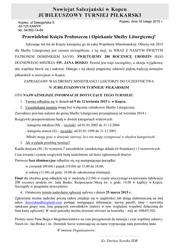 Nowicjat Salezjański w Kopcu JUBILEUSZOWY TURNIEJ PIŁKARSKI Kopiec, dnia 16 lutego 2015 r. Kopiec, ul Salezjańska 9 42-125 KAMYK tel. 34/362-74-64 Przewielebni Księża Proboszczu i Opiekunie Służby Liturgicznej! Adresując ten list do Księży kierujemy go do całej Wspólnoty Ministranckiej. Obecny rok 2015 dla Służby Liturgicznej jest czasem szczególnym, z tej racji, że WRAZ Z NASZYM ŚWIĘTYM PATRONEM DOMINIKIEM SAVIO, ŚWIĘTUJEMY 200 ROCZNICĘ URODZIN JEGO DUCHOWEGO MISTRZA ŚW. JANA BOSKO. Powód jest więc szczególny, a okazja wyjątkowa, aby wspólnie bawić się i radować. Dlatego z tej okazji pragniemy odnowić piękną tradycję turniejów piłkarskich w nowicjacie w Kopcu. ZAPRASZAMY WAS DRODZY MINISTRANCI I LEKTORZY DO UCZESTNICTWA W JUBILEUSZOWYM TURNIEJU PIŁKARSKIM OTO NAJWAŻNIEJSZE INFORMACJE DOTYCZĄCE TEGO TURNIEJU: 1. Turniej odbędzie się w dniach od 9 do 12 kwietnia 2015 r. w Kopcu. 2. Uczestnikami turnieju mogą być wyłącznie członkowie Służby Liturgicznej. Zawodnicy powinni należeć do grona Służby Liturgicznej przynajmniej od września 2014 r. Rozgrywki przeprowadzone będą w dwóch kategoriach wiekowych: - kategoria młodsza (M) – roczniki: od 01.01.2002 do 31.12.2004 - kategoria starsza (S) – roczniki: od 01.01.1999 do 31.12.2001 /Młodsi mogą grać w drużynie starszej, lecz nie mogą występować w obydwu kategoriach/ 3. Jak wygląda przebieg turnieju? Każda drużyna (M i S) wystawia 7 zawodników zasadniczego składu (6+bramkarz) i 5 rezerwowych. Czas trwania i system rozgrywek będą uzależnione od ilości zgłoszonych drużyn. Pierwsza faza eliminacyjna odbędzie się wg następującego porządku: w czwartek (09.04) i piątek (10.04) od 15.00 do 18.00; w sobotę (11.04) od godz. 10.00 do zakończenia eliminacji. Finał dla obydwu grup odbędzie się w niedzielę (12.04) w czasie uroczystego świętowania Jubileuszu 200 rocznicy urodzin św. Jana Bosko. Rozpoczęcie Mszą św. o godz. 14.00 w kaplicy w Kopcu. Szczegóły w programie uroczystości. 4. Ostateczny termin nadsyłania zgłoszeń upływa z dniem 25 marca 2015 r. Zgłoszenia można nadsyłać pocztą (adres znajduje się w nagłówku) lub drogą elektroniczną na mój adres: [email protected] podając następujące informacje: nazwę parafii, imię i nazwisko opiekuna grupy oraz listę grających zawodników (należy w tym względzie wypełnić dołączoną do listu kartę zgłoszeń). W razie potrzeby można dzwonić również na komórkę – mój nr: 696451302. Prośmy teraz Pana Boga o błogosławieństwo na czas przygotowań do turnieju i czas wspólnej zabawy. Niech św. Jan Bosko i św. Dominik Savio wstawiają się za nami wypraszając nam potrzebne łaski. W imieniu Organizatorów: …………………………………………. Ks. Dariusz Szyszka SDB