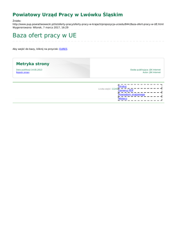 Powiatowy Urząd Pracy w Lwówku Śląskim Źródło: http://www.pup.powiatlwowecki.pl/lsl/oferty-pracy/oferty-pracy-w-krajach/propozycja-urzedu/844,Baza-ofert-pracy-w-UE.html Wygenerowano: Wtorek, 7 marca 2017, 16:29 Baza ofert pracy w UE Aby wejść do bazy, kliknij na przycisk: EURES Metryka strony Data publikacji 14.05.2013 Rejestr zmian Osoba publikująca: JSK Internet Autor: JSK Internet Liczba wejść: 11243 Drukuj Generuj PDF Powiadom znajomego Wstecz