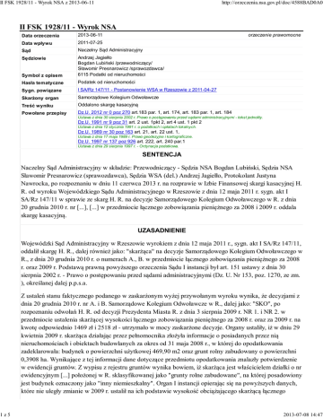 II FSK 1928/11 - Wyrok NSA z 2013-06-11 1z5 http://orzeczenia.nsa.gov.pl/doc/4588BAD0A0 II FSK 1928/11 - Wyrok NSA Data orzeczenia 2013-06-11 Data wpływu 2011-07-25 orzeczenie prawomocne Sąd Naczelny Sąd Administracyjny Sędziowie Andrzej Jagiełło Bogdan Lubiński /przewodniczący/ Sławomir Presnarowicz /sprawozdawca/ 6115 Podatki od nieruchomości Symbol z opisem Hasła tematyczne Podatek od nieruchomości Sygn. powiązane I SA/Rz 147/11 - Postanowienie WSA w Rzeszowie z 2011-04-27 Skarżony organ Samorządowe Kolegium Odwoławcze Treść wyniku Oddalono skargę kasacyjną Powołane przepisy Dz.U. 2012 nr 0 poz 270 art.183 par. 1, art. 174, art. 183 par. 1, art. 184 Ustawa z dnia 30 sierpnia 2002 r. Prawo o postępowaniu przed sądami administracyjnymi - tekst jednolity. Dz.U. 1991 nr 9 poz 31 art. 2 ust. 1pkt 2, art 4 ust. 1 pkt 2 Ustawa z dnia 12 stycznia 1991 r. o podatkach i opłatach lokalnych. Dz.U. 1989 nr 30 poz 163 art. 21, art. 22 ust. 1, Ustawa z dnia 17 maja 1989 r. Prawo geodezyjne i kartograficzne. Dz.U. 1997 nr 137 poz 926 art. 222, art. 240 par.1 Ustawa z dnia 29 sierpnia 1997 r. - Ordynacja podatkowa. SENTENCJA Naczelny Sąd Administracyjny w składzie: Przewodniczący - Sędzia NSA Bogdan Lubiński, Sędzia NSA Sławomir Presnarowicz (sprawozdawca), Sędzia WSA (del.) Andrzej Jagiełło, Protokolant Justyna Nawrocka, po rozpoznaniu w dniu 11 czerwca 2013 r. na rozprawie w Izbie Finansowej skargi kasacyjnej H. R. od wyroku Wojewódzkiego Sądu Administracyjnego w Rzeszowie z dnia 12 maja 2011 r. sygn. akt I SA/Rz 147/11 w sprawie ze skarg H. R. na decyzje Samorządowego Kolegium Odwoławczego w R. z dnia 20 grudnia 2010 r. nr [...], [...] w przedmiocie łącznego zobowiązania pieniężnego za 2008 i 2009 r. oddala skargę kasacyjną. UZASADNIENIE Wojewódzki Sąd Administracyjny w Rzeszowie wyrokiem z dnia 12 maja 2011 r., sygn. akt I SA/Rz 147/11, oddalił skargę H. R., dalej również jako: "skarżąca" na decyzje Samorządowego Kolegium Odwoławczego w R., z dnia 20 grudnia 2010 r. o numerach A., B. w przedmiocie łącznego zobowiązania pieniężnego za 2008 r. oraz 2009 r. Podstawą prawną powyższego orzeczenia Sądu I instancji był art. 151 ustawy z dnia 30 sierpnia 2002 r. - Prawo o postępowaniu przed sądami administracyjnymi (Dz. U. Nr 153, poz. 1270, ze zm. ), określanej dalej p.p.s.a. Z ustaleń stanu faktycznego podanego w zaskarżonym wyżej przywołanym wyroku wynika, że decyzjami z dnia 20 grudnia 2010 r. nr A. i B. Samorządowe Kolegium Odwoławcze w R., dalej jako: "SKO", po rozpoznaniu odwołań H. R. od decyzji Prezydenta Miasta R. z dnia 3 sierpnia 2009 r. NR 1. i NR 2. w przedmiocie ustalenia skarżącej wysokości łącznego zobowiązania pieniężnego za 2008 r. oraz za 2009 r. na kwotę odpowiednio 1469 zł i 2518 zł - utrzymało w mocy zaskarżone decyzje. Organy ustaliły, iż w dniu 29 kwietnia 2009 r. skarżąca działając przez pełnomocnika złożyła informacje o posiadanych przez nią nieruchomościach i obiektach budowlanych za okres od 31 maja 2008 r., w której do opodatkowania zadeklarowała: budynek o powierzchni użytkowej 469,90 m2 oraz grunt rolny zabudowany o powierzchni 0,3908 ha. Wynikające z tej informacji dane dotyczące przedmiotu opodatkowania znalazły potwierdzenie w ewidencji gruntów. Z wypisu z rejestru gruntów wynika bowiem, iż skarżąca jest właścicielem działki o nr ewidencyjnym [...] położonej w R. sklasyfikowanej jako "grunty rolne zabudowane", na której posadowiony jest budynek oznaczony jako "inny niemieszkalny". Organ I instancji opierając się na powyższych danych, które nie uległy zmianie w 2009 r. ustalił na ich podstawie wysokość obciążającego skarżącą łącznego 2013-07-08 14:47 II FSK 1928/11 - Wyrok NSA z 2013-06-11 2z5 http://orzeczenia.nsa.gov.pl/doc/4588BAD0A0 zobowiązania pieniężnego za lata 2008 i 2009. Dla ustalenia wysokości zobowiązania w podatku od nieruchomości przyjęto stawkę właściwą dla pozostałych budynków i ich części w tym również zajęte na prowadzenie odpłatnej statutowej działalności pożytku publicznego przez organizacje pożytku publicznego. Natomiast SKO dodatkowo zauważyło także, iż wyeliminowanie budynku byłego kurnika z podstawy opodatkowania, mogłoby mieć miejsce jedynie w razie uznania, iż obiekt ten utracił elementy konstrukcyjne pozwalające na zaliczenie go do przedmiotów opodatkowania zgodnie z art. 1a ust 1 pkt 1 ustawy z dnia 12 stycznia 1991 o podatkach i opłatach lokalnych (t.j. Dz. U. z 2006 r. nr 121, poz. 844 ze zm.), dalej jako "u.p.o.l.". W skardze do Wojewódzkiego Sądu Administracyjnego w Rzeszowie, dalej powoływanego jako: "WSA", na powyższe decyzje skarżąca zarzuciła wydanie ich z naruszeniem przepisów prawa materialnego, ale przede wszystkim z naruszeniem zasad postępowania. Podniosła, iż wydanie decyzji w stosunku do niej wymagało uprzedniego prawomocnego rozstrzygnięcia sprawy jej poprzednika prawnego, w stosunku do którego kwestia opodatkowania zniszczonego budynku pozostałego po byłym kurniku nie została jeszcze prawomocnie rozstrzygnięta. Skarżąca wyjaśniła, iż kwestia opodatkowania jej poprzednika prawnego była przedmiotem rozpoznania tego samego organu, który zlecił organowi I instancji uzupełnienie postępowania dowodowego poprzez wyjaśnienie od kiedy powstał obowiązek podatkowy, co umożliwiło temu podatnikowi weryfikację zgłoszeń podatkowych za lata 2004-2008. W stosunku do skarżącej jednak w analogicznym stanie faktycznym zapadło inne rozstrzygnięcie, a tym samym skarżąca została pozbawiona prawa do weryfikacji złożonych uprzednio zgłoszeń podatkowych. W takim postępowaniu organu odwoławczego skarżąca upatruje naruszenie zasady równości wobec prawa oraz zasady prowadzenia postępowania podatkowego w sposób pogłębiający zaufanie do organów państwa. W odpowiedziach na skargi SKO wniosło o ich oddalenie, podtrzymując dotychcza
