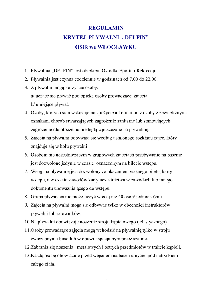 Regulamin Krytej Pływalni DELFIN