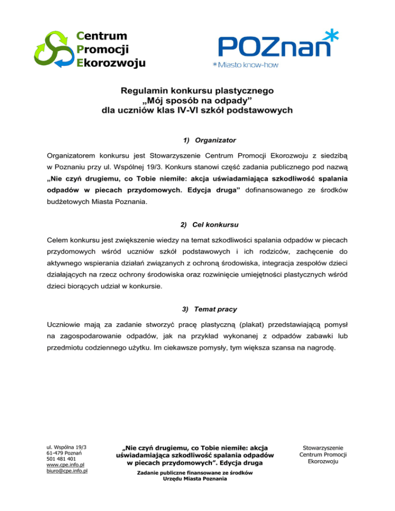 Regulamin konkursu plastycznego „Mój sposób na odpady” dla uczniów klas IV-VI szkół podstawowych 1) Organizator Organizatorem konkursu jest Stowarzyszenie Centrum Promocji Ekorozwoju z siedzibą w Poznaniu przy ul. Wspólnej 19/3. Konkurs stanowi część zadania publicznego pod nazwą „Nie czyń drugiemu, co Tobie niemiłe: akcja uświadamiająca szkodliwość spalania odpadów w piecach przydomowych. Edycja druga” dofinansowanego ze środków budżetowych Miasta Poznania. 2) Cel konkursu Celem konkursu jest zwiększenie wiedzy na temat szkodliwości spalania odpadów w piecach przydomowych wśród uczniów szkół podstawowych i ich rodziców, zachęcenie do aktywnego wspierania działań związanych z ochroną środowiska, integracja zespołów dzieci działających na rzecz ochrony środowiska oraz rozwinięcie umiejętności plastycznych wśród dzieci biorących udział w konkursie. 3) Temat pracy Uczniowie mają za zadanie stworzyć pracę plastyczną (plakat) przedstawiającą pomysł na zagospodarowanie odpadów, jak na przykład wykonanej z odpadów zabawki lub przedmiotu codziennego użytku. Im ciekawsze pomysły, tym większa szansa na nagrodę. ul. Wspólna 19/3 61-479 Poznań 501 481 401 www.cpe.info.pl [email protected] „Nie czyń drugiemu, co Tobie niemiłe: akcja uświadamiająca szkodliwość spalania odpadów w piecach przydomowych”. Edycja druga Zadanie publiczne finansowane ze środków Urzędu Miasta Poznania Stowarzyszenie Centrum Promocji Ekorozwoju 4) Uczestnicy konkursu Konkurs przeznaczony jest dla uczniów klas IV-VI poznańskich szkół podstawowych. 5) Wymogi techniczne pracy Technika pracy konkursowej: praca wykonana odręcznie przy zastosowaniu dowolnie wybranych technik plastycznych (rysowanie, malowanie, wyklejanie, wydzieranie, wycinanie, grafika itp.). Konkurs nie obejmuje prac przestrzennych. Rozmiar plakatu powinien się mieścić w zakresie od A4 do A2. 6) Termin konkursu Konkurs rozpoczyna się 24 września 2012, natomiast prace przyjmowane będą do 31 października 2012. O przyjęciu decyduje data stempla pocztowego. 7) Wymogi formalne uczestnictwa w konkursie Osoby chcące wziąć udział w konkursie mogą zgłosić więcej niż jedną własnoręcznie przygotowaną pracę. Dozwolone są zgłoszenia indywidualne lub w grupach do trzech osób. Wszyscy uczestnicy muszą wypełnić formularz zgłoszeniowy, stanowiący załącznik nr 1 do niniejszego regulaminu. ul. Wspólna 19/3 61-479 Poznań 501 481 401 www.cpe.info.pl [email protected] „Nie czyń drugiemu, co Tobie niemiłe: akcja uświadamiająca szkodliwość spalania odpadów w piecach przydomowych”. Edycja druga Zadanie publiczne finansowane ze środków Urzędu Miasta Poznania Stowarzyszenie Centrum Promocji Ekorozwoju Formularz zgłoszeniowy musi zostać podpisany przez prawomocnego opiekuna (opiekunów) uczestnika (tzn. rodziców lub opiekunów prawnych), co stanowić będzie zgodę na udział w konkursie oraz zgodę na postanowienia zawarte w niniejszym regulaminie. Dodatkowo, każda praca musi być opisana na rewersie w następujący sposób: • imię i nazwisko dziecka, • nazwa szkoły i klasa. Prace nieopisane w powyższy sposób oraz prace, do których nie dołączono podpisanego formularza zgłoszeniowego, nie będą brane pod uwagę. Zgłoszenia (pracę oraz formularz zgłoszeniowy) należy wysłać pocztą lub przesyłką kurierską na następujący adres: ul. Gostyńska 44a 60-103 Poznań z dopiskiem: Konkurs plastyczny „Mój sposób na odpady”. Możliwe jest również osobiste dostarczenie pracy w miejscu i czasie wskazanych przez organizatorów po uprzednim z nimi tego ustaleniu. W sytuacji, gdy z jednej szkoły będzie zgłaszanych więcej niż 20 prac konkursowych, organizator konkursu po wcześniejszych uzgodnieniach drogą telefoniczną lub mailową zobowiązuje się do odebrania prac ze szkoły. Prace przesłane po terminie nie będą brane pod uwagę. Organizator nie ponosi odpowiedzialności za uszkodzenia powstałe podczas przesyłki oraz terminowość dostawy prac przez Pocztę Polską lub firmę kurierską. Prace przechodzą na własność organizatora i nie będą odsyłane. 8) Wyłonienie zwycięzców Zwycięzcy konkursu wyłonieni zostaną w listopadzie 2012 r. Komisja konkursowa składająca się z członków Stowarzyszenia Centrum Promocji Ekorozwoju spośród zgłoszonych do konkursu prac wybierze trzy najlepsze. Ocenie będą podlegać: pomysł oraz kreatywność twórcy pracy, estetyka wykonania, ul. Wspólna 19/3 61-479 Poznań 501 481 401 www.cpe.info.pl [email protected] „Nie czyń drugiemu co Tobie niemiłe: akcja uświadamiająca szkodliwość spalania odpadów w piecach przydomowych. Edycja druga” Zadanie publiczne finansowane ze środków Urzędu Miasta Poznania Stowarzyszenie Centrum Promocji Ekorozwoju siła przekazu plakatu. Decyzje komisji są ostateczne oraz nieodwołalne. Zwycięzcy poinformowani będą e-mailem lub telefonicznie, zgodnie z danymi kontaktowymi podanymi na formularzu dołączonym do nadesłanej pracy. Lista zwycięzców zostanie opublikowana na stronie internetowej. Prace zostaną wystawione w dniu 11 listopada 2012 r. podczas obchodów Imienin Ulicy Święty Marcin. Tego dnia zostaną także wręczone nagrody zwycięzcom konkursu. 9) Wymogi prawne Na organizatora przechodzą autorskie prawa majątkowe do prac na następujących polach eksploatacji: a) zwielokrotnienie każdą znaną techniką, w szczególności techniką drukarską, fotograficzną, reprograficzną, cyfrową (w tym w drodze skanowania i wydruku cyfrowego), filmową itp.; b) wprowadzenie do obrotu, najem, użyczenie oryginału oraz kopii pracy; c) publiczne wystawienie oraz publiczne udostępnienie pracy. Dane osobowe uczestników będą wykorzystane wyłącznie w celu wyłonienia zwycięzcy i przyznania nagrody. Poprzez podanie danych osobowych oraz podpisanie formularza zgłoszenia uczestnik oraz jego rodzic lub opiekun (przedstawici