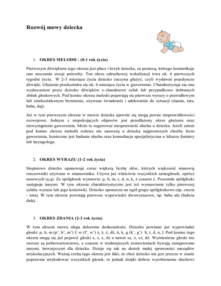 Rozwój mowy dziecka 1. OKRES MELODII - (0-1 rok życia) Pierwszym dźwiękiem tego okresu jest płacz i krzyk dziecka, za pomocą, którego komunikuje ono otoczeniu swoje potrzeby. Ten okres odruchowej wokalizacji trwa ok. 6 pierwszych tygodni życia. W 2-3 miesiącu życia dziecko zaczyna głużyć, czyli wydawać pojedyncze dźwięki. Głużenie przekształca się ok. 6 miesiąca życia w gaworzenie. Charakteryzuje się ono wydawaniem przez dziecko dźwięków o charakterze sylab lub przypadkowo dobranych zbitek głoskowych. Pod koniec okresu melodii pojawiają się pierwsze wyrazy o prawidłowym lub zniekształconym brzmieniu, używane świadomie i adekwatnie do sytuacji (mama, tata, baba, daj). Już w tym pierwszym okresie w mowie dziecka ujawnić się mogą pewne nieprawidłowości rozwojowe. Jednym z niepokojących objawów jest przedłużony okres głużenia oraz niewystąpienie gaworzenia. Może to sugerować niesprawność słuchu u dziecka. Jeżeli zatem pod koniec okresu melodii rodzice nie zauważą u dziecka najprostszych choćby form gaworzenia, konieczne jest badanie słuchu oraz konsultacja specjalistyczna u lekarza foniatry lub laryngologa. 2. OKRES WYRAZU (1-2 rok życia) Stopniowo dziecko opanowuje coraz większą liczbę słów, których większość stanowią rzeczowniki używane w mianowniku. Używa już właściwie wszystkich samogłosek, oprócz nosowych (ę,ą). Ze spółgłosek wymawia: p, b, m, t, d, n, k, ś czasem ć. Pozostałe spółgłoski zastępuje innymi. W tym okresie charakterystyczne jest też wymawianie tylko pierwszej sylaby wyrazu lub jego końcówki. Dziecko upraszcza na ogół grupy spółgłoskowe (np. ciocia - tota). W tym okresie powstają pierwsze wypowiedzi dwuwyrazowe, np. baba ała (babcia dała). 3. OKRES ZDANIA (2-3 rok życia) W tym okresie mowa ulega dalszemu doskonaleniu. Dziecko powinno już wypowiadać głoski: p, b, m (p’, b’, m’) f, w (f’, w’) ś, ź, ć, dź, ń, k, g (k’, g’) h, t, d, n, l. Pod koniec tego okresu mogą się już pojawić głoski s, z, c, dz a nawet sz, ż, cz, dż. Wymienione głoski nie zawsze są pełnowartościowe, a czasem w trudniejszych zestawieniach bywają zastępowane innymi, łatwiejszymi dla dziecka. Dzieje się tak na skutek małej sprawności narządów artykulacyjnych. Ważną cechą tego okresu jest fakt, że choć dziecko nie jest jeszcze w stanie poprawnie artykułować wszystkich głosek, to jednak dzięki dobrze wyrobionemu słuchowi fonetycznemu jest świadome, jak dana głoska powinna brzmieć i potrafi wyróżnić ją w wyrazie. W tym czasie nierzadko pojawia się w związku z tym poprawianie mowy dorosłych, którzy zwracając się do dzieci spieszczają wymowę niektórych słów. W tej fazie dziecko zaczyna posługiwać się zdaniami, które na początku składają się z 2-3 wyrazów i stopniowo stają się coraz bardziej rozbudowane, 4-5 wyrazowe. 4. OKRES SWOISTEJ MOWY DZIECIĘCEJ (3-7 rok życia) Około 3-5 roku życia pojawiają się głoski sz, ż, cz, dż. Pod koniec 4 roku życia pojawia się głoska r. Wcześniej dziecko pomijało ją lub zastępowało inną j lub l. Zasób słownictwa systematycznie wzbogaca się, dziecko mówi już płynnymi zdaniami. Zazwyczaj ok. 5-6 roku życia dziecko wymawia już poprawnie wszystkie głoski.