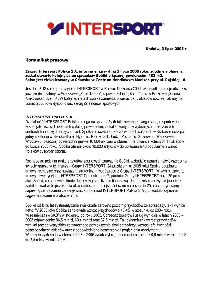 Kraków, 3 lipca 2006 r. Komunikat prasowy Zarząd Intersport Polska S.A. informuje, że w dniu 1 lipca 2006 roku, zgodnie z planem, został otwarty kolejny salon sprzedaży Spółki o łącznej powierzchni 452 m2. Salon jest zlokalizowany w Gdańsku w Centrum Handlowym Madison przy ul. Rajskiej 10. Jest to już 12 salon pod szyldem INTERSPORT w Polsce. Do końca 2006 roku spółka planuje otworzyć jeszcze dwa salony: w Warszawie „Złote Tarasy”, o powierzchni 1,077 m2 oraz w Krakowie „Galeria Krakowska”, 869 m2 . W kolejnych latach spółka zamierza otwierać ok. 5 sklepów rocznie, tak aby na koniec 2008 roku dysponować siecią 22 salonów sportowych. INTERSPORT Polska S.A. Działalność INTERSPORT Polska polega na sprzedaży detalicznej markowego sprzętu sportowego w specjalistycznych sklepach o dużej powierzchni, zlokalizowanych w wybranych, prestiżowych centrach handlowych dużych miast. Spółka prowadzi sprzedaż w trzech salonach w Krakowie oraz po jednym salonie w Bielsku-Białej, Bytomiu, Katowicach, Łodzi, Poznaniu, Sosnowcu, Warszawie i Wrocławiu, o łącznej powierzchni prawie 10.000 m2, zaś w planach ma otwarcie kolejnych 11 sklepów do końca 2008 roku. Spółka oferuje około 10.000 artykułów do uprawiania 40 popularnych wśród Polaków dyscyplin sportu. Rosnące na polskim rynku artykułów sportowych znaczenie Spółki, wzbudziło uznanie największego na świecie gracza w tej branży – Grupy INTERSPORT. 24 października 2005 roku Spółka podpisała umowy licencyjne oraz nawiązała strategiczną współpracę z Grupą INTERSPORT. W wyniku zawartej umowy inwestycyjnej, INTERSPORT Deutschland eG, podmiot Grupy IINTERSPORT objął 25 proc. akcji Spółki, co zapewniło firmie dodatkową stabilizację finansową. Jednocześnie nowy akcjonariusz zadeklarował wolę pozostania akcjonariuszem mniejszościowym na poziomie 25 proc., a tym samym zapewnił, że nie zamierza zwiększać kontroli nad INTERSPORT Polska S.A., co zostało zapisane i zagwarantowane w statucie firmy. Spółka od kilku lat systematycznie zwiększała zarówno poziom przychodów ze sprzedaży, jak i wyniku netto. W 2005 roku Spółka zanotowała wzrost przychodów o 43,4% w stosunku do 2004 roku, wcześniej zaś o 60,8% w stosunku do roku 2003. Sprzedaż towarów i usług wyniosła w latach 2005 – 2003 odpowiednio: 86,5 mln zł, 60,4 mln zł oraz 37,6 mln zł. Tak dynamiczny wzrost przychodów wynikał przede wszystkim ze znacznego powiększenia sieci sprzedaży, wzrostu efektywności poszczególnych sklepów oraz z odpowiedniego poszerzenia i pogłębienia asortymentu. W efekcie zysk netto w okresie 2003 – 2005 zwiększył się ponad czterokrotnie z 0,6 mln zł w roku 2003 do 2,5 mln zł w roku 2005. Dodatkowych informacji udzielają: Relacje inwestorskie Agnieszka Wąsik Dyrektor Marketingu i PR INTERSPORT Polska S.A. Tel. (012) 258 84 09, 602 615 731 E-mail: [email protected] Mirosław Gruca Dyrektor Pionu Relacji Inwestorskich Agencja Informacyjna PENETRATOR Sp. z o.o. Tel. (012) 429 47 77, 602 721 204 E-mail: [email protected]