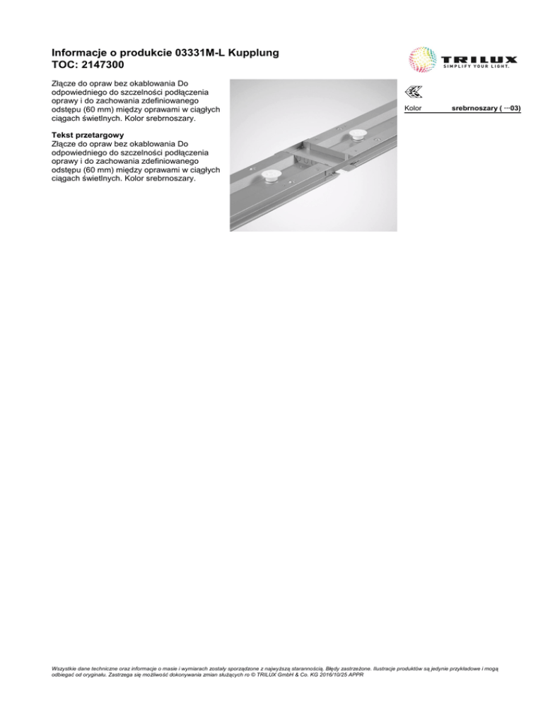 Informacje o produkcie 03331M-L Kupplung TOC: 2147300 Złącze do opraw bez okablowania Do odpowiedniego do szczelności podłączenia oprawy i do zachowania zdefiniowanego odstępu (60 mm) między oprawami w ciągłych ciągach świetlnych. Kolor srebrnoszary. Kolor srebrnoszary ( ···03) Tekst przetargowy Złącze do opraw bez okablowania Do odpowiedniego do szczelności podłączenia oprawy i do zachowania zdefiniowanego odstępu (60 mm) między oprawami w ciągłych ciągach świetlnych. Kolor srebrnoszary. Wszystkie dane techniczne oraz informacje o masie i wymiarach zostały sporządzone z najwyższą starannością. Błędy zastrzeżone. Ilustracje produktów są jedynie przykładowe i mogą odbiegać od oryginału. Zastrzega się możliwość dokonywania zmian służących ro © TRILUX GmbH & Co. KG 2016/10/25 APPR