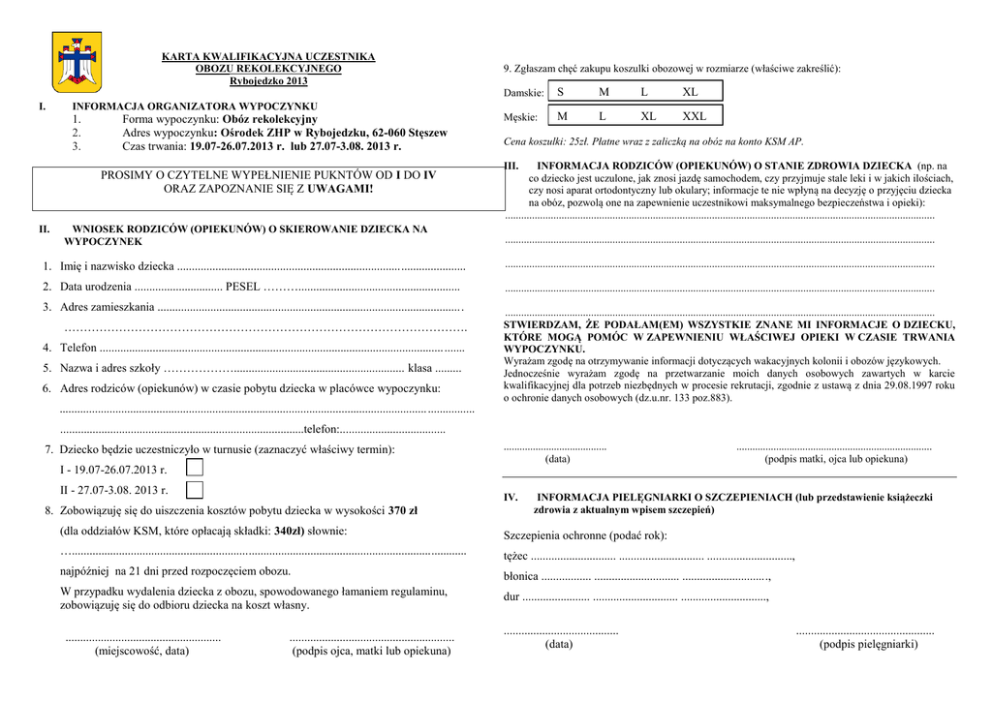 KARTA KWALIFIKACYJNA UCZESTNIKA OBOZU REKOLEKCYJNEGO Rybojedzko 2013 I. INFORMACJA ORGANIZATORA WYPOCZYNKU 1. 2. 3. Forma wypoczynku: Obóz rekolekcyjny Adres wypoczynku: Ośrodek ZHP w Rybojedzku, 62-060 Stęszew Czas trwania: 19.07-26.07.2013 r. lub 27.07-3.08. 2013 r. PROSIMY O CZYTELNE WYPEŁNIENIE PUKNTÓW OD I DO IV ORAZ ZAPOZNANIE SIĘ Z UWAGAMI! II. WNIOSEK RODZICÓW (OPIEKUNÓW) O SKIEROWANIE DZIECKA NA WYPOCZYNEK 9. Zgłaszam chęć zakupu koszulki obozowej w rozmiarze (właściwe zakreślić): Damskie: S M L XL Męskie: M L XL XXL Cena koszulki: 25zł. Płatne wraz z zaliczką na obóz na konto KSM AP. INFORMACJA RODZICÓW (OPIEKUNÓW) O STANIE ZDROWIA DZIECKA (np. na co dziecko jest uczulone, jak znosi jazdę samochodem, czy przyjmuje stale leki i w jakich ilościach, czy nosi aparat ortodontyczny lub okulary; informacje te nie wpłyną na decyzję o przyjęciu dziecka na obóz, pozwolą one na zapewnienie uczestnikowi maksymalnego bezpieczeństwa i opieki): ................................................................................................................................................................ III. ................................................................................................................................................................ 1. Imię i nazwisko dziecka .................................................................................................. ................................................................................................................................................................ 2. Data urodzenia .............................. PESEL ………....................................................... ................................................................................................................................................................ 3. Adres zamieszkania ....................................................................................................... . …………………………………………………………………………………………. 4. Telefon ............................................................................................................................ 5. Nazwa i adres szkoły ……………….......................................................... klasa ......... 6. Adres rodziców (opiekunów) w czasie pobytu dziecka w placówce wypoczynku: ................................................................................................................................................................ STWIERDZAM, ŻE PODAŁAM(EM) WSZYSTKIE ZNANE MI INFORMACJE O DZIECKU, KTÓRE MOGĄ POMÓC W ZAPEWNIENIU WŁAŚCIWEJ OPIEKI W CZASIE TRWANIA WYPOCZYNKU. Wyrażam zgodę na otrzymywanie informacji dotyczących wakacyjnych kolonii i obozów językowych. Jednocześnie wyrażam zgodę na przetwarzanie moich danych osobowych zawartych w karcie kwalifikacyjnej dla potrzeb niezbędnych w procesie rekrutacji, zgodnie z ustawą z dnia 29.08.1997 roku o ochronie danych osobowych (dz.u.nr. 133 poz.883). ............................................................................................................................. ................ ...................................................................................telefon:.................................... 7. Dziecko będzie uczestniczyło w turnusie (zaznaczyć właściwy termin): ....................................... (data) .......................................................................... (podpis matki, ojca lub opiekuna) I - 19.07-26.07.2013 r. II - 27.07-3.08. 2013 r. IV. 8. Zobowiązuję się do uiszczenia kosztów pobytu dziecka w wysokości 370 zł INFORMACJA PIELĘGNIARKI O SZCZEPIENIACH (lub przedstawienie książeczki zdrowia z aktualnym wpisem szczepień) (dla oddziałów KSM, które opłacają składki: 340zł) słownie: Szczepienia ochronne (podać rok): …...................................................................................................................................... tężec ............................. ............................. ............................., najpóźniej na 21 dni przed rozpoczęciem obozu. błonica ................. ............................. ............................., W przypadku wydalenia dziecka z obozu, spowodowanego łamaniem regulaminu, zobowiązuję się do odbioru dziecka na koszt własny. dur ....................... ............................. ............................., ..................................................... (miejscowość, data) ........................................................ (podpis ojca, matki lub opiekuna) ....................................... (data) ............................................... (podpis pielęgniarki) V. INFORMACJA WYCHOWAWCY KLASY O DZIECKU (w przypadku braku możliwości uzyskania opinii wychowawcy klasy wypełnia rodzic lub opiekun) VIII. INFORMACJA O STANIE ZDROWIA W CZASIE TRWANIA WYPOCZYNKU (dane o zachowaniach, urazach, leczeniu itp.) ........................................................................................................................................ ........ ....................................................... (pieczęć szkoły) ................................................................................................................................................ ................................................................................................................................................ ................................................................................................................................................ Organizator informuje rodziców o leczeniu ambulatoryjnym lub hospitalizacji dziecka ................................................................................................................................................ .............................